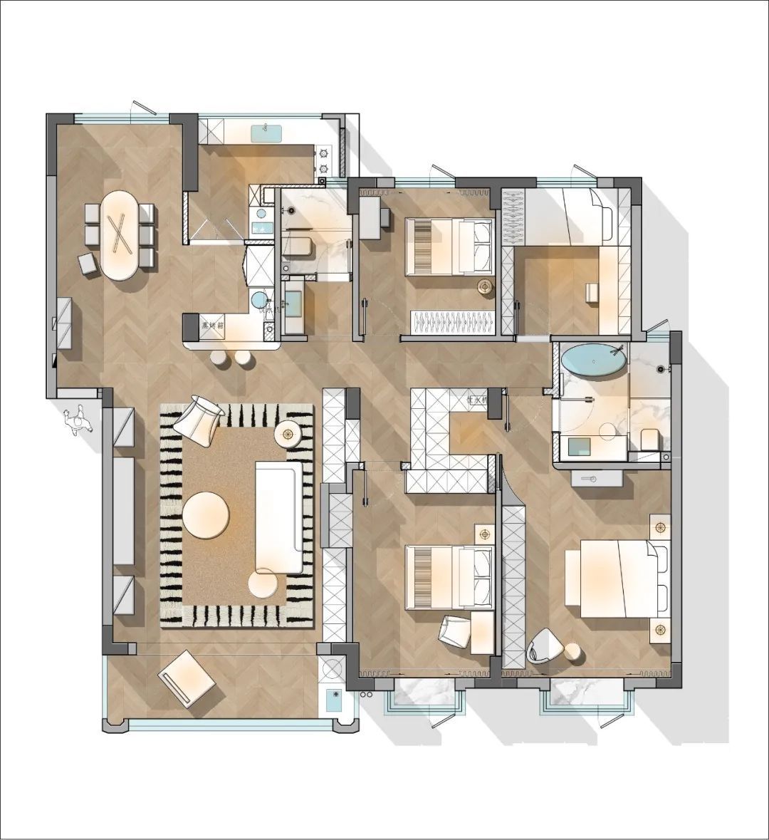 ①整体功能区规划:客餐厨、餐吧、以及四个卧室。
