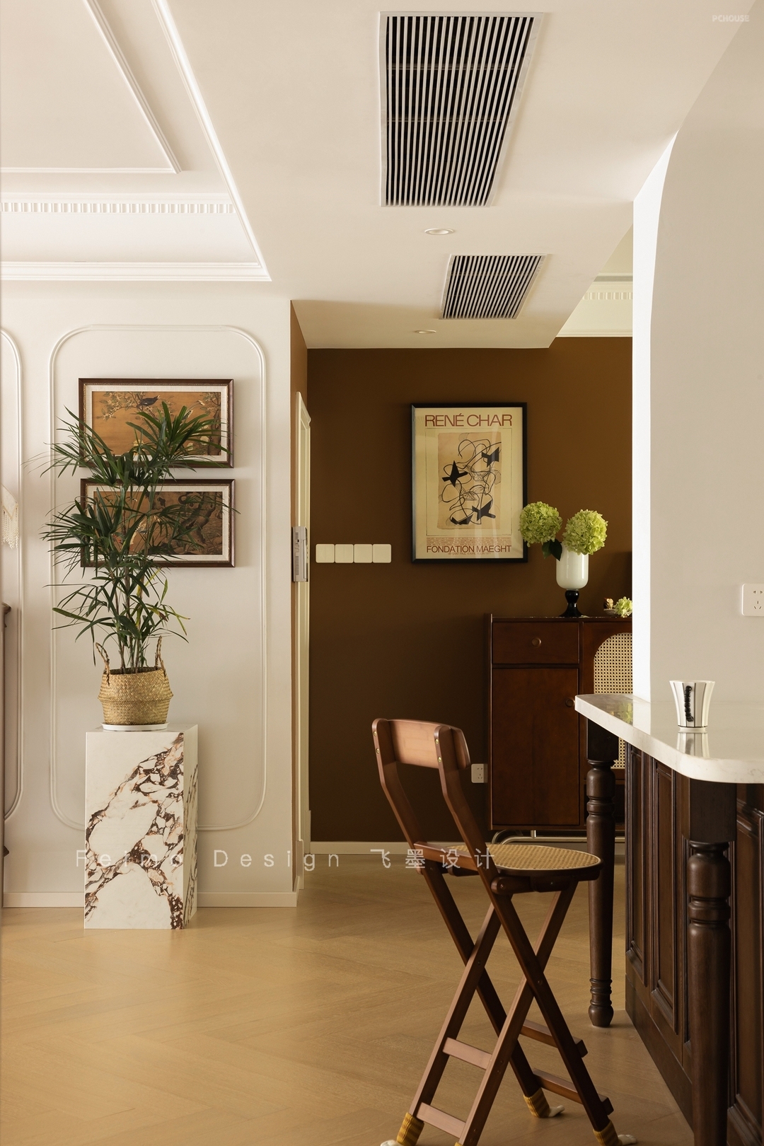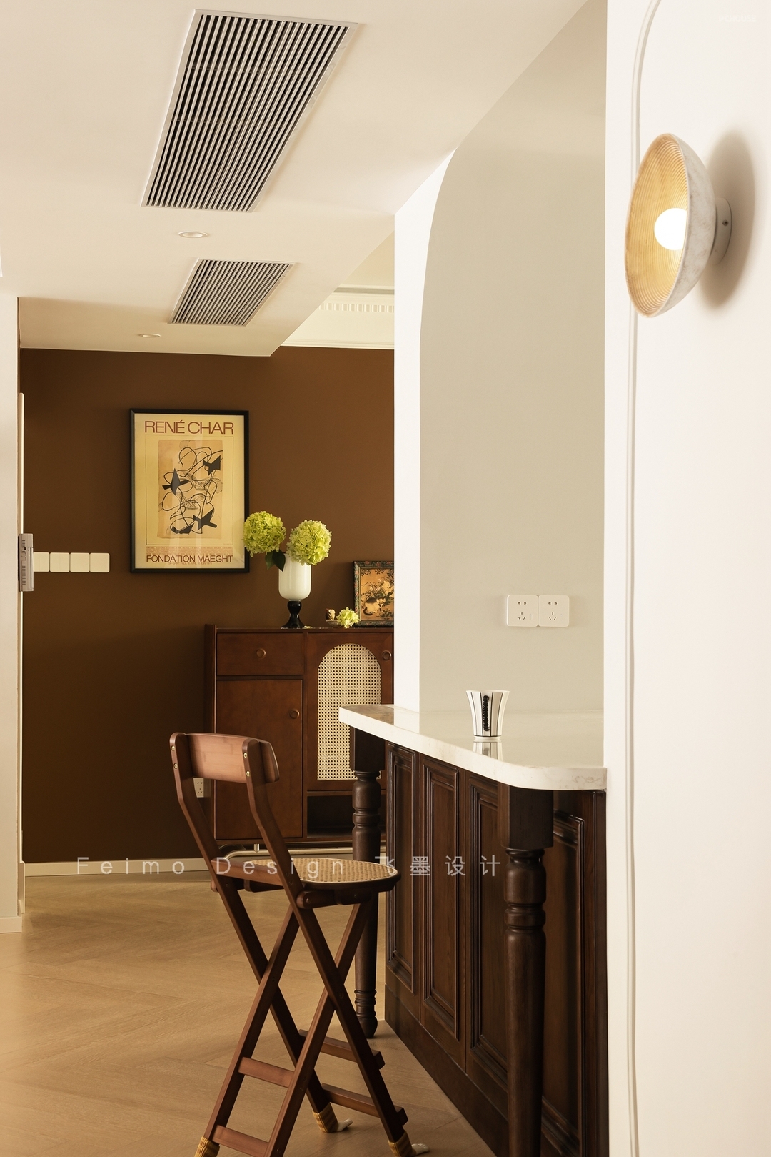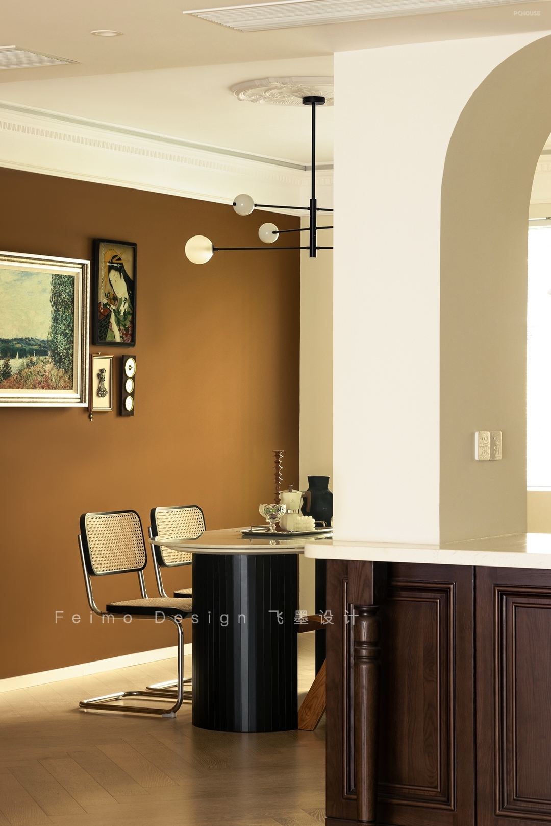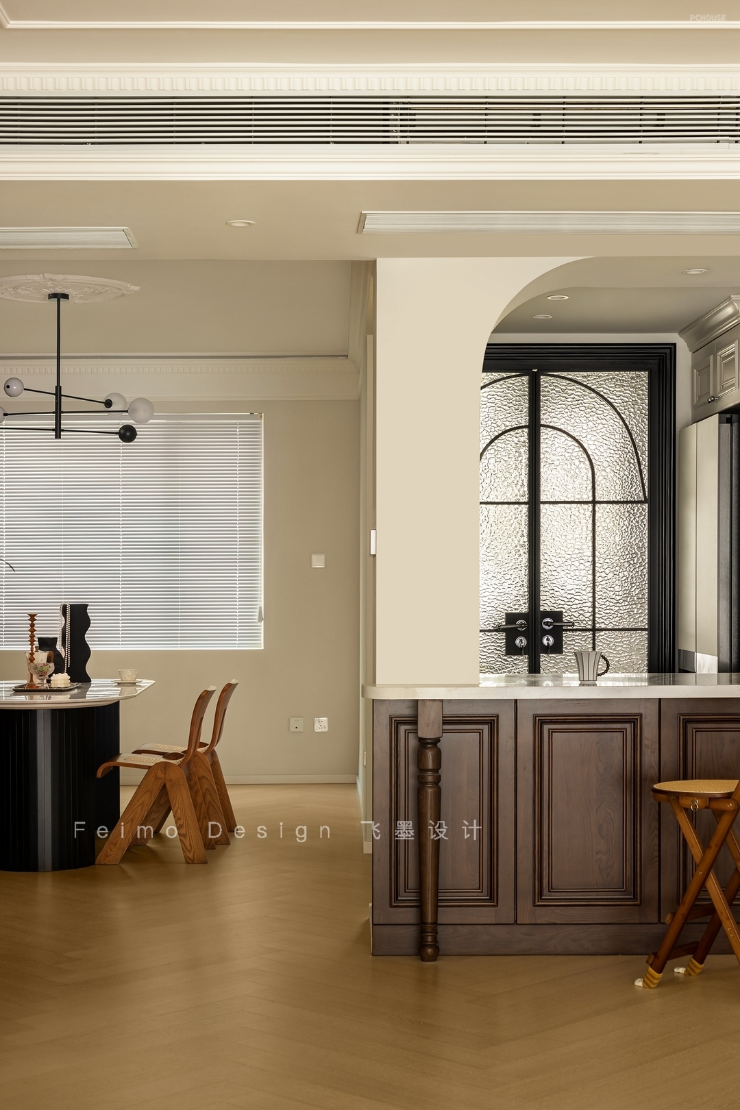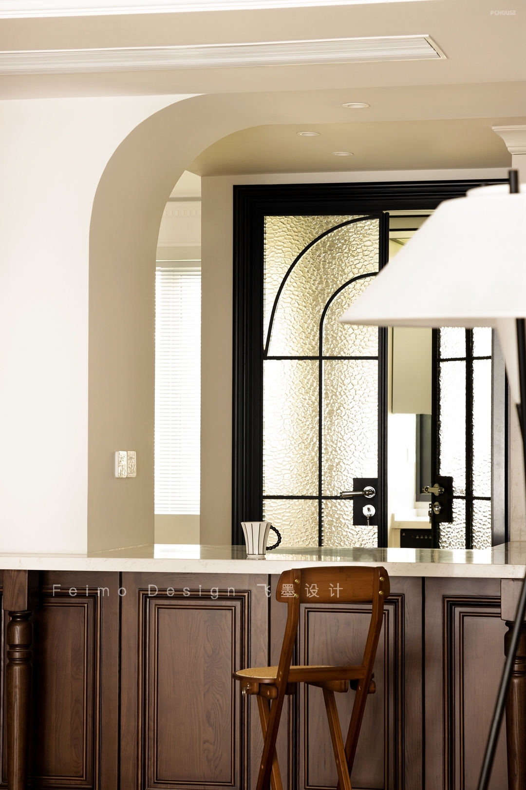 除了中规中矩的功能外,业主夫妻希望空间还有西厨,增加家居的交流互动。将餐厨的空间重新整合,于厨房门前增加西厨餐吧区,复古胡桃木与石材交叠,不能拆除的承重柱规划拱形窗洞,增加居住仪式感。