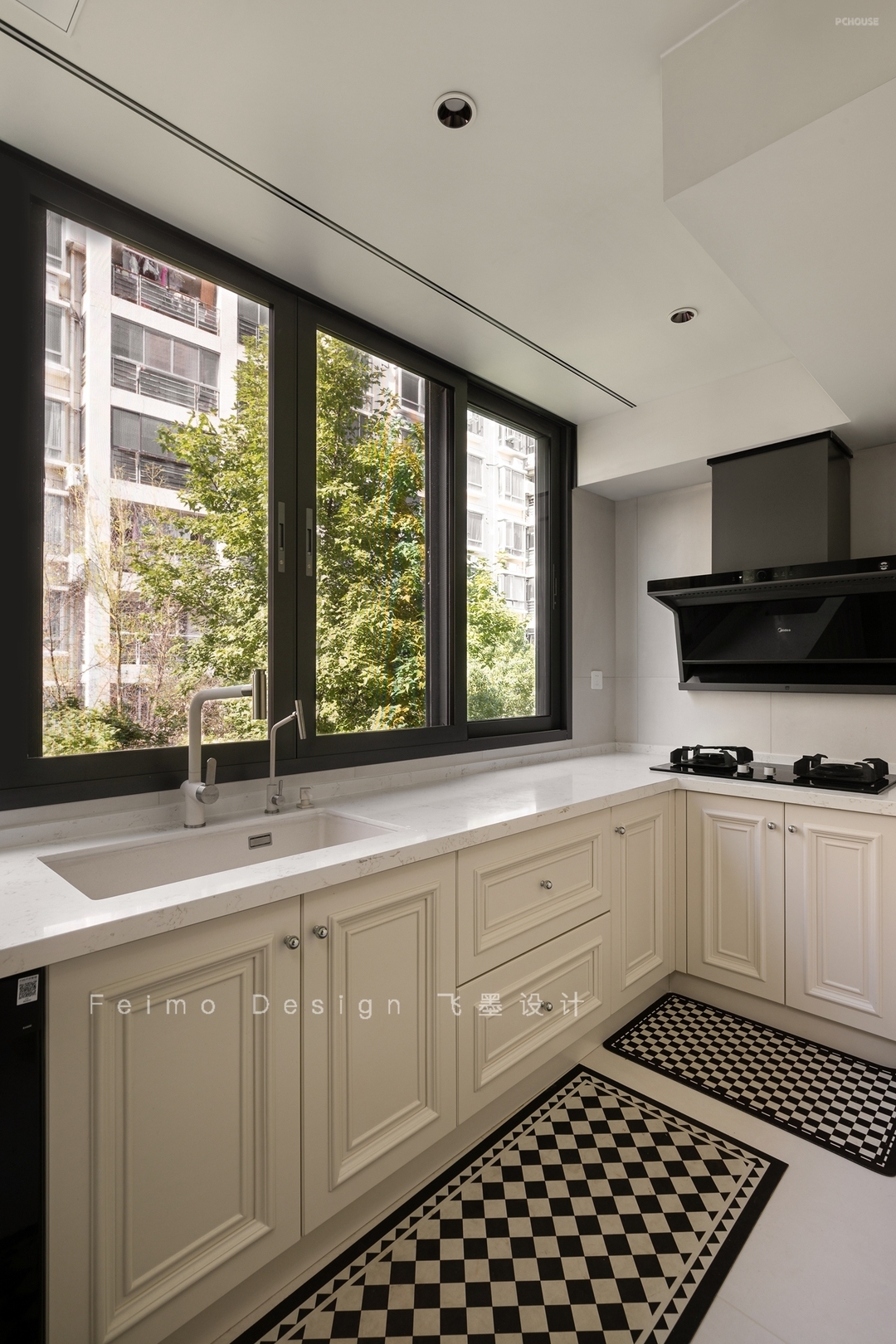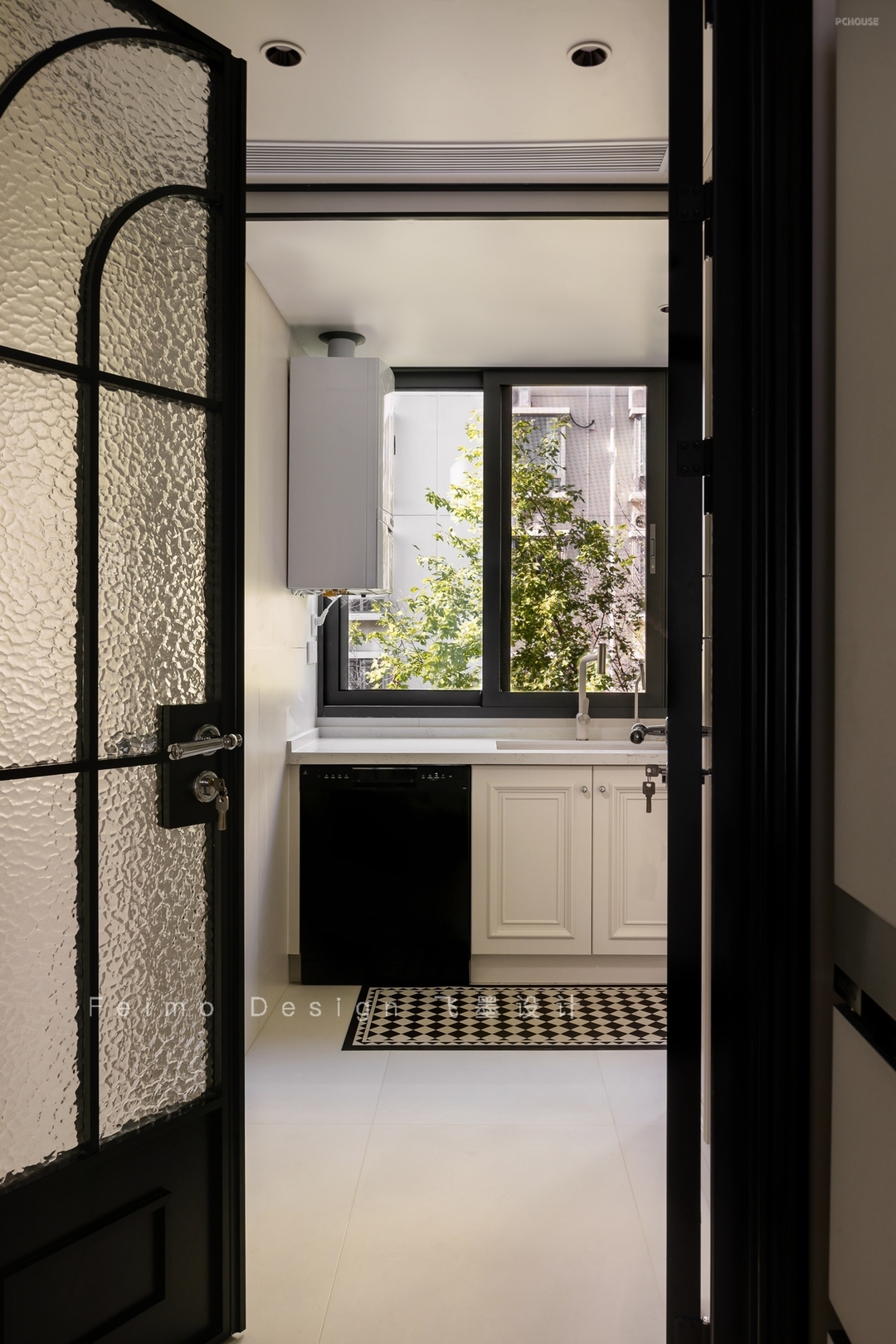用黑框与水波纹玻璃的双开门做隔断,内部定制符合人体工学的橱柜,厨房面积不大不小,刚好够生活。