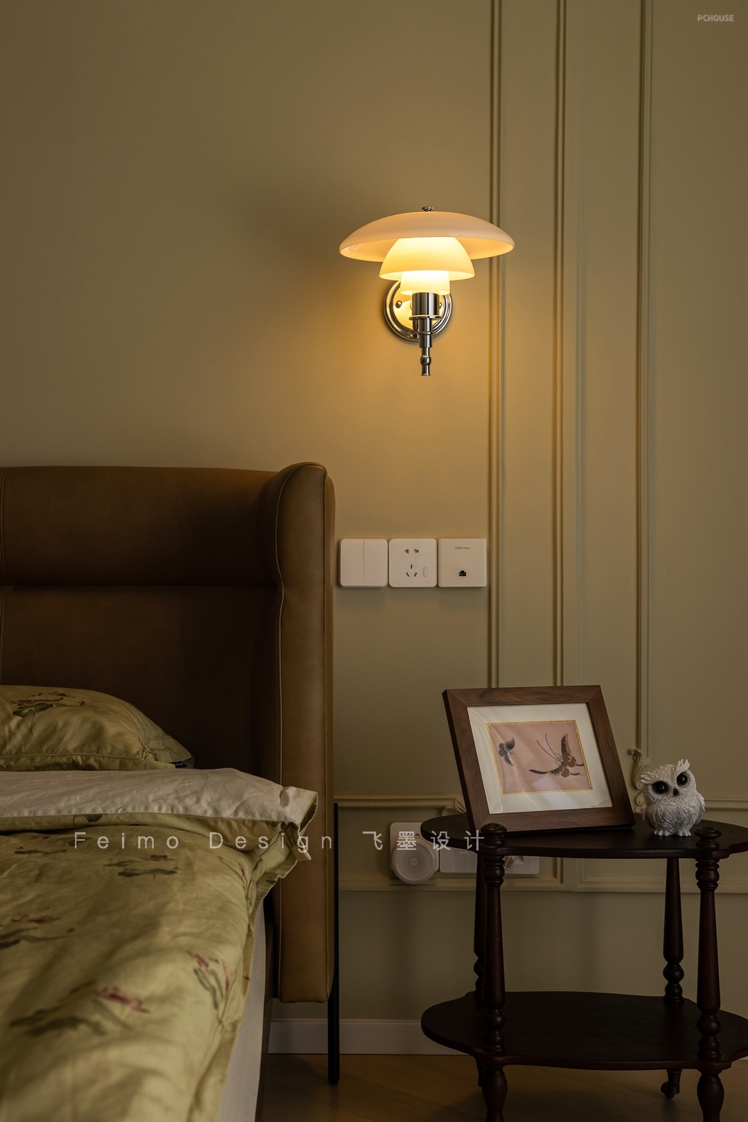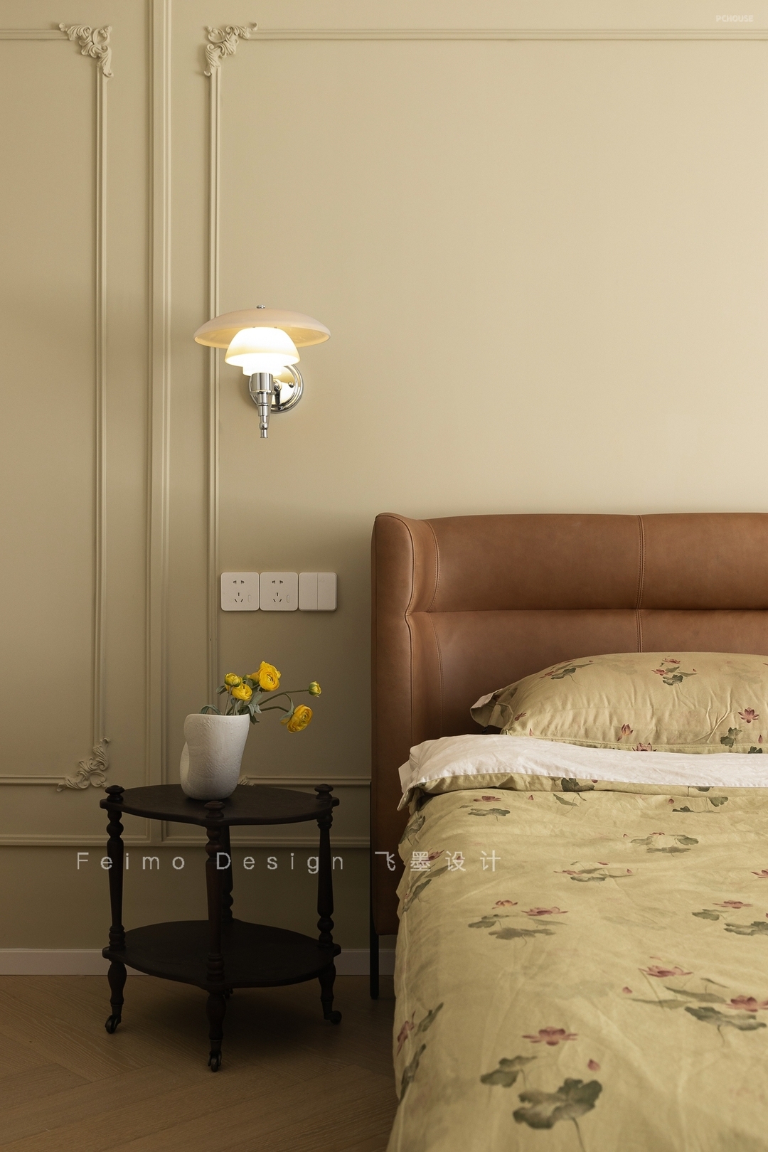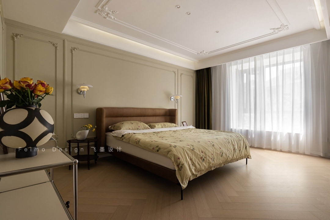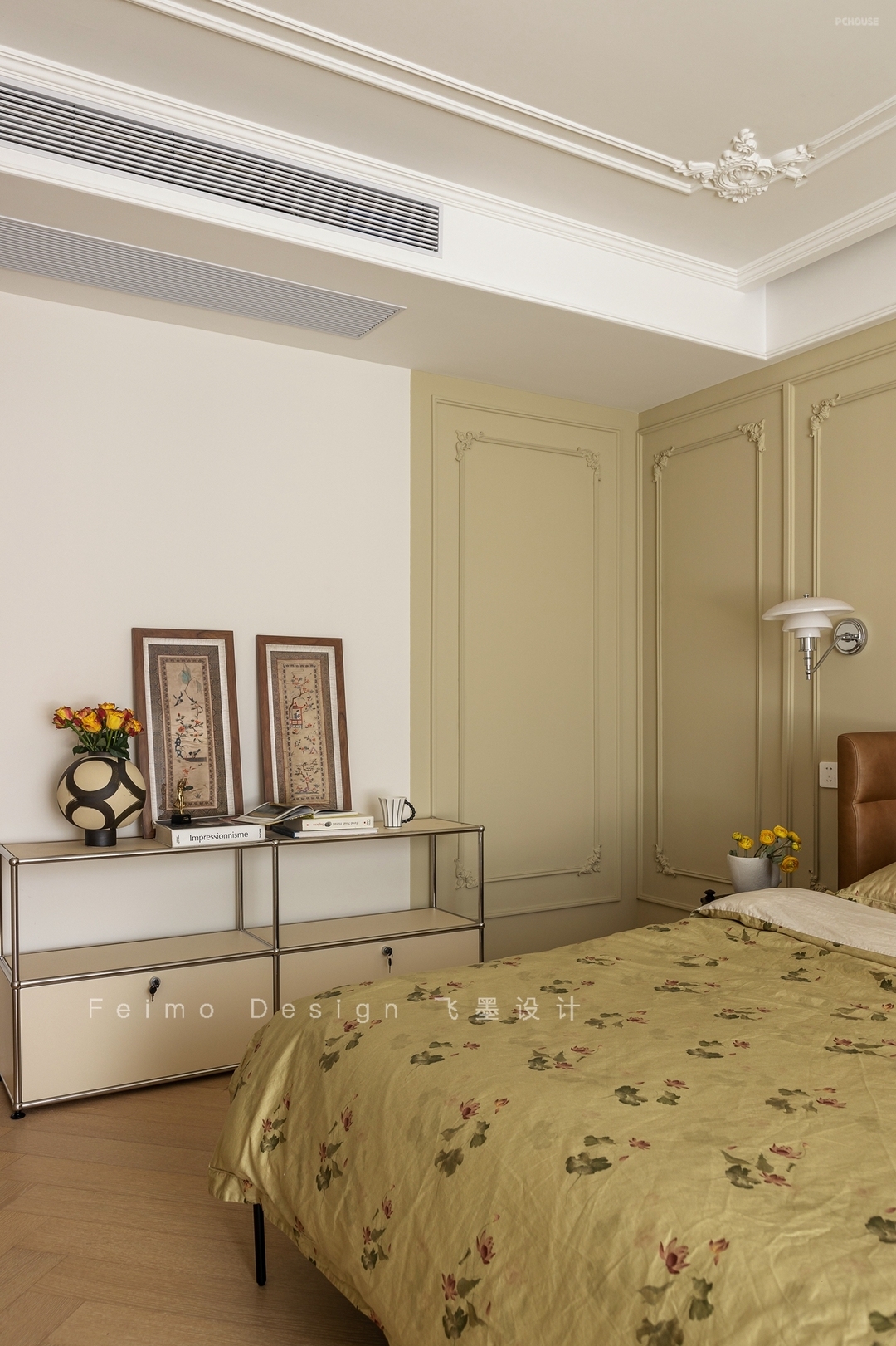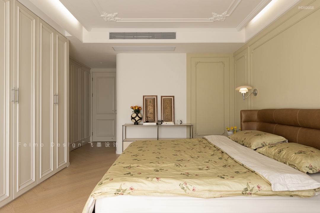 向内探索,卧室的主色调选择豆绿色,与石膏线、大白墙搭配设计分色墙;让家居的设计不是单一的;床尾一整排衣柜,完善家居收纳美学。