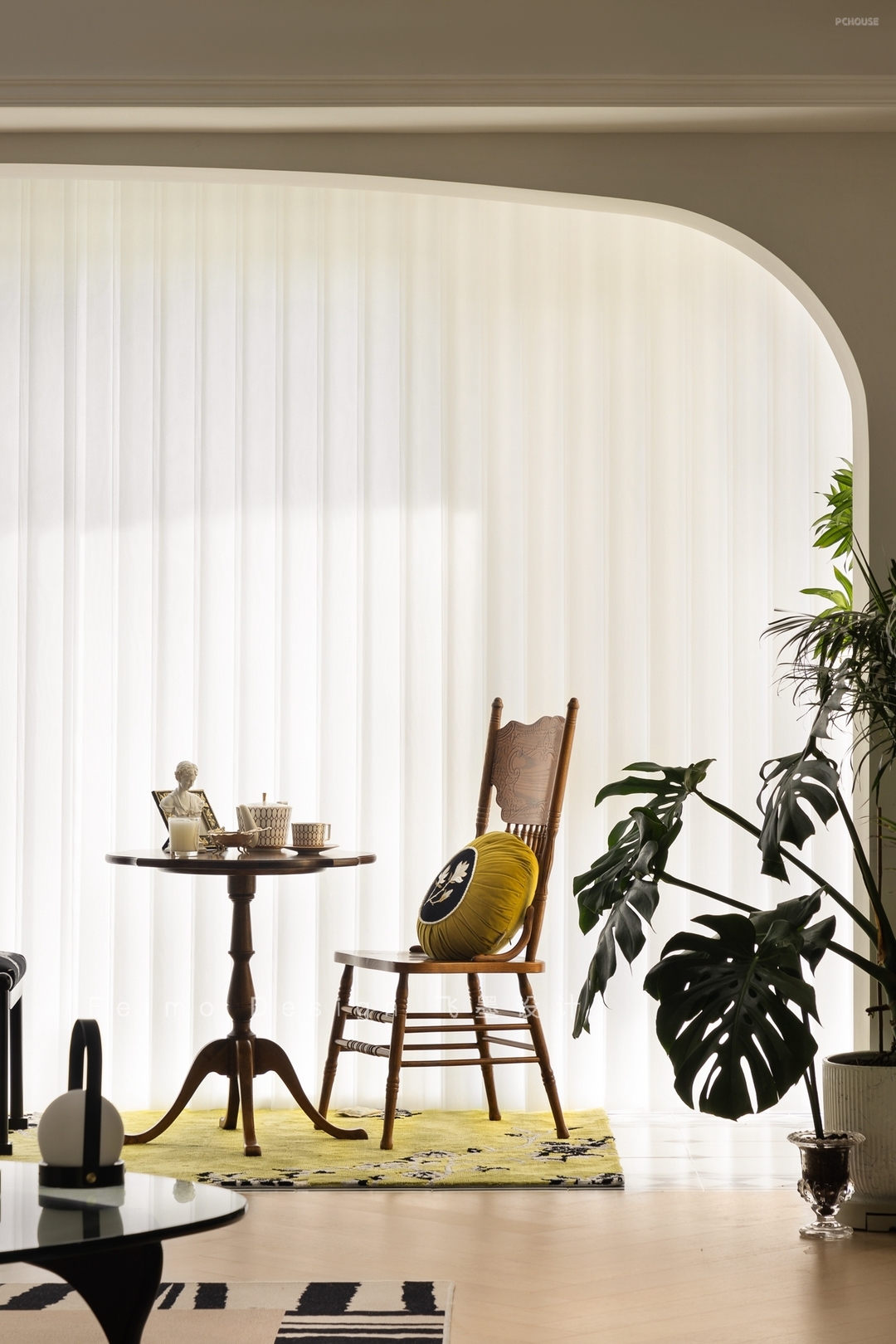 电视墙没有选择传统的石膏线搭配角花,而是选择圆润的PU线,让家居除了精致还不失可爱;与阳台之间则用拱形门做隔断,拓宽空间的界限,也让功能各自独立。