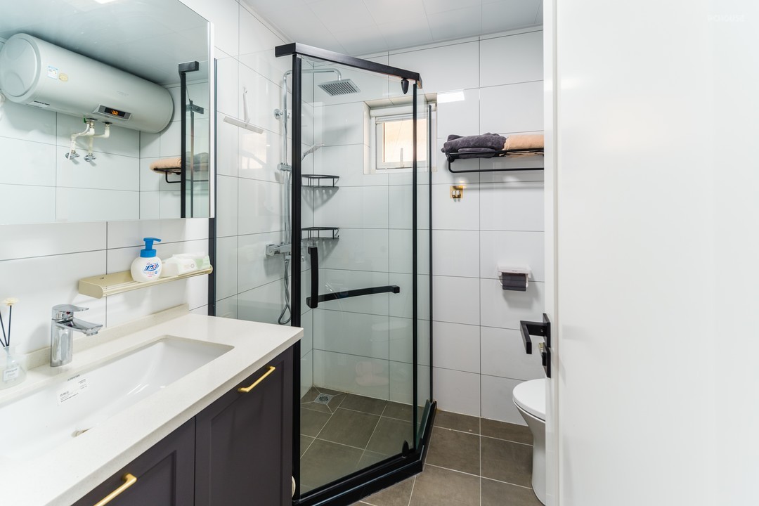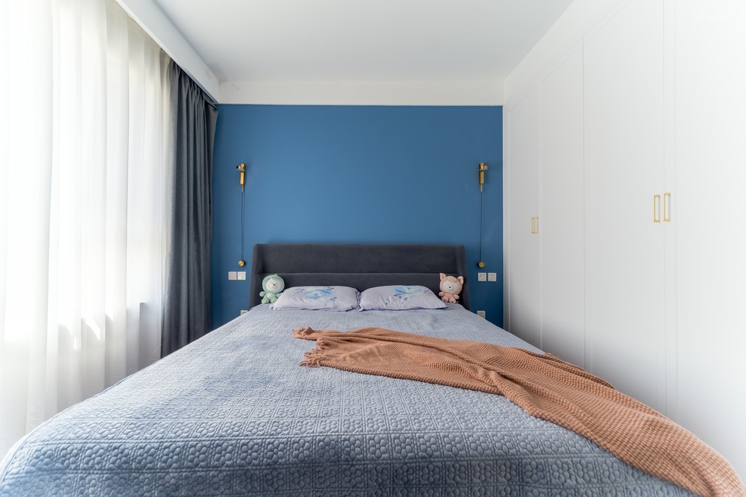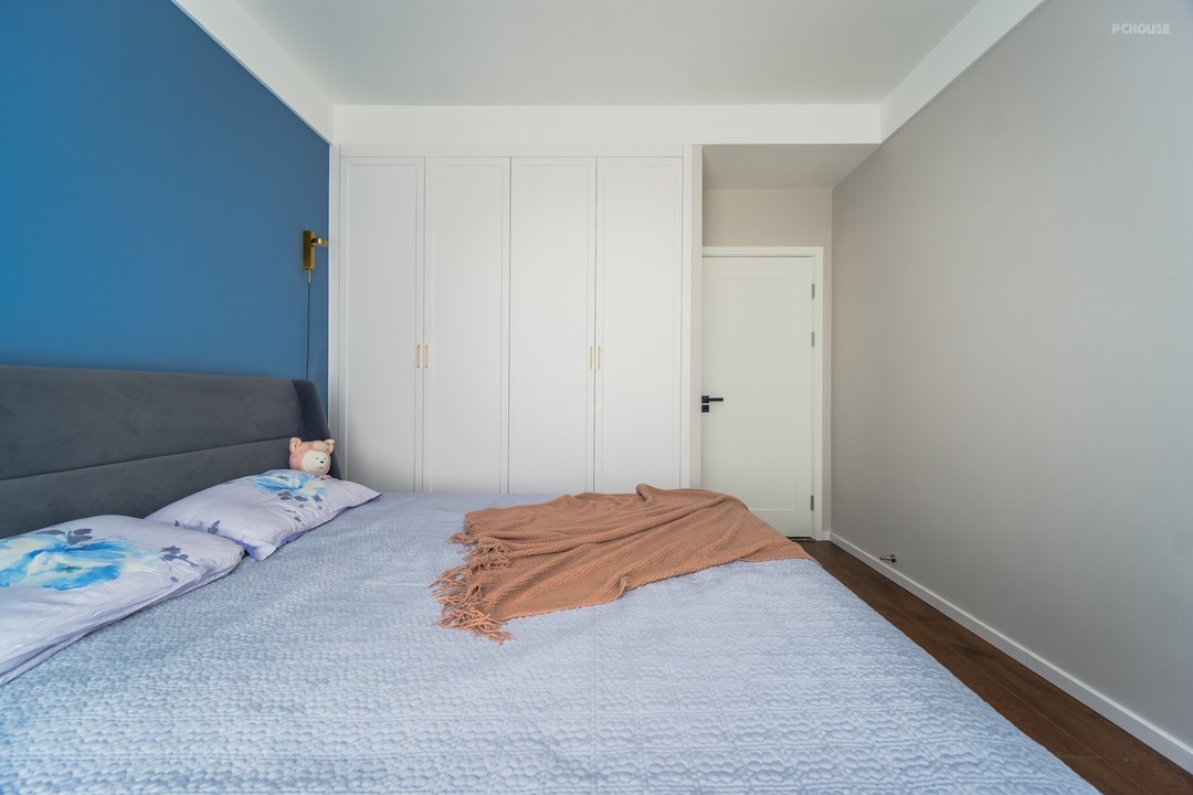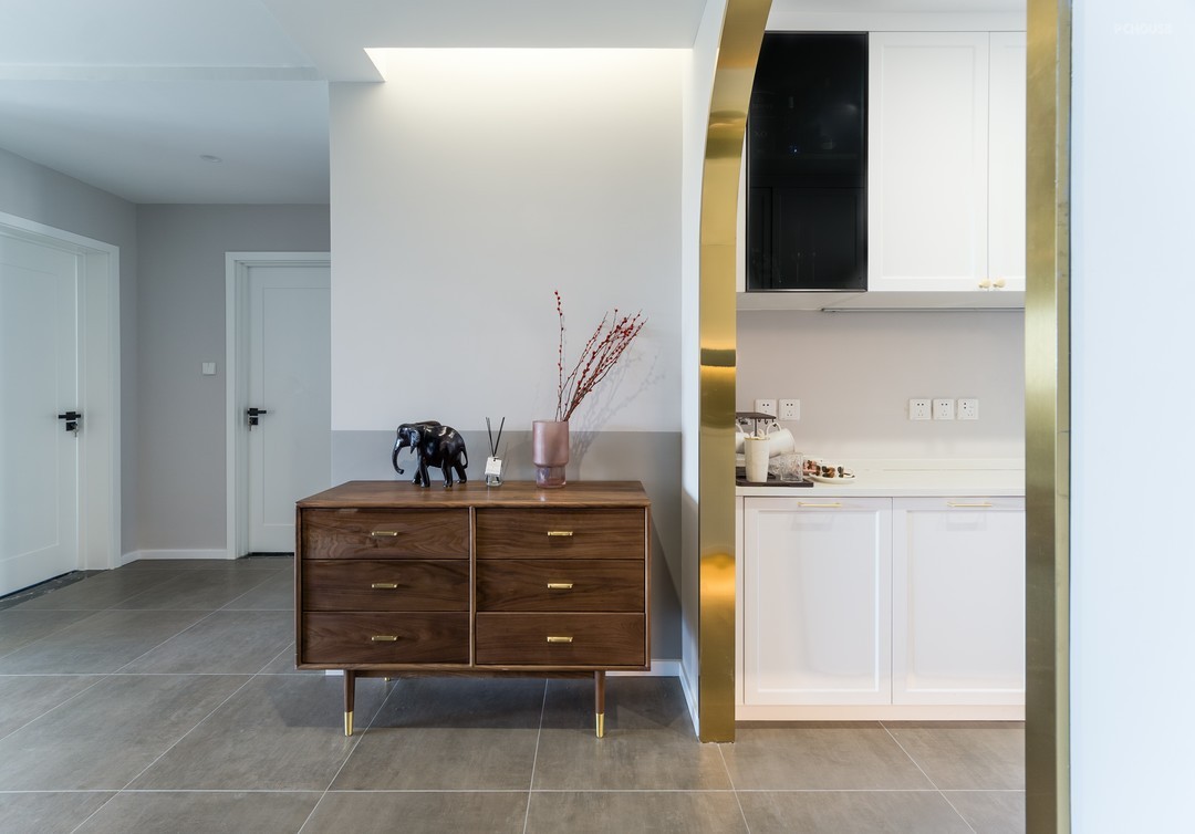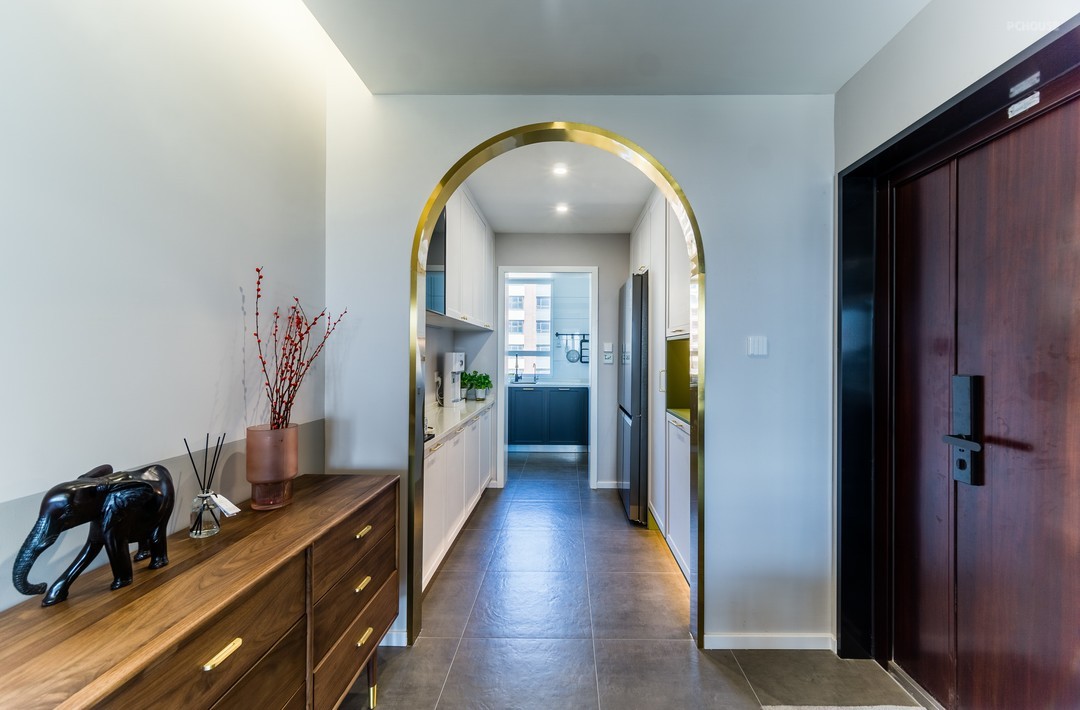 本案痛点解决方式:将进门左手边过道改造成餐厅,将原餐厅通过不锈钢拱形口分成2部分,正对门1.5米位置改造成独立玄关,将厨房门位置进行了右侧挪位,剩余2.1米位置做成西餐厨,一面备餐台+管线机,女主可以在这个位置进行美味的西式早点制作。一面内嵌双门大冰箱+整体衣帽柜,放鞋,放包包,挂衣服一应俱全。