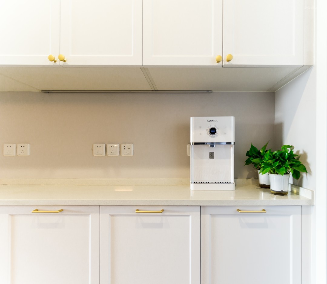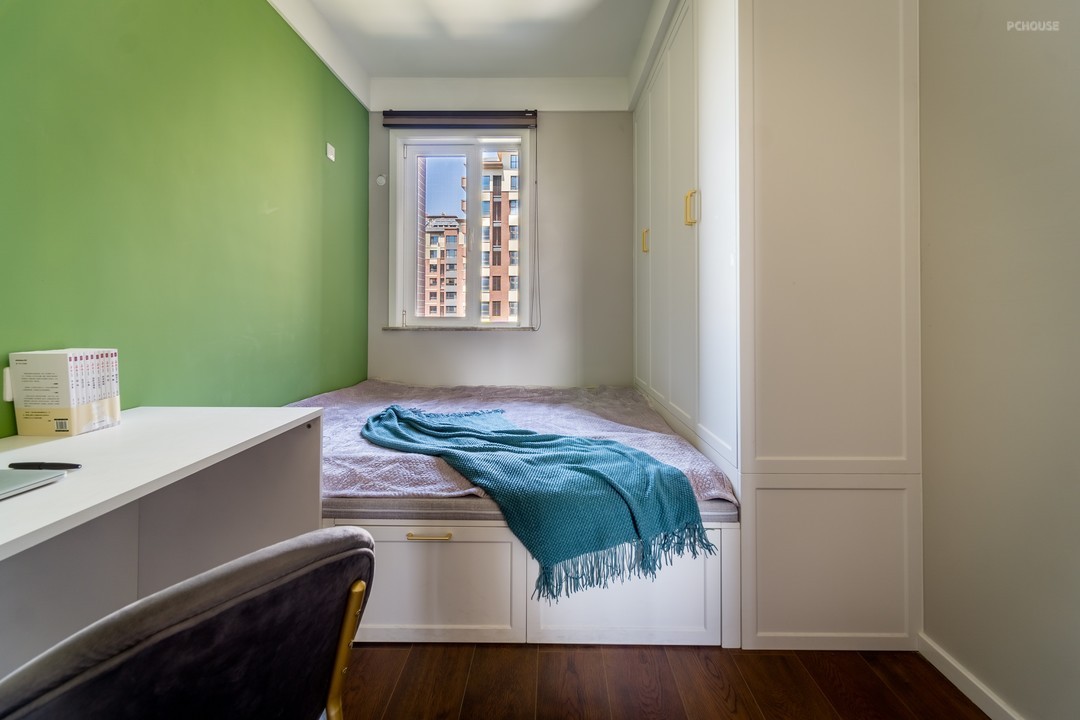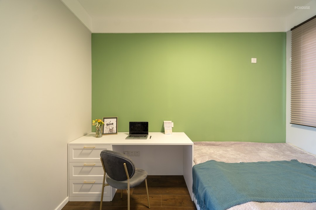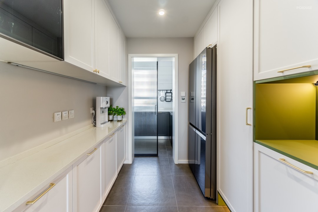 整个西厨的定制家具由白色肤感膜点缀绿色烤漆开放格组合而成