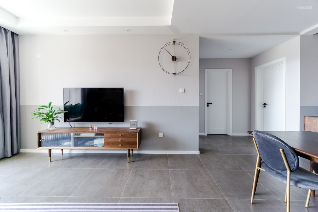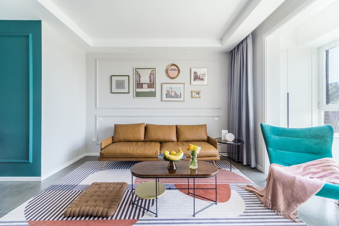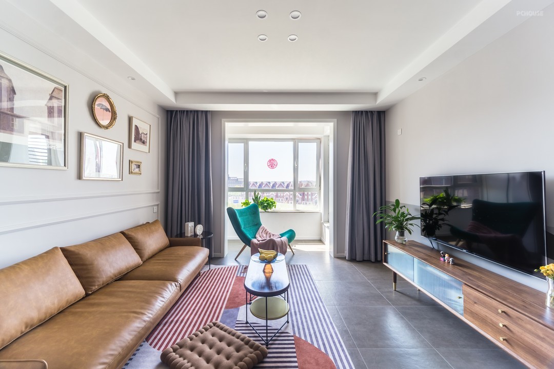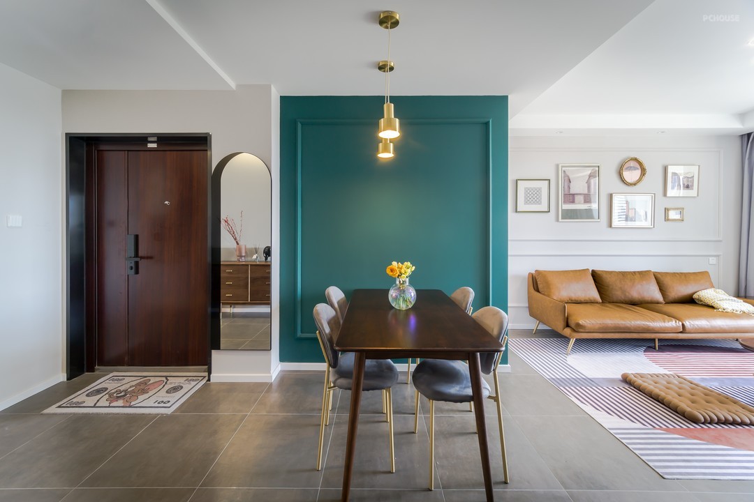 前言: 这是一对刚结婚不久的年轻小两口,男主银行工作人员,地道的天津人,女主大学老师,温柔漂亮的青岛姑娘,喜欢年轻时尚的复古风,在平面布局上因为是2居室所以除主卧外,我们将次卧设计成多功能房,平时就是书房游戏室衣帽间茶室,父母过来也可以小住,将来也可以作为儿童房使用。在整体设计上运用了水泥灰的地砖+胡桃木的地板,无主灯的客厅顶,点缀墨绿色的餐厅墙+墨绿色的单椅,配上焦糖色的麦瑟尔夫人真皮沙发,时尚复古感满满。