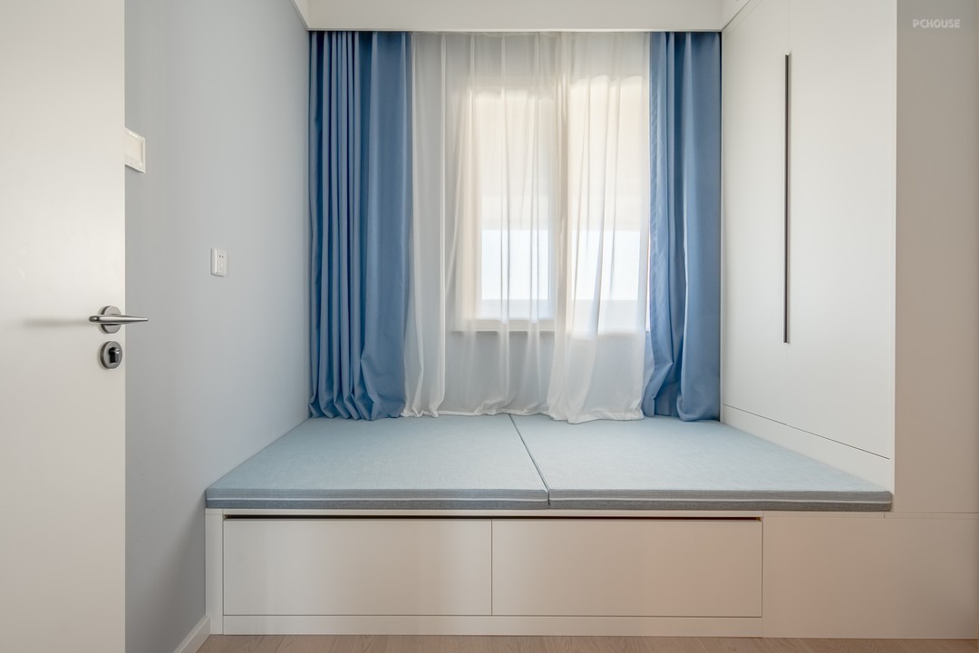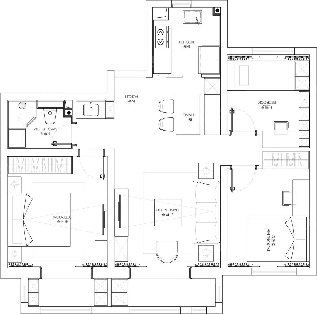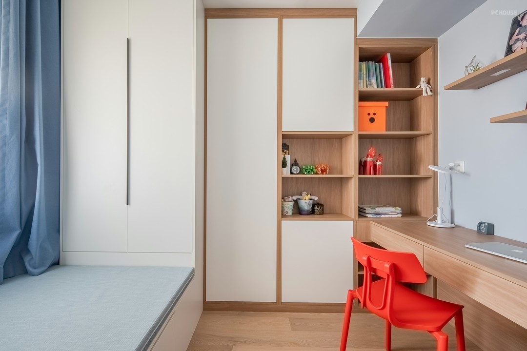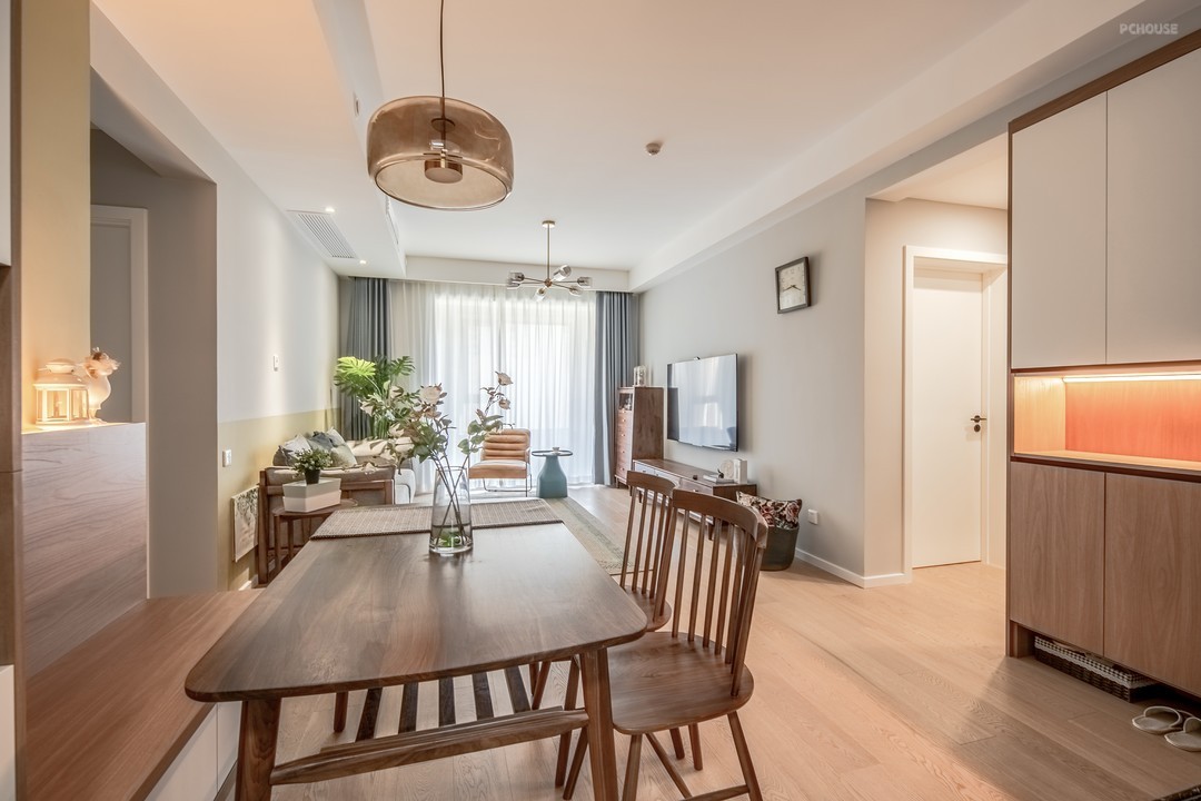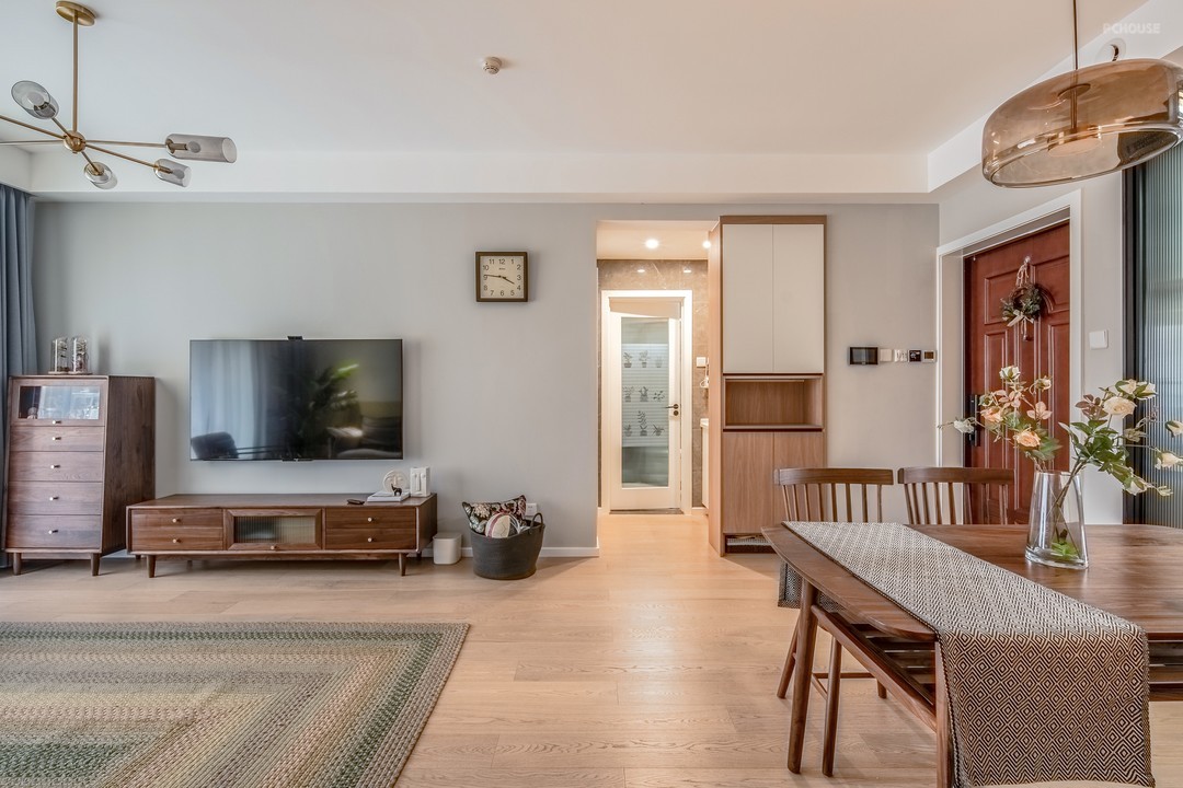 本案痛点解决方式:打掉原户型干湿分离的墙面,借助原有墙体厚度做了独立的入户鞋柜,解决换鞋问题。打掉一半原有厨房墙面,通过三连挂推拉门的使用增加厨房入户的空间和通透性。餐厅通过卡座的设计解决收纳问题的同时最大限度的释放的餐厅空间,让用餐不在拥挤,同时也将地暖分配器的位置很好隐藏。隔开客厅和卧室阳台增加三个储物柜,收纳容量巨大。