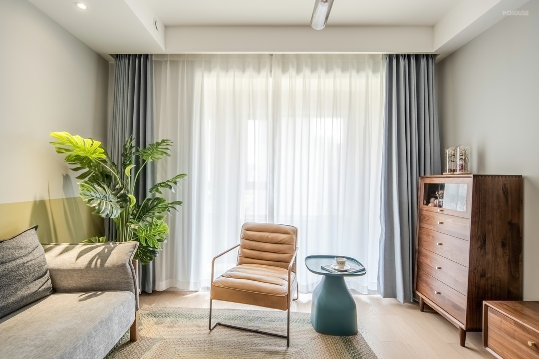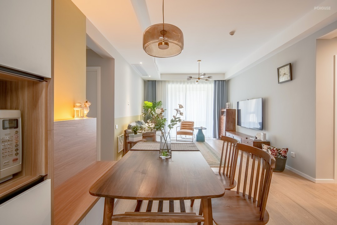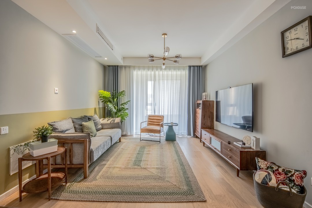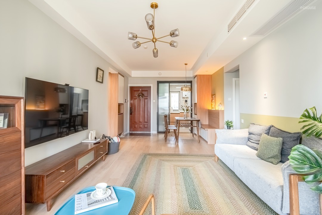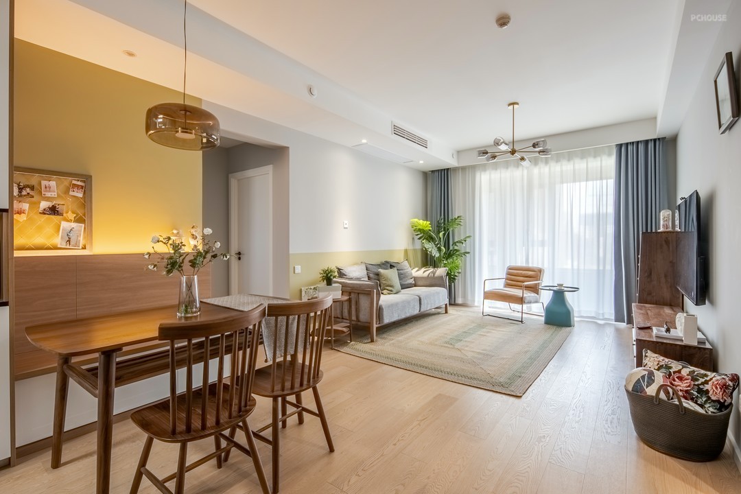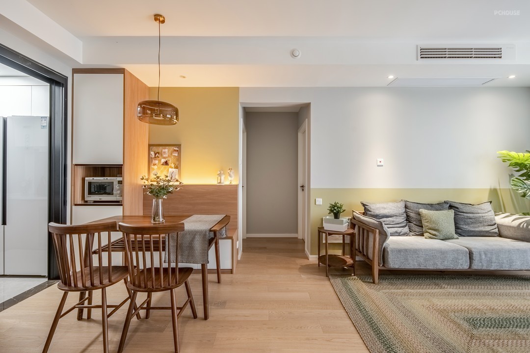 客厅没有复杂的吊顶,吊顶的处理都是根据中央空调新风处理的必要吊顶。豆青色的沙发和餐厅墙给这个暖暖的家增添了一份春意。
