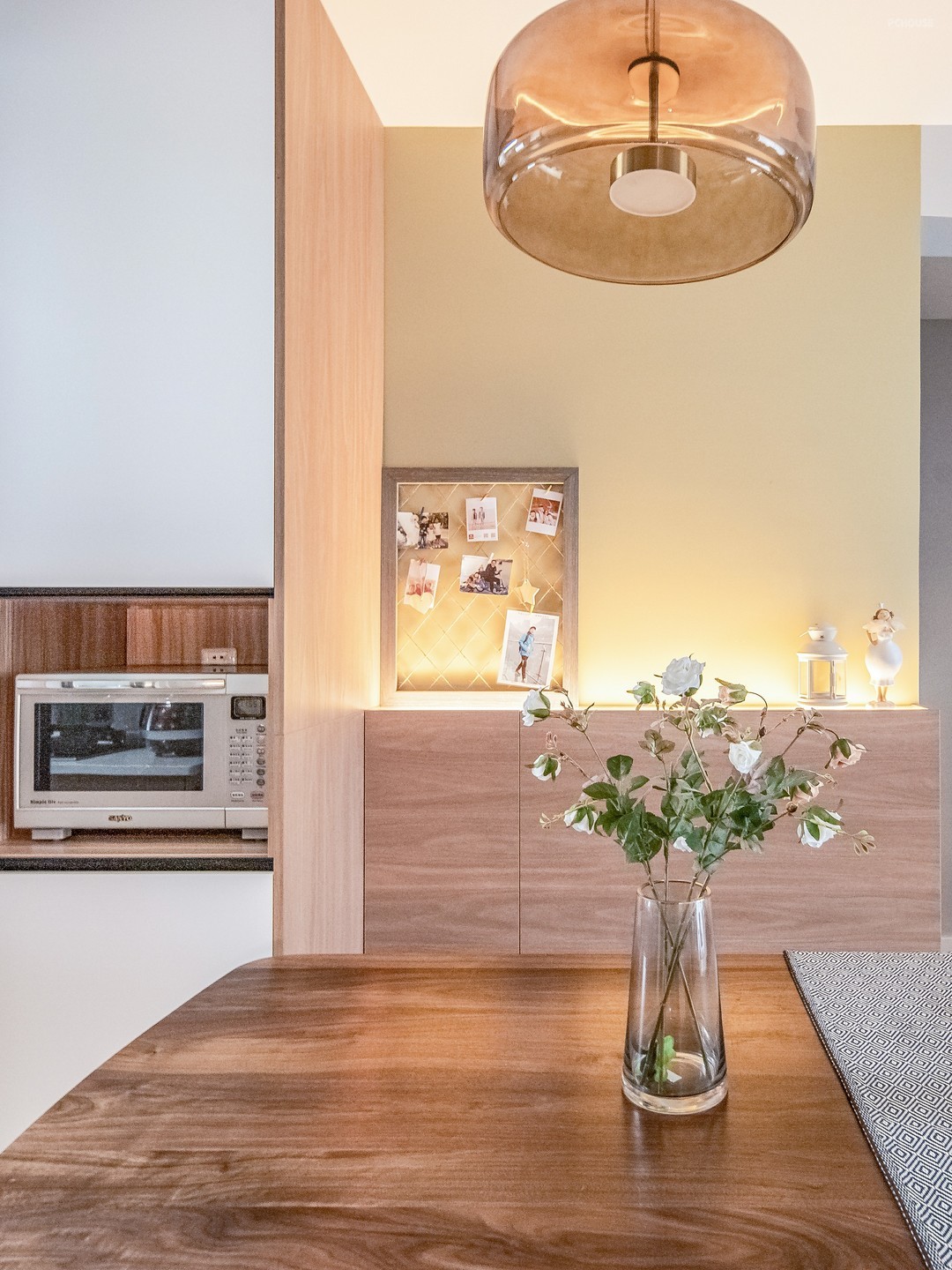 餐厅通过卡座的设计解决收纳问题的同时最大限度的释放的餐厅空间,让用餐不在拥挤,同时也将地暖分配器的位置很好隐藏。三联挂推拉门的巧妙运用既增加了厨房的通透性又解决了厨房入口的拥挤问题。