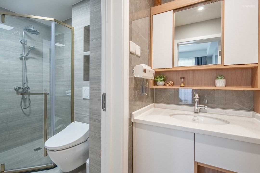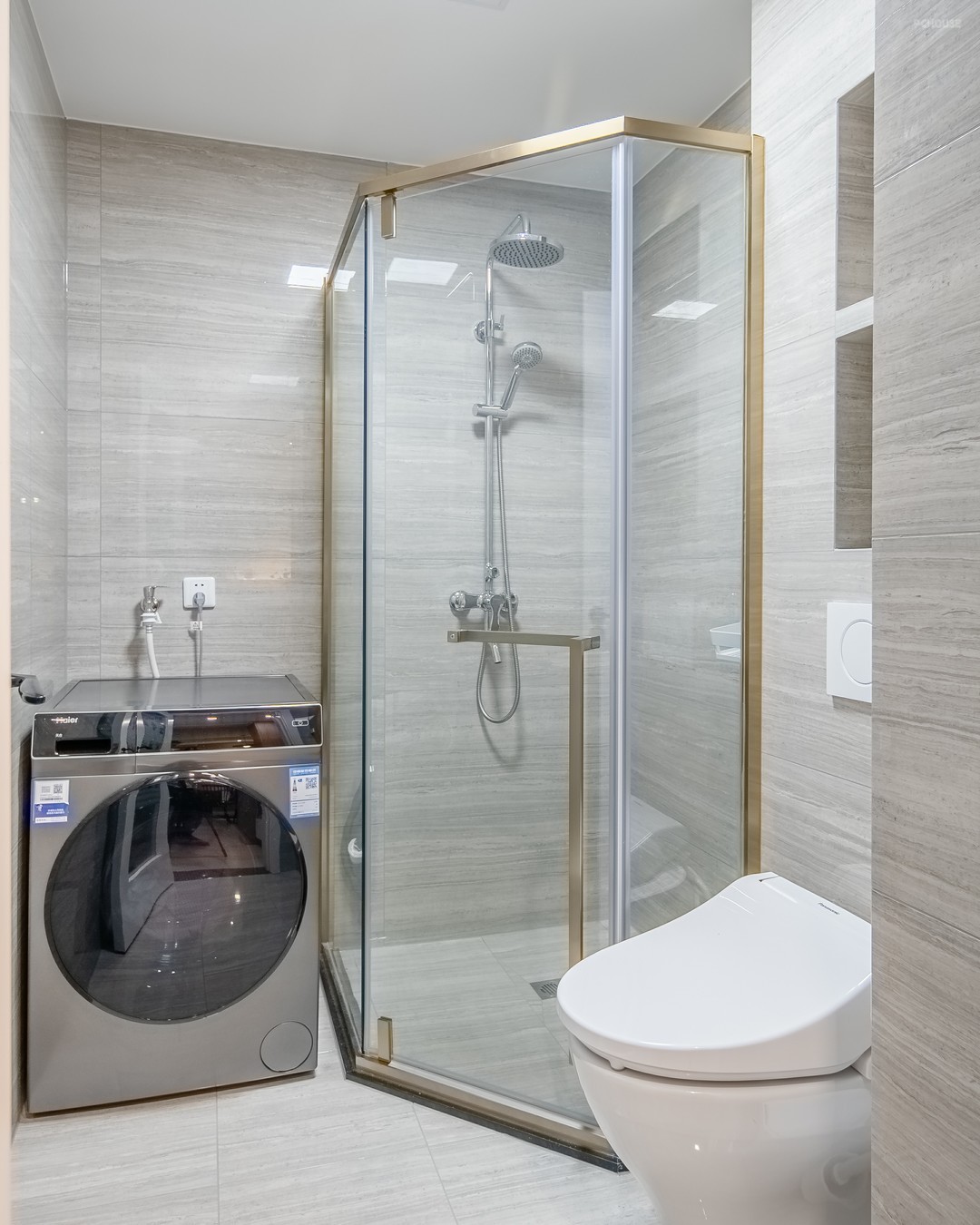 干湿分离对于一个拥有一个卫生间的四口之家显的非常重要,既能满足2个人的同时使用卫生间还不互相影响。墙排马桶解决卫生清理问题,4层壁龛处理解决卫生间收纳问题,悄悄告诉你除马桶上方两层壁龛外,淋浴房内侧还有两层壁龛。洗手盆使用抽拉龙头处理解决家里男人们早起洗头问题。