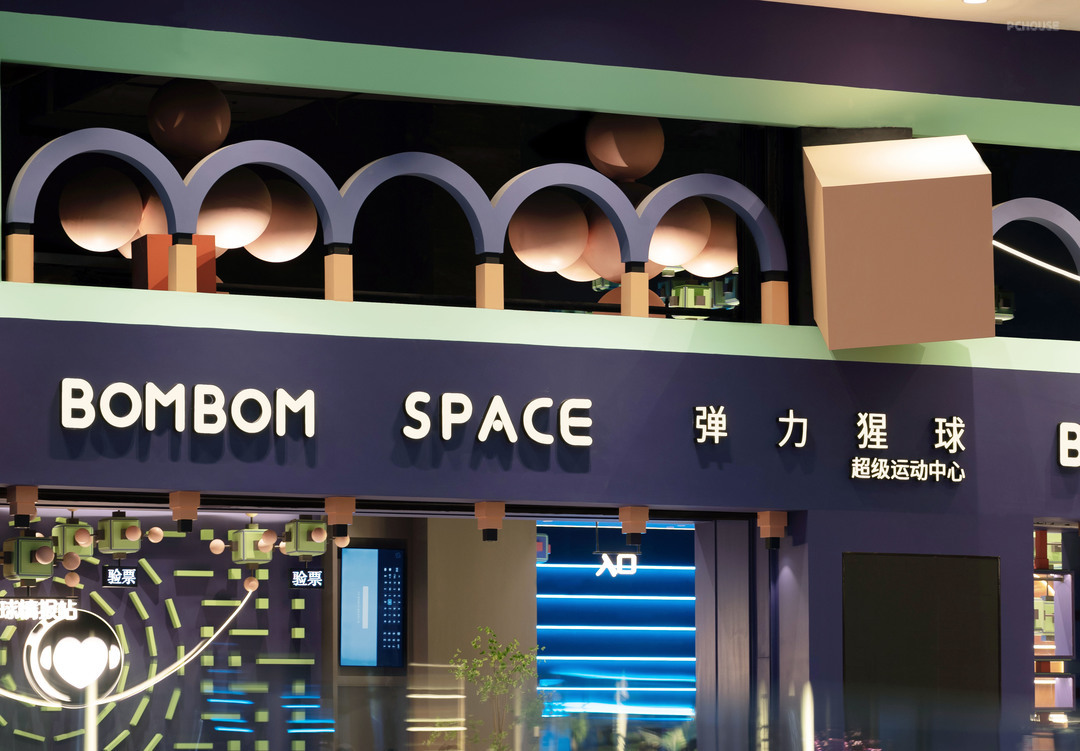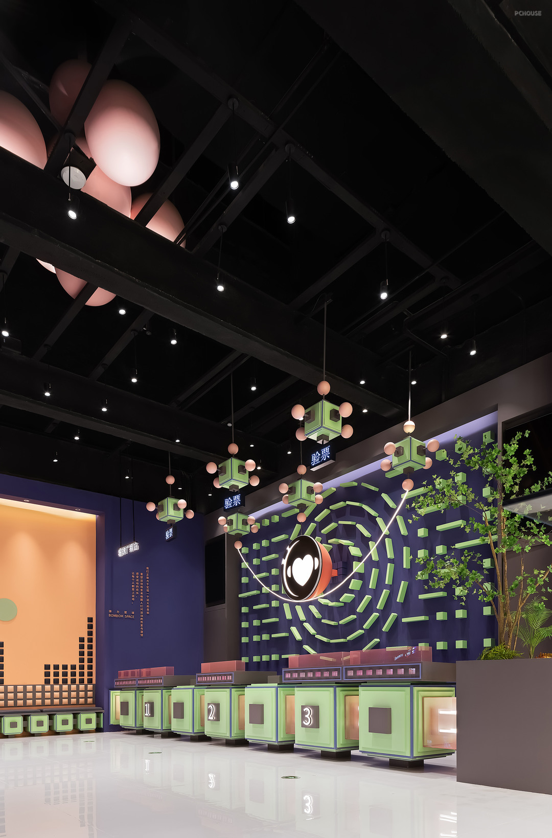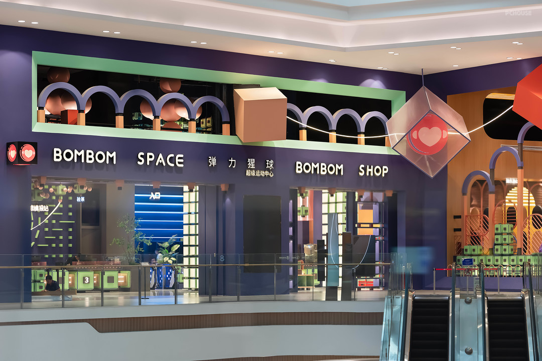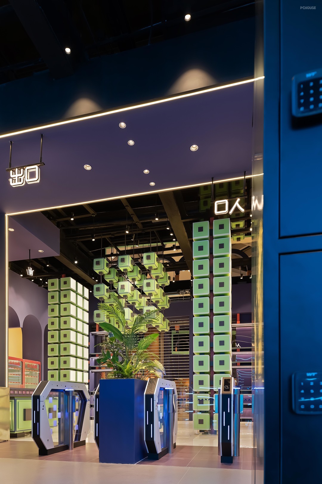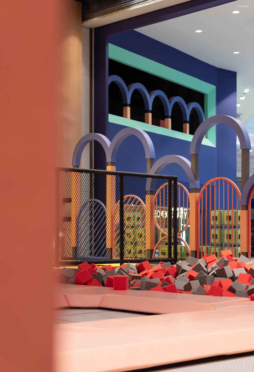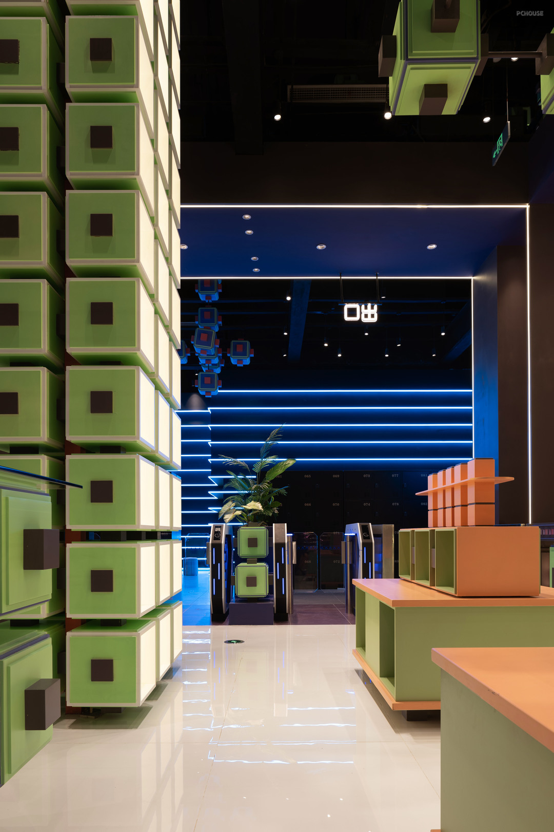 前言: BomBomSpace弹力猩球超级运动中心,位于杭州大悦城购物中心的8层,两个中庭之间。内部使用空间11米高,独特的“几”字型平面格局,与外立面作延展,我们打开周围所有视线,强化视觉吸引力,使沿着中庭的区域形成重要的视觉展示面。整个空间被划分成左、中、右三个部分,中部通高,左右两侧区域的半空中是一片钢结构梁体构成的骨架网格。所以,方形、网络,可堆叠,可延展,可变化的立方体,也就渐渐在我脑海里浮现。 猩球概念的创作是基于广袤无垠的星际空间,结合空间中的钢骨架网格,产生了联系和无尽的变化,于是“猩际魔方”这个概念也就诞生了。 整个外展面,我们以画框为基础,魔方元素作为基石,将立面空间作出划分。通过大量拱形门洞,作为穿越星空,连接宇宙空间的媒介。高空区域的每幅画的窗口,都做了拱形门洞的连续化处理,使其完整且具备神秘感,扩大了整个外展面的视觉联动效果。连续的拱形门洞,看似是门,也是窗,更是构成了守护整个猩球的城墙,称之“猩城之门”。每个门洞的下方做了延伸处理,伸出的部分演变成每一个小魔方,底部加入的灯具,展示出魔方飞行器的效果,也点缀了照明。在空间内部,我们用光带将空间的两侧做成了时空隧道的窗洞,来营造更丰富的星际空间,也是对未知和探索精神的表达。 悬浮在空中的巨大logo,装入了透明的立方体中,用光将它和其他的立方体相连接,用以阐述世间万物的诞生,演变和生生不息。 我们运用魔方的变化能力,将魔方放大,缩小,飞天,入墙。融合进货架、导台、座位、墙面装饰、空中装置等等,几乎一切,都是魔方构成。由多个独立的大魔方构成的前台,每一个都是独立体,通过发光的能量光柱,连接成一个整体。 “魔方天柱”,零售的货架是用一个个小魔方连接构成的盒子所形成的两根柱子,拔地而起,顶天立地。同时,在黑暗空中,由多个分离又相互连接的小魔方,构成一艘大的魔方飞船,守卫猩空。象征着时光穿梭的冰蓝色光带,贯穿着整个换鞋空间,一直延伸到游玩区的入口。空中,零散地放置了几个魔方演变的多面体飞行器,作为空中卫士,守卫猩球的时空隧道。游玩区的入口,通过搭建一排拱形门洞,来划分公共区域和洞穴探险区,来表达空间的穿梭与变化。拱形门洞,也代表着一扇扇时空之门,屹立于虚空中。 猩际舞台区是由许多立方体矩阵和弯曲的立方柱所构成的,是对宇宙能量敬畏的表达。星际间,强大的引力,可以托起一个个星球,使得星际空间内的一切可以井然有序地排列运作,超强的引力同