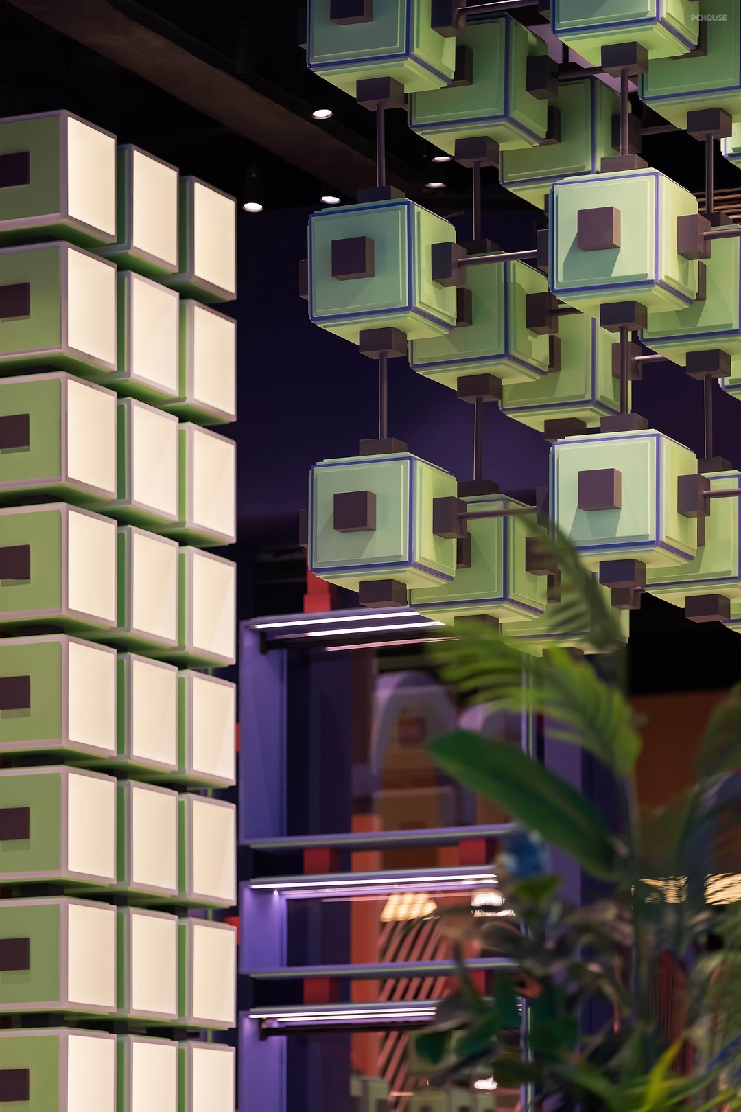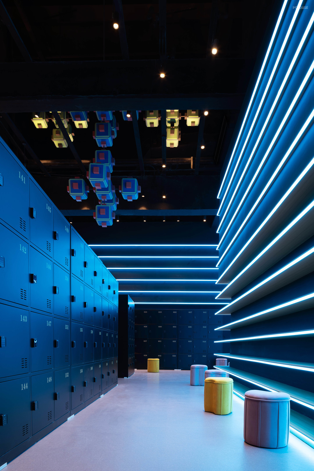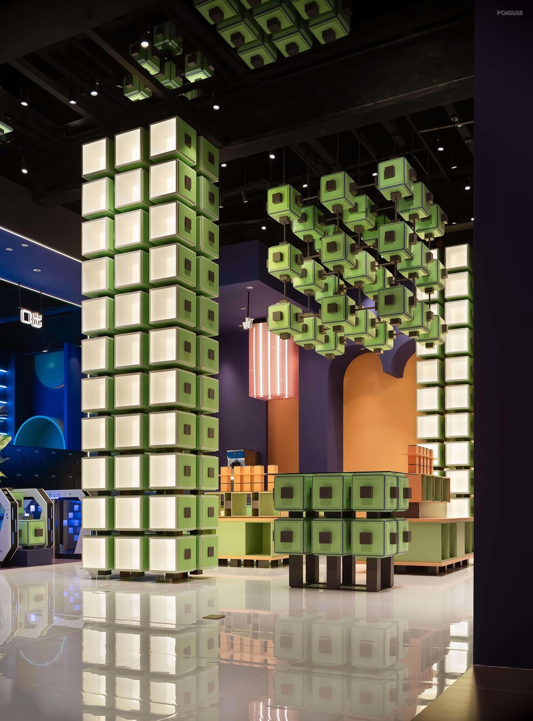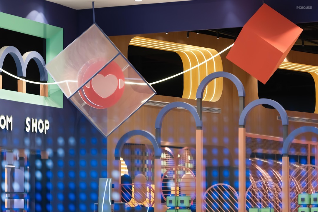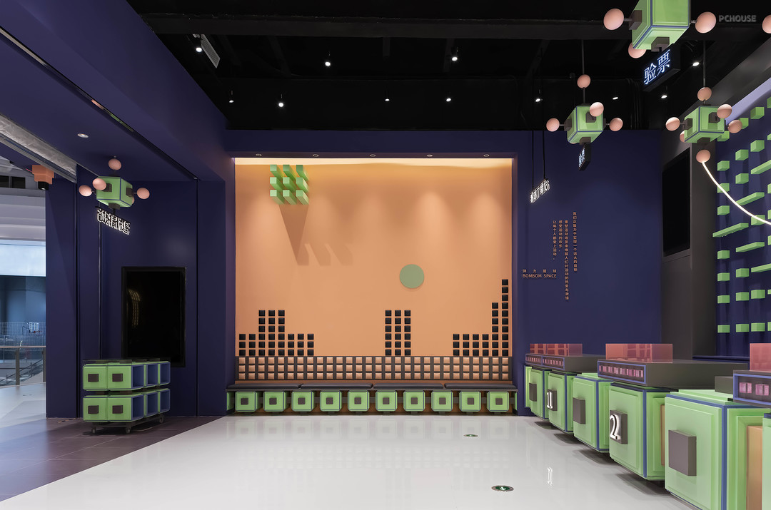 前言: BomBomSpace弹力猩球超级运动中心,位于杭州大悦城购物中心的8层,两个中庭之间。内部使用空间11米高,独特的“几”字型平面格局,与外立面作延展,我们打开周围所有视线,强化视觉吸引力,使沿着中庭的区域形成重要的视觉展示面。整个空间被划分成左、中、右三个部分,中部通高,左右两侧区域的半空中是一片钢结构梁体构成的骨架网格。所以,方形、网络,可堆叠,可延展,可变化的立方体,也就渐渐在我脑海里浮现。 猩球概念的创作是基于广袤无垠的星际空间,结合空间中的钢骨架网格,产生了联系和无尽的变化,于是“猩际魔方”这个概念也就诞生了。 整个外展面,我们以画框为基础,魔方元素作为基石,将立面空间作出划分。通过大量拱形门洞,作为穿越星空,连接宇宙空间的媒介。高空区域的每幅画的窗口,都做了拱形门洞的连续化处理,使其完整且具备神秘感,扩大了整个外展面的视觉联动效果。连续的拱形门洞,看似是门,也是窗,更是构成了守护整个猩球的城墙,称之“猩城之门”。每个门洞的下方做了延伸处理,伸出的部分演变成每一个小魔方,底部加入的灯具,展示出魔方飞行器的效果,也点缀了照明。在空间内部,我们用光带将空间的两侧做成了时空隧道的窗洞,来营造更丰富的星际空间,也是对未知和探索精神的表达。 悬浮在空中的巨大logo,装入了透明的立方体中,用光将它和其他的立方体相连接,用以阐述世间万物的诞生,演变和生生不息。 我们运用魔方的变化能力,将魔方放大,缩小,飞天,入墙。融合进货架、导台、座位、墙面装饰、空中装置等等,几乎一切,都是魔方构成。由多个独立的大魔方构成的前台,每一个都是独立体,通过发光的能量光柱,连接成一个整体。 “魔方天柱”,零售的货架是用一个个小魔方连接构成的盒子所形成的两根柱子,拔地而起,顶天立地。同时,在黑暗空中,由多个分离又相互连接的小魔方,构成一艘大的魔方飞船,守卫猩空。象征着时光穿梭的冰蓝色光带,贯穿着整个换鞋空间,一直延伸到游玩区的入口。空中,零散地放置了几个魔方演变的多面体飞行器,作为空中卫士,守卫猩球的时空隧道。游玩区的入口,通过搭建一排拱形门洞,来划分公共区域和洞穴探险区,来表达空间的穿梭与变化。拱形门洞,也代表着一扇扇时空之门,屹立于虚空中。 猩际舞台区是由许多立方体矩阵和弯曲的立方柱所构成的,是对宇宙能量敬畏的表达。星际间,强大的引力,可以托起一个个星球,使得星际空间内的一切可以井然有序地排列运作,超强的引力同