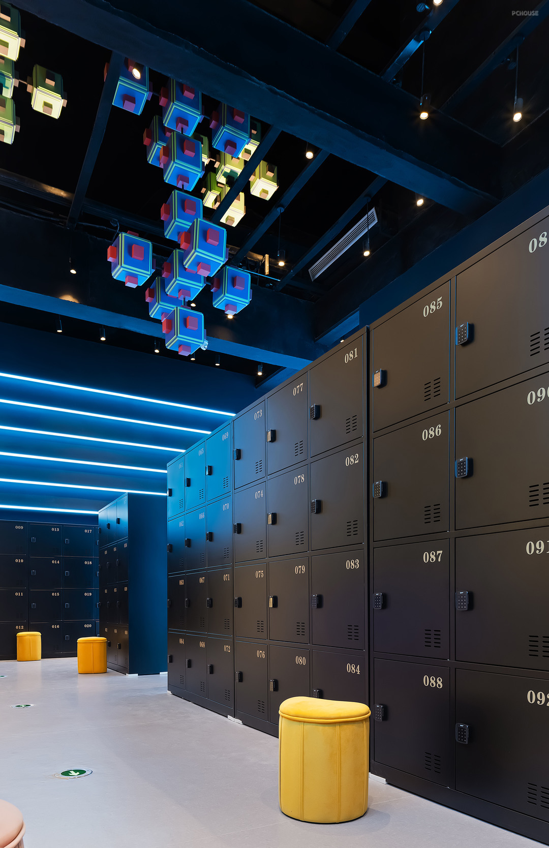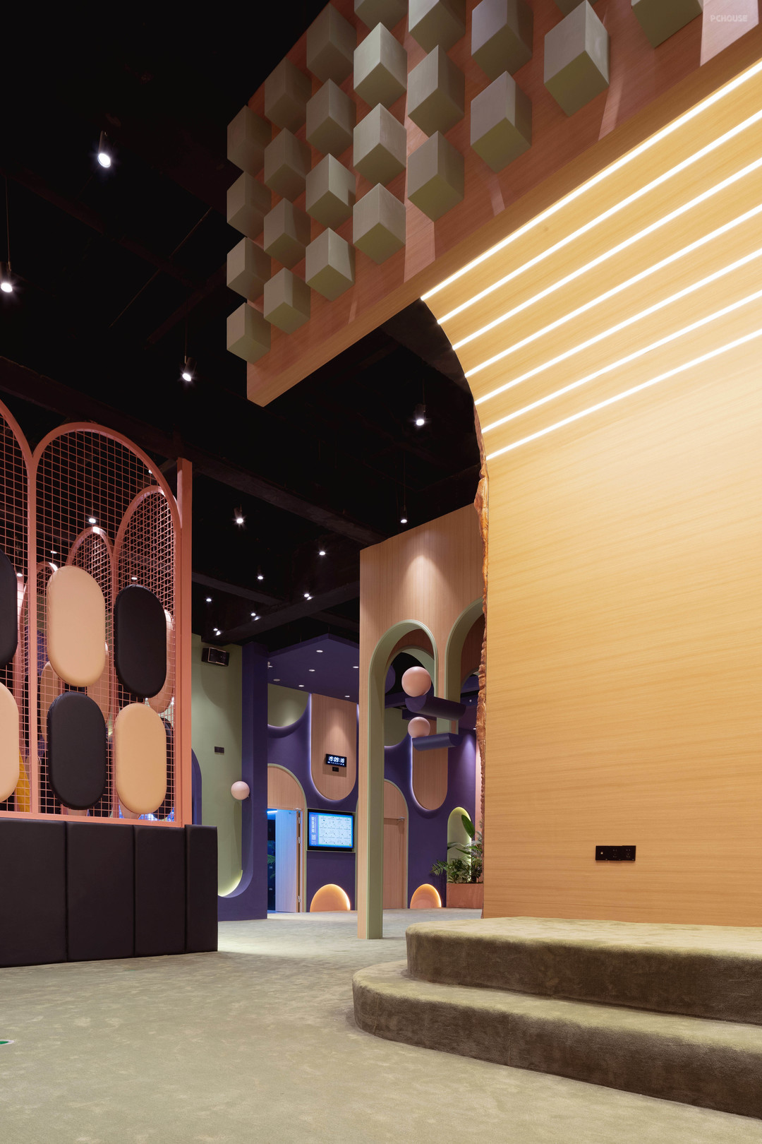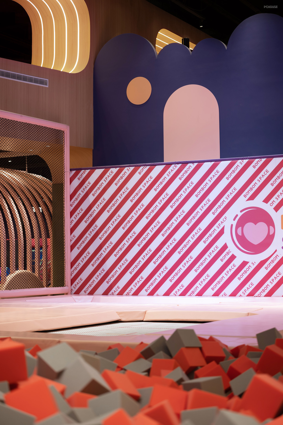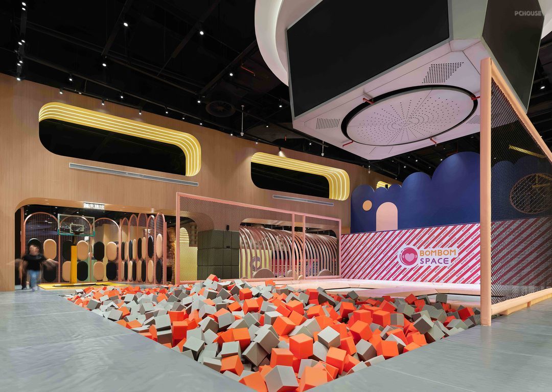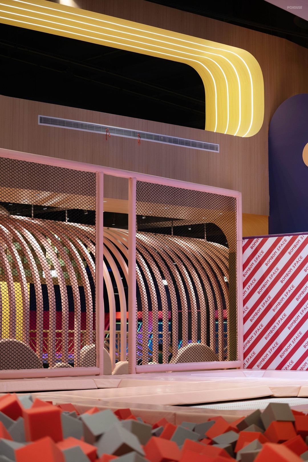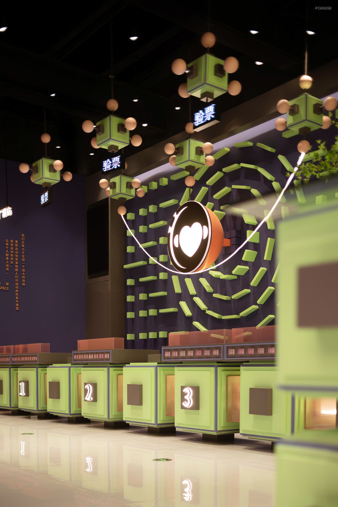 前言: BomBomSpace弹力猩球超级运动中心,位于杭州大悦城购物中心的8层,两个中庭之间。内部使用空间11米高,独特的“几”字型平面格局,与外立面作延展,我们打开周围所有视线,强化视觉吸引力,使沿着中庭的区域形成重要的视觉展示面。整个空间被划分成左、中、右三个部分,中部通高,左右两侧区域的半空中是一片钢结构梁体构成的骨架网格。所以,方形、网络,可堆叠,可延展,可变化的立方体,也就渐渐在我脑海里浮现。 猩球概念的创作是基于广袤无垠的星际空间,结合空间中的钢骨架网格,产生了联系和无尽的变化,于是“猩际魔方”这个概念也就诞生了。 整个外展面,我们以画框为基础,魔方元素作为基石,将立面空间作出划分。通过大量拱形门洞,作为穿越星空,连接宇宙空间的媒介。高空区域的每幅画的窗口,都做了拱形门洞的连续化处理,使其完整且具备神秘感,扩大了整个外展面的视觉联动效果。连续的拱形门洞,看似是门,也是窗,更是构成了守护整个猩球的城墙,称之“猩城之门”。每个门洞的下方做了延伸处理,伸出的部分演变成每一个小魔方,底部加入的灯具,展示出魔方飞行器的效果,也点缀了照明。在空间内部,我们用光带将空间的两侧做成了时空隧道的窗洞,来营造更丰富的星际空间,也是对未知和探索精神的表达。 悬浮在空中的巨大logo,装入了透明的立方体中,用光将它和其他的立方体相连接,用以阐述世间万物的诞生,演变和生生不息。 我们运用魔方的变化能力,将魔方放大,缩小,飞天,入墙。融合进货架、导台、座位、墙面装饰、空中装置等等,几乎一切,都是魔方构成。由多个独立的大魔方构成的前台,每一个都是独立体,通过发光的能量光柱,连接成一个整体。 “魔方天柱”,零售的货架是用一个个小魔方连接构成的盒子所形成的两根柱子,拔地而起,顶天立地。同时,在黑暗空中,由多个分离又相互连接的小魔方,构成一艘大的魔方飞船,守卫猩空。象征着时光穿梭的冰蓝色光带,贯穿着整个换鞋空间,一直延伸到游玩区的入口。空中,零散地放置了几个魔方演变的多面体飞行器,作为空中卫士,守卫猩球的时空隧道。游玩区的入口,通过搭建一排拱形门洞,来划分公共区域和洞穴探险区,来表达空间的穿梭与变化。拱形门洞,也代表着一扇扇时空之门,屹立于虚空中。 猩际舞台区是由许多立方体矩阵和弯曲的立方柱所构成的,是对宇宙能量敬畏的表达。星际间,强大的引力,可以托起一个个星球,使得星际空间内的一切可以井然有序地排列运作,超强的引力同