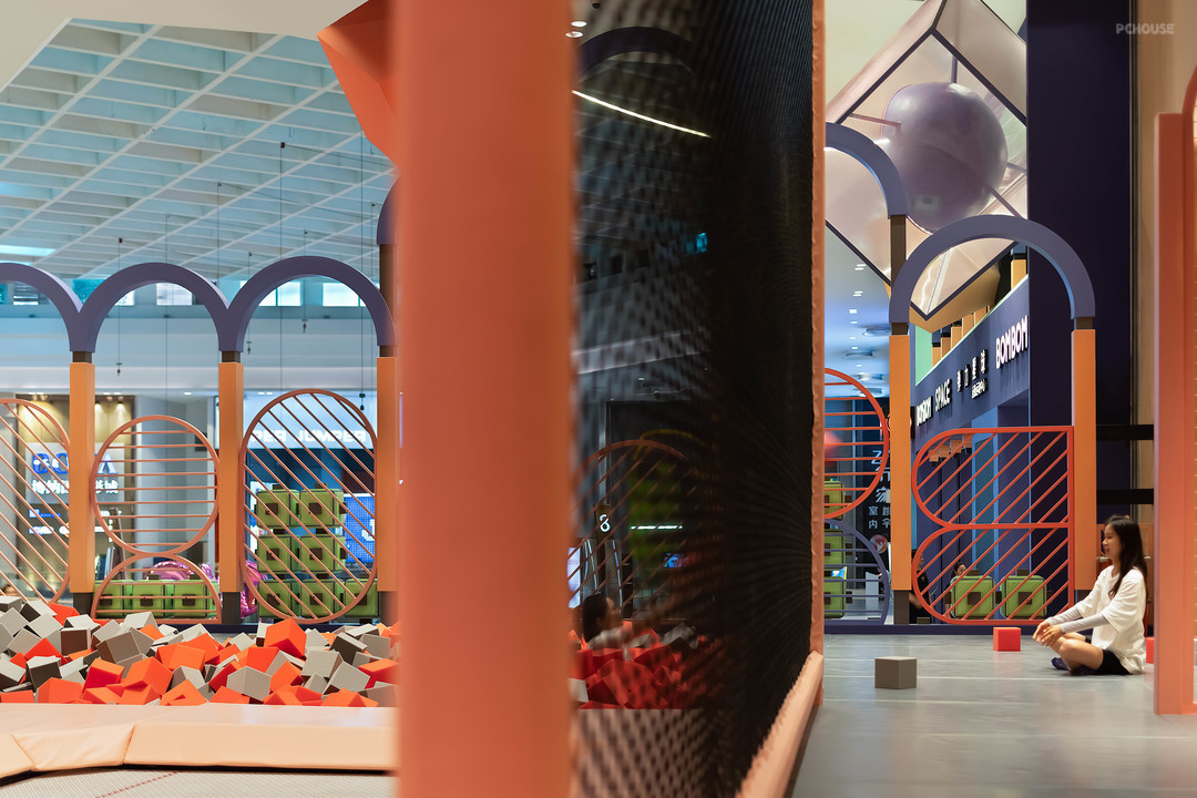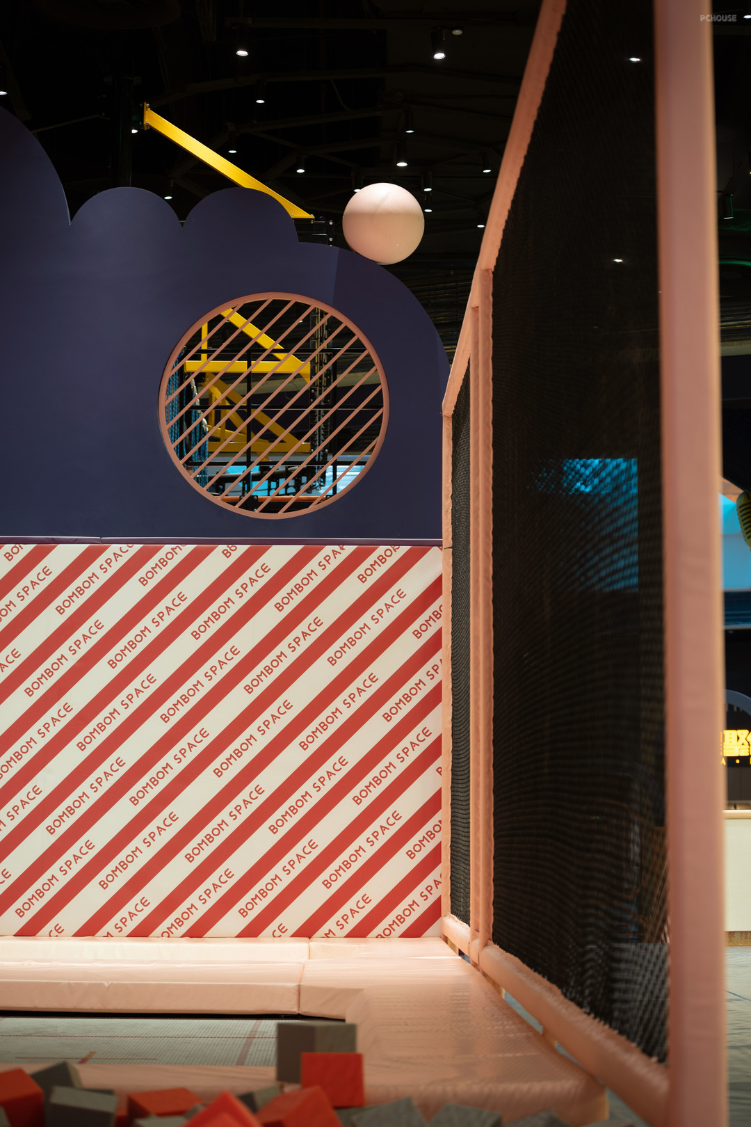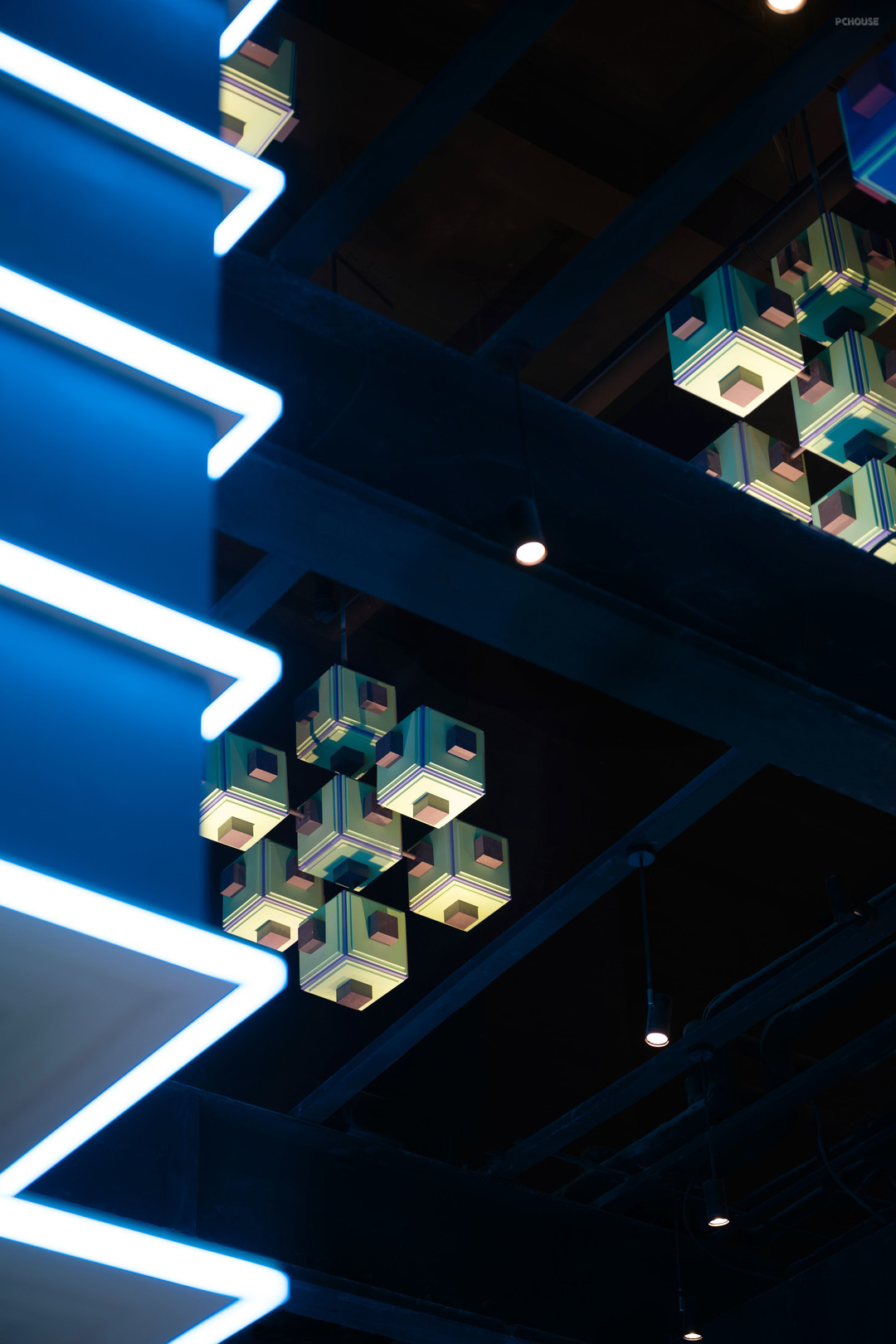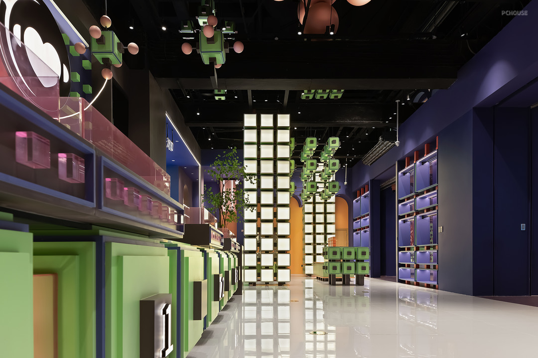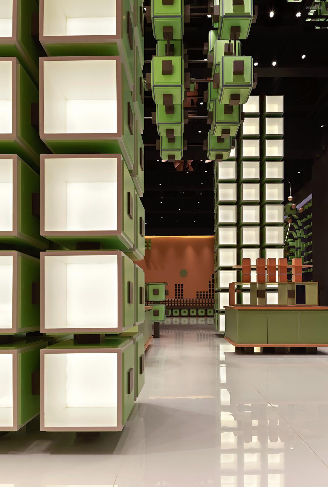 前言: BomBomSpace弹力猩球超级运动中心,位于杭州大悦城购物中心的8层,两个中庭之间。内部使用空间11米高,独特的“几”字型平面格局,与外立面作延展,我们打开周围所有视线,强化视觉吸引力,使沿着中庭的区域形成重要的视觉展示面。整个空间被划分成左、中、右三个部分,中部通高,左右两侧区域的半空中是一片钢结构梁体构成的骨架网格。所以,方形、网络,可堆叠,可延展,可变化的立方体,也就渐渐在我脑海里浮现。 猩球概念的创作是基于广袤无垠的星际空间,结合空间中的钢骨架网格,产生了联系和无尽的变化,于是“猩际魔方”这个概念也就诞生了。 整个外展面,我们以画框为基础,魔方元素作为基石,将立面空间作出划分。通过大量拱形门洞,作为穿越星空,连接宇宙空间的媒介。高空区域的每幅画的窗口,都做了拱形门洞的连续化处理,使其完整且具备神秘感,扩大了整个外展面的视觉联动效果。连续的拱形门洞,看似是门,也是窗,更是构成了守护整个猩球的城墙,称之“猩城之门”。每个门洞的下方做了延伸处理,伸出的部分演变成每一个小魔方,底部加入的灯具,展示出魔方飞行器的效果,也点缀了照明。在空间内部,我们用光带将空间的两侧做成了时空隧道的窗洞,来营造更丰富的星际空间,也是对未知和探索精神的表达。 悬浮在空中的巨大logo,装入了透明的立方体中,用光将它和其他的立方体相连接,用以阐述世间万物的诞生,演变和生生不息。 我们运用魔方的变化能力,将魔方放大,缩小,飞天,入墙。融合进货架、导台、座位、墙面装饰、空中装置等等,几乎一切,都是魔方构成。由多个独立的大魔方构成的前台,每一个都是独立体,通过发光的能量光柱,连接成一个整体。 “魔方天柱”,零售的货架是用一个个小魔方连接构成的盒子所形成的两根柱子,拔地而起,顶天立地。同时,在黑暗空中,由多个分离又相互连接的小魔方,构成一艘大的魔方飞船,守卫猩空。象征着时光穿梭的冰蓝色光带,贯穿着整个换鞋空间,一直延伸到游玩区的入口。空中,零散地放置了几个魔方演变的多面体飞行器,作为空中卫士,守卫猩球的时空隧道。游玩区的入口,通过搭建一排拱形门洞,来划分公共区域和洞穴探险区,来表达空间的穿梭与变化。拱形门洞,也代表着一扇扇时空之门,屹立于虚空中。 猩际舞台区是由许多立方体矩阵和弯曲的立方柱所构成的,是对宇宙能量敬畏的表达。星际间,强大的引力,可以托起一个个星球,使得星际空间内的一切可以井然有序地排列运作,超强的引力同