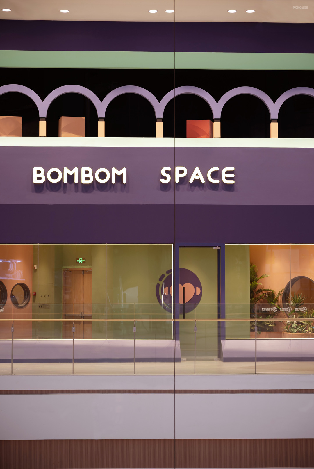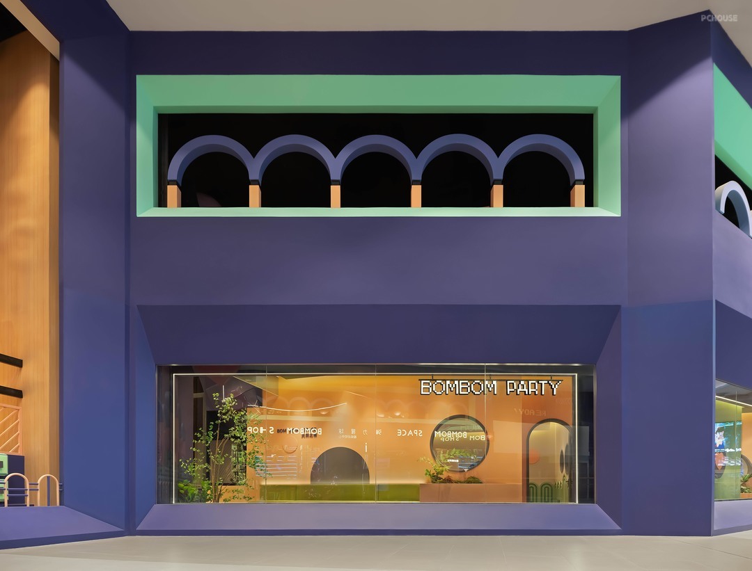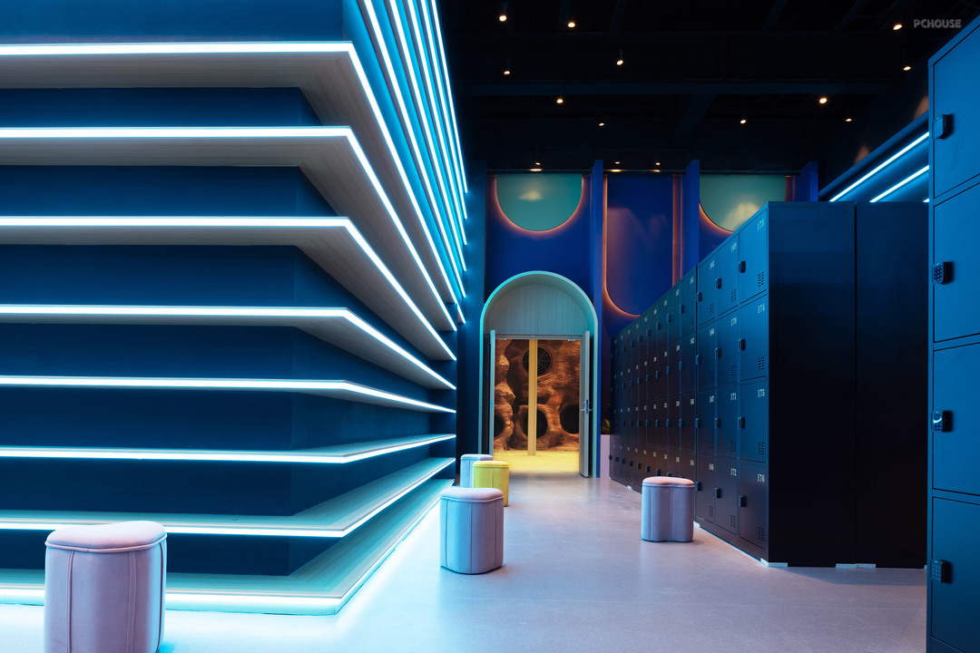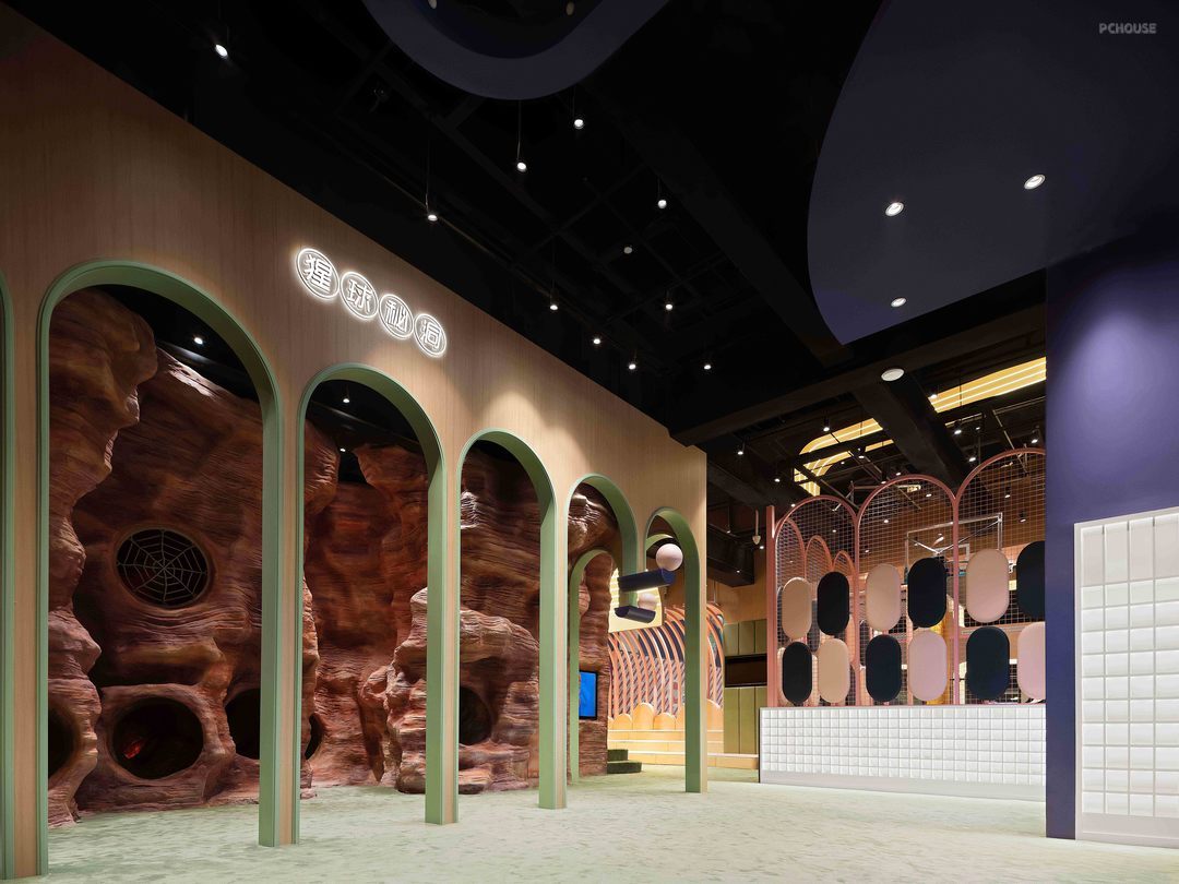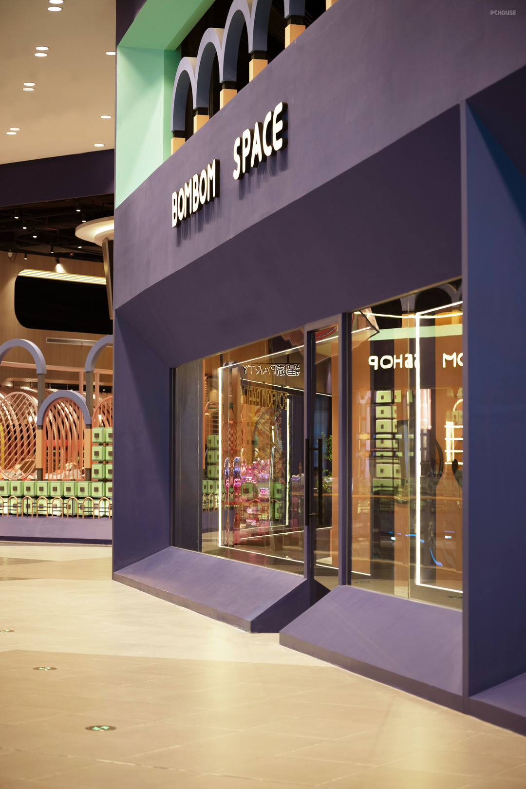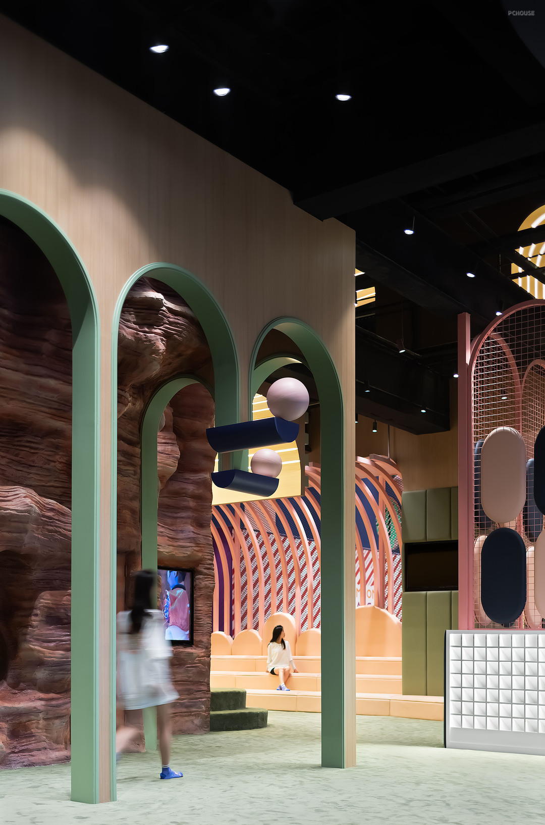前言: BomBomSpace弹力猩球超级运动中心,位于杭州大悦城购物中心的8层,两个中庭之间。内部使用空间11米高,独特的“几”字型平面格局,与外立面作延展,我们打开周围所有视线,强化视觉吸引力,使沿着中庭的区域形成重要的视觉展示面。整个空间被划分成左、中、右三个部分,中部通高,左右两侧区域的半空中是一片钢结构梁体构成的骨架网格。所以,方形、网络,可堆叠,可延展,可变化的立方体,也就渐渐在我脑海里浮现。 猩球概念的创作是基于广袤无垠的星际空间,结合空间中的钢骨架网格,产生了联系和无尽的变化,于是“猩际魔方”这个概念也就诞生了。 整个外展面,我们以画框为基础,魔方元素作为基石,将立面空间作出划分。通过大量拱形门洞,作为穿越星空,连接宇宙空间的媒介。高空区域的每幅画的窗口,都做了拱形门洞的连续化处理,使其完整且具备神秘感,扩大了整个外展面的视觉联动效果。连续的拱形门洞,看似是门,也是窗,更是构成了守护整个猩球的城墙,称之“猩城之门”。每个门洞的下方做了延伸处理,伸出的部分演变成每一个小魔方,底部加入的灯具,展示出魔方飞行器的效果,也点缀了照明。在空间内部,我们用光带将空间的两侧做成了时空隧道的窗洞,来营造更丰富的星际空间,也是对未知和探索精神的表达。 悬浮在空中的巨大logo,装入了透明的立方体中,用光将它和其他的立方体相连接,用以阐述世间万物的诞生,演变和生生不息。 我们运用魔方的变化能力,将魔方放大,缩小,飞天,入墙。融合进货架、导台、座位、墙面装饰、空中装置等等,几乎一切,都是魔方构成。由多个独立的大魔方构成的前台,每一个都是独立体,通过发光的能量光柱,连接成一个整体。 “魔方天柱”,零售的货架是用一个个小魔方连接构成的盒子所形成的两根柱子,拔地而起,顶天立地。同时,在黑暗空中,由多个分离又相互连接的小魔方,构成一艘大的魔方飞船,守卫猩空。象征着时光穿梭的冰蓝色光带,贯穿着整个换鞋空间,一直延伸到游玩区的入口。空中,零散地放置了几个魔方演变的多面体飞行器,作为空中卫士,守卫猩球的时空隧道。游玩区的入口,通过搭建一排拱形门洞,来划分公共区域和洞穴探险区,来表达空间的穿梭与变化。拱形门洞,也代表着一扇扇时空之门,屹立于虚空中。 猩际舞台区是由许多立方体矩阵和弯曲的立方柱所构成的,是对宇宙能量敬畏的表达。星际间,强大的引力,可以托起一个个星球,使得星际空间内的一切可以井然有序地排列运作,超强的引力同