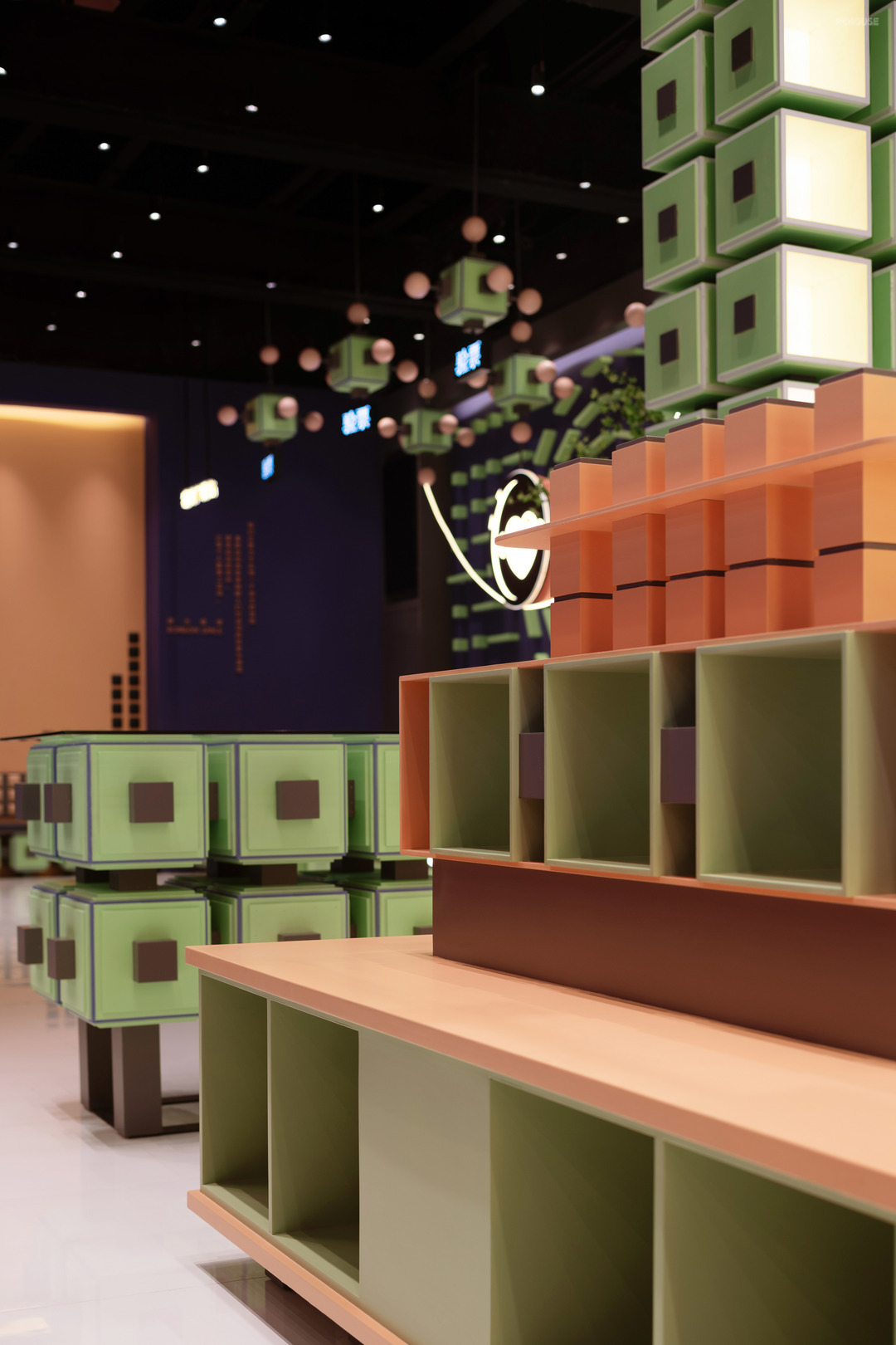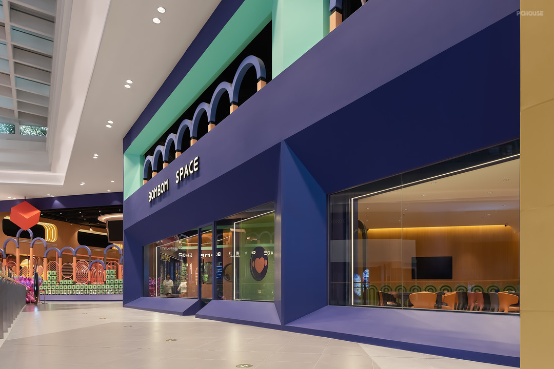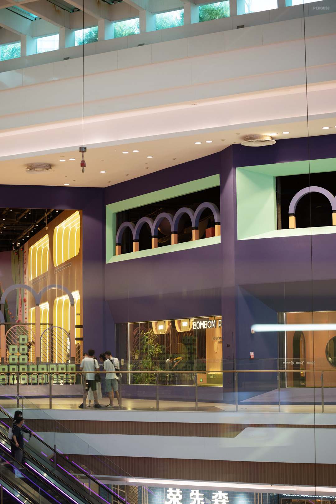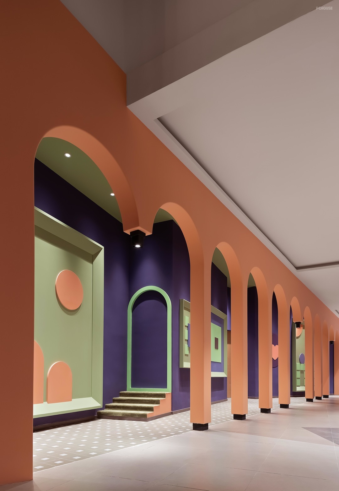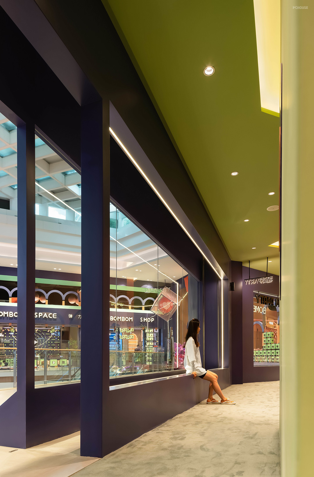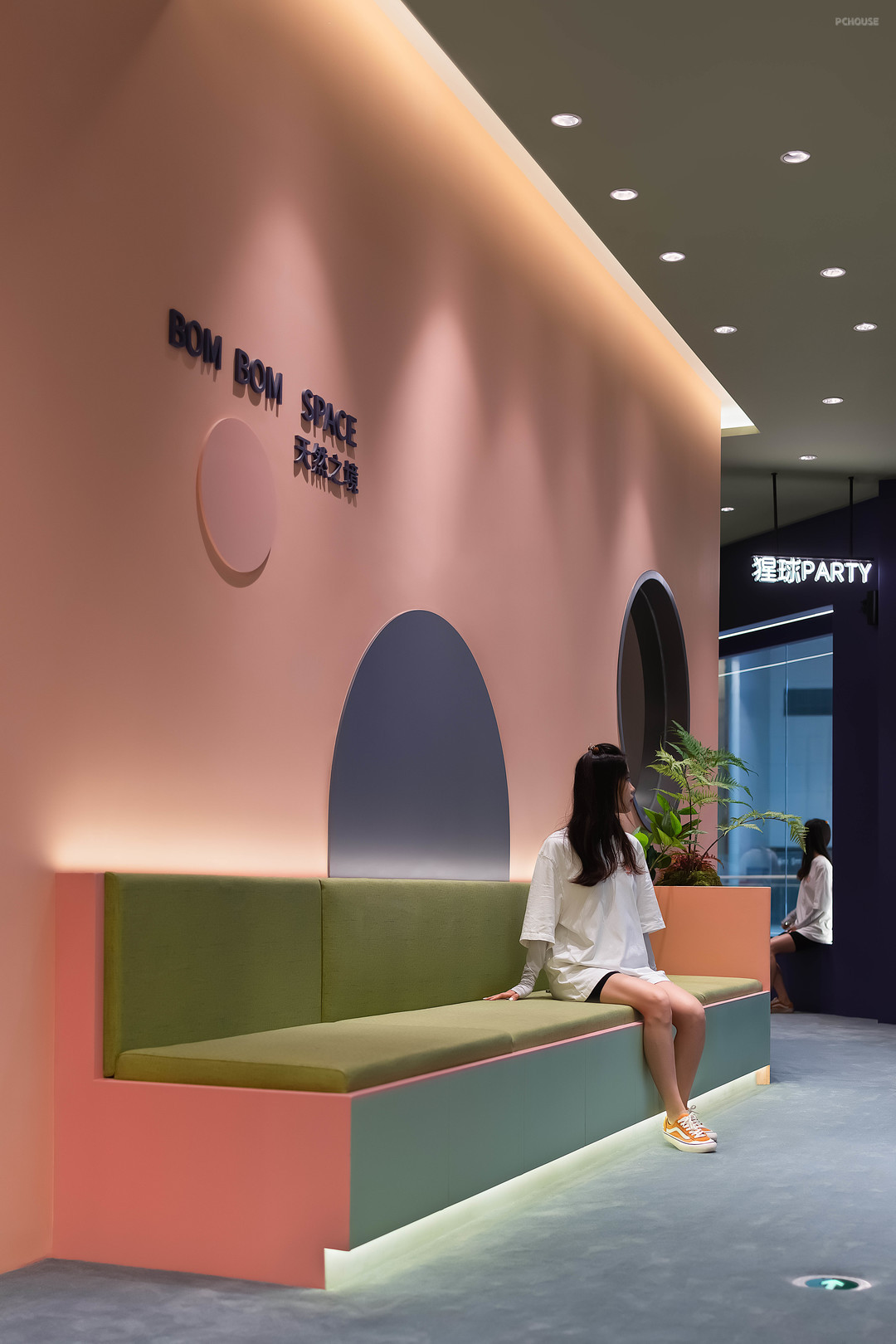 前言: BomBomSpace弹力猩球超级运动中心,位于杭州大悦城购物中心的8层,两个中庭之间。内部使用空间11米高,独特的“几”字型平面格局,与外立面作延展,我们打开周围所有视线,强化视觉吸引力,使沿着中庭的区域形成重要的视觉展示面。整个空间被划分成左、中、右三个部分,中部通高,左右两侧区域的半空中是一片钢结构梁体构成的骨架网格。所以,方形、网络,可堆叠,可延展,可变化的立方体,也就渐渐在我脑海里浮现。 猩球概念的创作是基于广袤无垠的星际空间,结合空间中的钢骨架网格,产生了联系和无尽的变化,于是“猩际魔方”这个概念也就诞生了。 整个外展面,我们以画框为基础,魔方元素作为基石,将立面空间作出划分。通过大量拱形门洞,作为穿越星空,连接宇宙空间的媒介。高空区域的每幅画的窗口,都做了拱形门洞的连续化处理,使其完整且具备神秘感,扩大了整个外展面的视觉联动效果。连续的拱形门洞,看似是门,也是窗,更是构成了守护整个猩球的城墙,称之“猩城之门”。每个门洞的下方做了延伸处理,伸出的部分演变成每一个小魔方,底部加入的灯具,展示出魔方飞行器的效果,也点缀了照明。在空间内部,我们用光带将空间的两侧做成了时空隧道的窗洞,来营造更丰富的星际空间,也是对未知和探索精神的表达。 悬浮在空中的巨大logo,装入了透明的立方体中,用光将它和其他的立方体相连接,用以阐述世间万物的诞生,演变和生生不息。 我们运用魔方的变化能力,将魔方放大,缩小,飞天,入墙。融合进货架、导台、座位、墙面装饰、空中装置等等,几乎一切,都是魔方构成。由多个独立的大魔方构成的前台,每一个都是独立体,通过发光的能量光柱,连接成一个整体。 “魔方天柱”,零售的货架是用一个个小魔方连接构成的盒子所形成的两根柱子,拔地而起,顶天立地。同时,在黑暗空中,由多个分离又相互连接的小魔方,构成一艘大的魔方飞船,守卫猩空。象征着时光穿梭的冰蓝色光带,贯穿着整个换鞋空间,一直延伸到游玩区的入口。空中,零散地放置了几个魔方演变的多面体飞行器,作为空中卫士,守卫猩球的时空隧道。游玩区的入口,通过搭建一排拱形门洞,来划分公共区域和洞穴探险区,来表达空间的穿梭与变化。拱形门洞,也代表着一扇扇时空之门,屹立于虚空中。 猩际舞台区是由许多立方体矩阵和弯曲的立方柱所构成的,是对宇宙能量敬畏的表达。星际间,强大的引力,可以托起一个个星球,使得星际空间内的一切可以井然有序地排列运作,超强的引力同