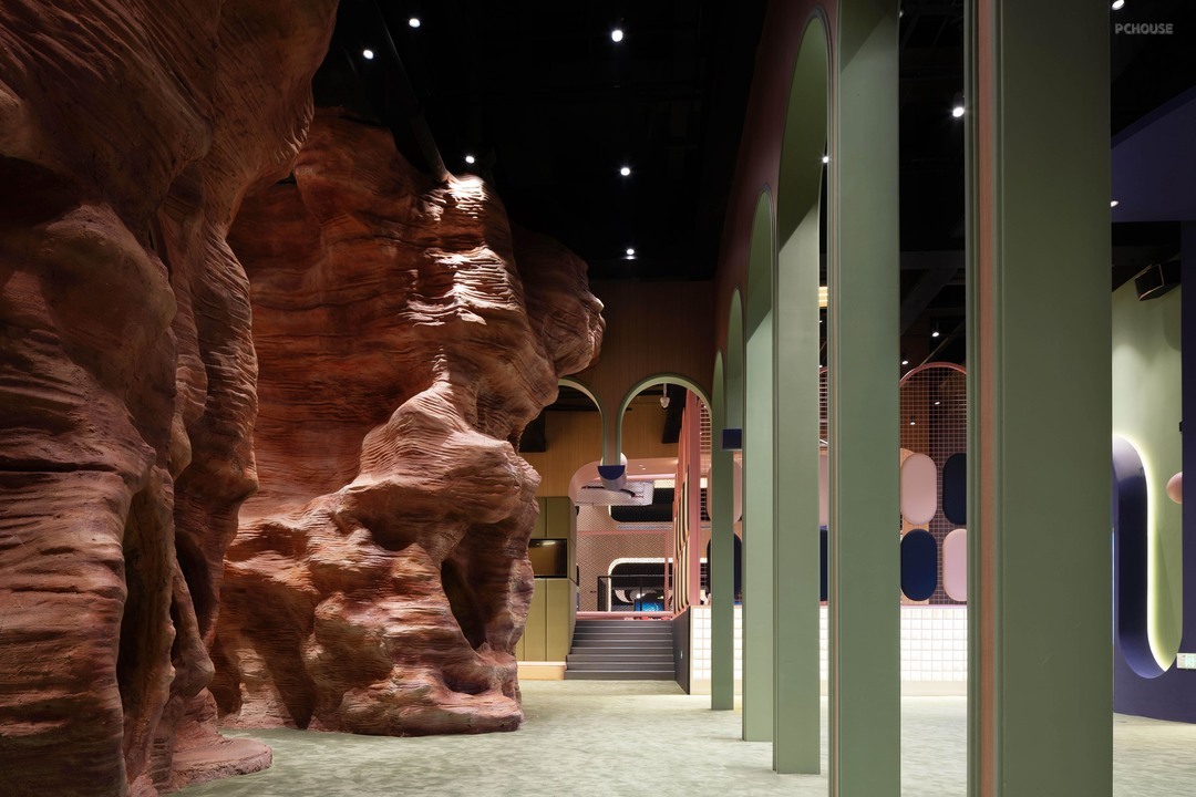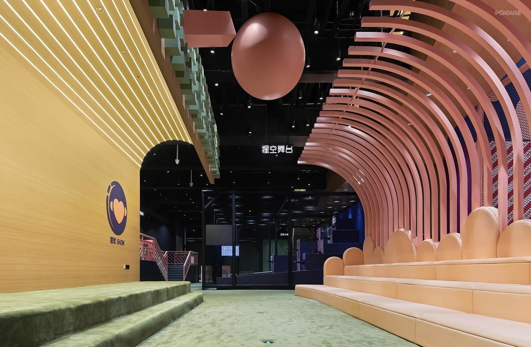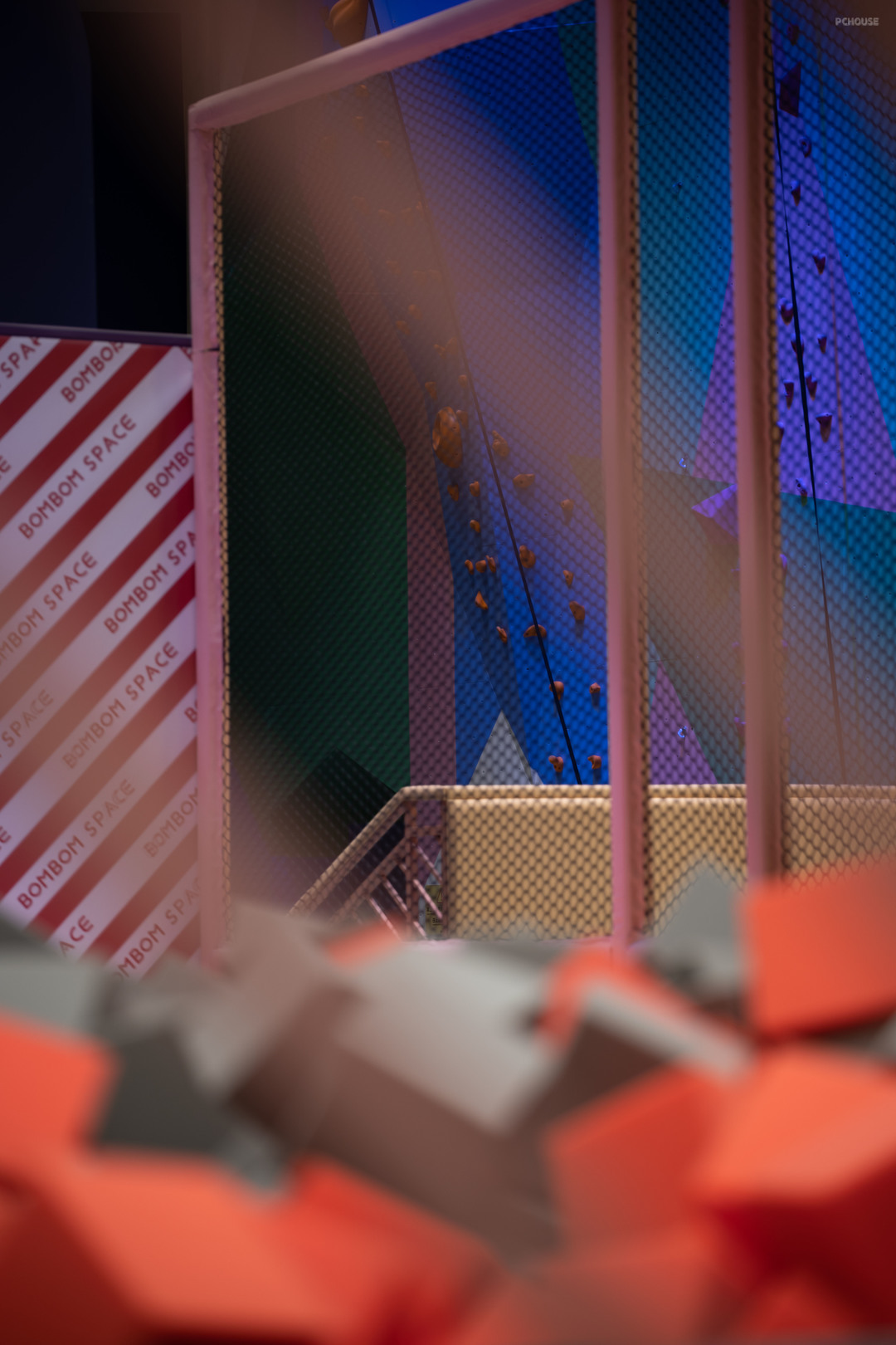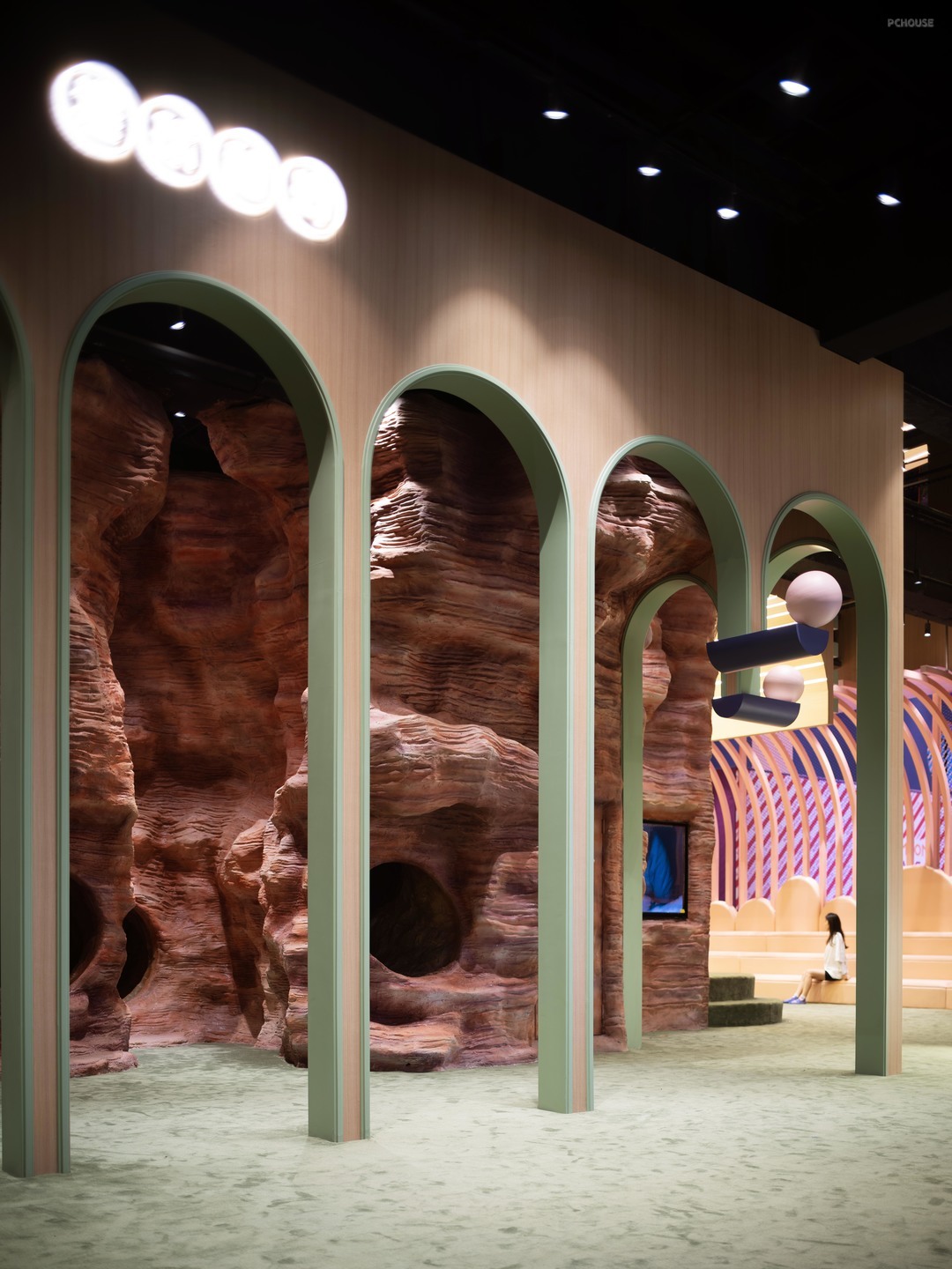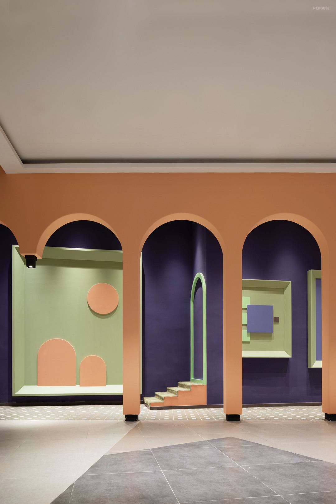 前言: BomBomSpace弹力猩球超级运动中心,位于杭州大悦城购物中心的8层,两个中庭之间。内部使用空间11米高,独特的“几”字型平面格局,与外立面作延展,我们打开周围所有视线,强化视觉吸引力,使沿着中庭的区域形成重要的视觉展示面。整个空间被划分成左、中、右三个部分,中部通高,左右两侧区域的半空中是一片钢结构梁体构成的骨架网格。所以,方形、网络,可堆叠,可延展,可变化的立方体,也就渐渐在我脑海里浮现。 猩球概念的创作是基于广袤无垠的星际空间,结合空间中的钢骨架网格,产生了联系和无尽的变化,于是“猩际魔方”这个概念也就诞生了。 整个外展面,我们以画框为基础,魔方元素作为基石,将立面空间作出划分。通过大量拱形门洞,作为穿越星空,连接宇宙空间的媒介。高空区域的每幅画的窗口,都做了拱形门洞的连续化处理,使其完整且具备神秘感,扩大了整个外展面的视觉联动效果。连续的拱形门洞,看似是门,也是窗,更是构成了守护整个猩球的城墙,称之“猩城之门”。每个门洞的下方做了延伸处理,伸出的部分演变成每一个小魔方,底部加入的灯具,展示出魔方飞行器的效果,也点缀了照明。在空间内部,我们用光带将空间的两侧做成了时空隧道的窗洞,来营造更丰富的星际空间,也是对未知和探索精神的表达。 悬浮在空中的巨大logo,装入了透明的立方体中,用光将它和其他的立方体相连接,用以阐述世间万物的诞生,演变和生生不息。 我们运用魔方的变化能力,将魔方放大,缩小,飞天,入墙。融合进货架、导台、座位、墙面装饰、空中装置等等,几乎一切,都是魔方构成。由多个独立的大魔方构成的前台,每一个都是独立体,通过发光的能量光柱,连接成一个整体。 “魔方天柱”,零售的货架是用一个个小魔方连接构成的盒子所形成的两根柱子,拔地而起,顶天立地。同时,在黑暗空中,由多个分离又相互连接的小魔方,构成一艘大的魔方飞船,守卫猩空。象征着时光穿梭的冰蓝色光带,贯穿着整个换鞋空间,一直延伸到游玩区的入口。空中,零散地放置了几个魔方演变的多面体飞行器,作为空中卫士,守卫猩球的时空隧道。游玩区的入口,通过搭建一排拱形门洞,来划分公共区域和洞穴探险区,来表达空间的穿梭与变化。拱形门洞,也代表着一扇扇时空之门,屹立于虚空中。 猩际舞台区是由许多立方体矩阵和弯曲的立方柱所构成的,是对宇宙能量敬畏的表达。星际间,强大的引力,可以托起一个个星球,使得星际空间内的一切可以井然有序地排列运作,超强的引力同