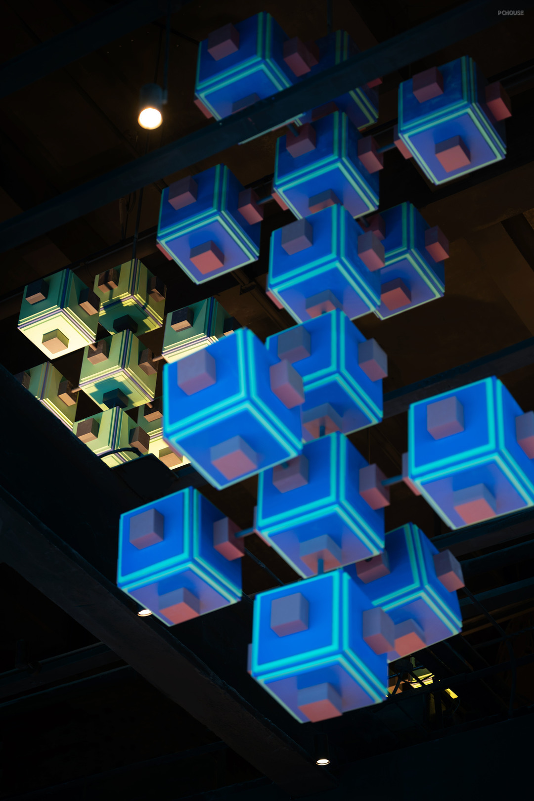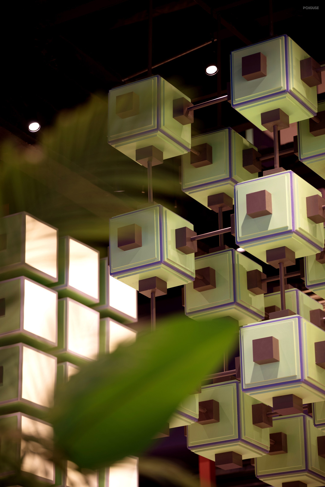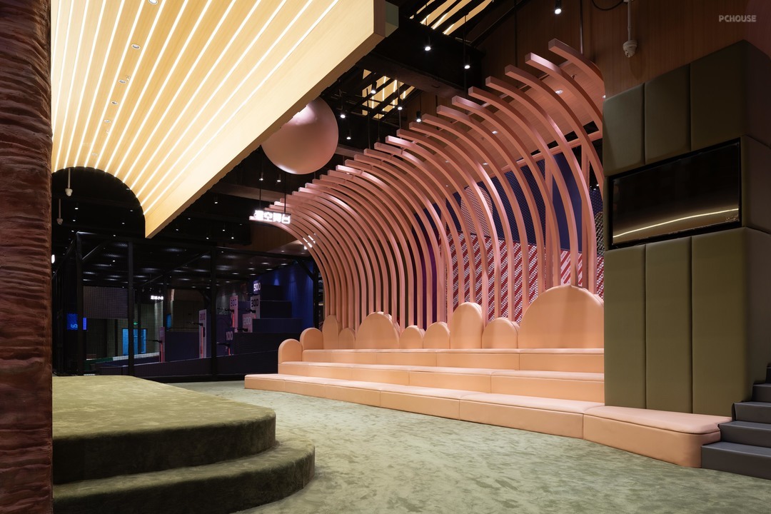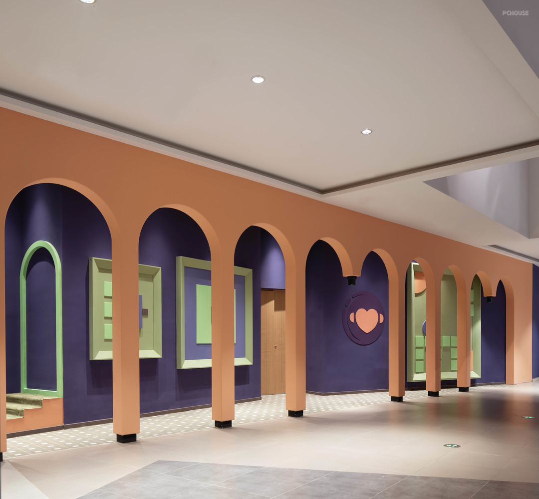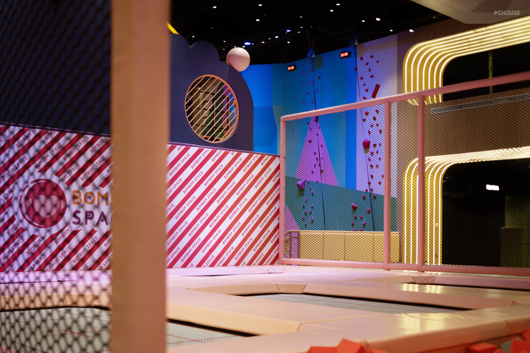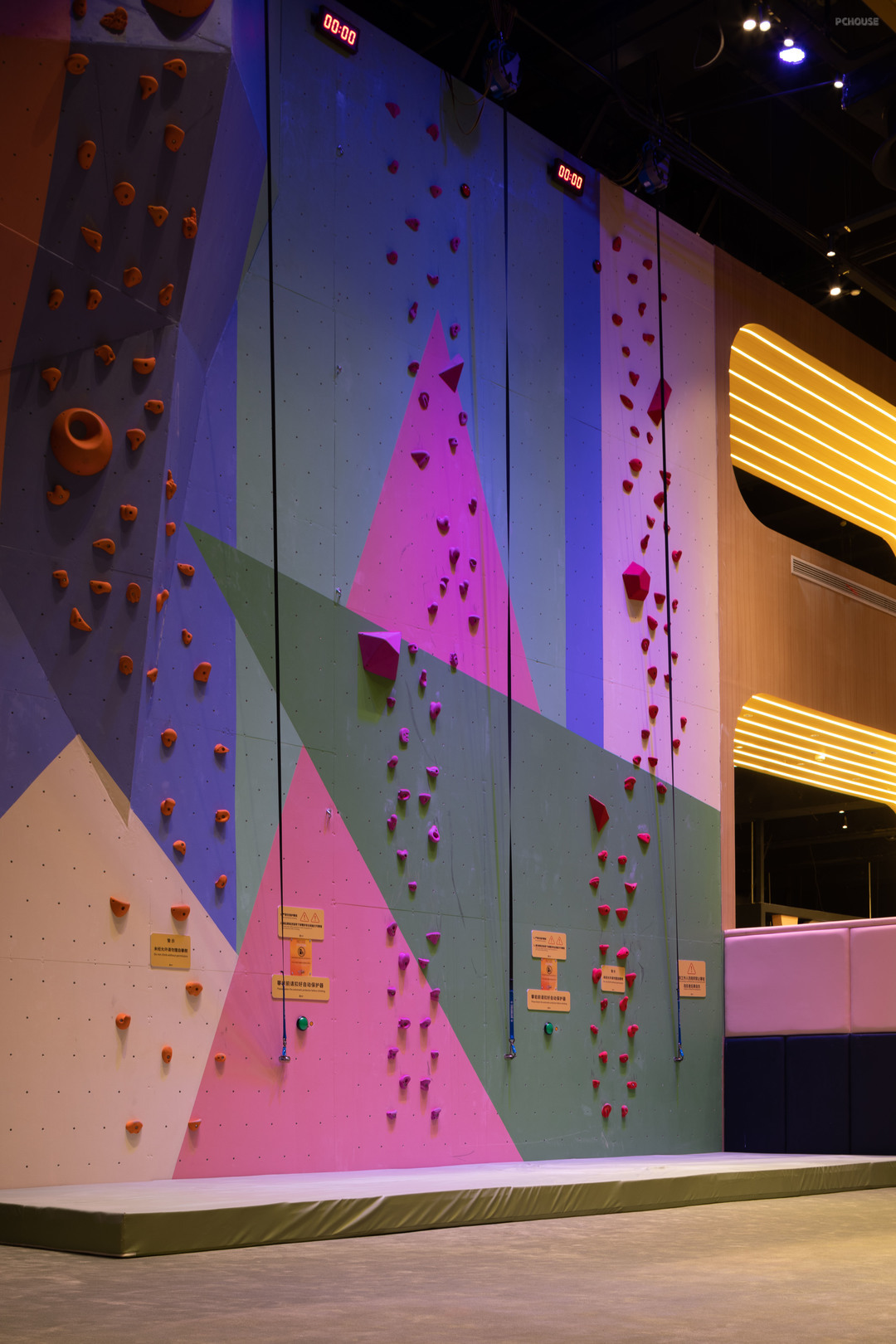 前言: BomBomSpace弹力猩球超级运动中心,位于杭州大悦城购物中心的8层,两个中庭之间。内部使用空间11米高,独特的“几”字型平面格局,与外立面作延展,我们打开周围所有视线,强化视觉吸引力,使沿着中庭的区域形成重要的视觉展示面。整个空间被划分成左、中、右三个部分,中部通高,左右两侧区域的半空中是一片钢结构梁体构成的骨架网格。所以,方形、网络,可堆叠,可延展,可变化的立方体,也就渐渐在我脑海里浮现。 猩球概念的创作是基于广袤无垠的星际空间,结合空间中的钢骨架网格,产生了联系和无尽的变化,于是“猩际魔方”这个概念也就诞生了。 整个外展面,我们以画框为基础,魔方元素作为基石,将立面空间作出划分。通过大量拱形门洞,作为穿越星空,连接宇宙空间的媒介。高空区域的每幅画的窗口,都做了拱形门洞的连续化处理,使其完整且具备神秘感,扩大了整个外展面的视觉联动效果。连续的拱形门洞,看似是门,也是窗,更是构成了守护整个猩球的城墙,称之“猩城之门”。每个门洞的下方做了延伸处理,伸出的部分演变成每一个小魔方,底部加入的灯具,展示出魔方飞行器的效果,也点缀了照明。在空间内部,我们用光带将空间的两侧做成了时空隧道的窗洞,来营造更丰富的星际空间,也是对未知和探索精神的表达。 悬浮在空中的巨大logo,装入了透明的立方体中,用光将它和其他的立方体相连接,用以阐述世间万物的诞生,演变和生生不息。 我们运用魔方的变化能力,将魔方放大,缩小,飞天,入墙。融合进货架、导台、座位、墙面装饰、空中装置等等,几乎一切,都是魔方构成。由多个独立的大魔方构成的前台,每一个都是独立体,通过发光的能量光柱,连接成一个整体。 “魔方天柱”,零售的货架是用一个个小魔方连接构成的盒子所形成的两根柱子,拔地而起,顶天立地。同时,在黑暗空中,由多个分离又相互连接的小魔方,构成一艘大的魔方飞船,守卫猩空。象征着时光穿梭的冰蓝色光带,贯穿着整个换鞋空间,一直延伸到游玩区的入口。空中,零散地放置了几个魔方演变的多面体飞行器,作为空中卫士,守卫猩球的时空隧道。游玩区的入口,通过搭建一排拱形门洞,来划分公共区域和洞穴探险区,来表达空间的穿梭与变化。拱形门洞,也代表着一扇扇时空之门,屹立于虚空中。 猩际舞台区是由许多立方体矩阵和弯曲的立方柱所构成的,是对宇宙能量敬畏的表达。星际间,强大的引力,可以托起一个个星球,使得星际空间内的一切可以井然有序地排列运作,超强的引力同