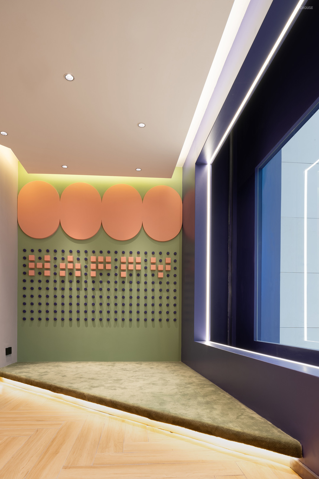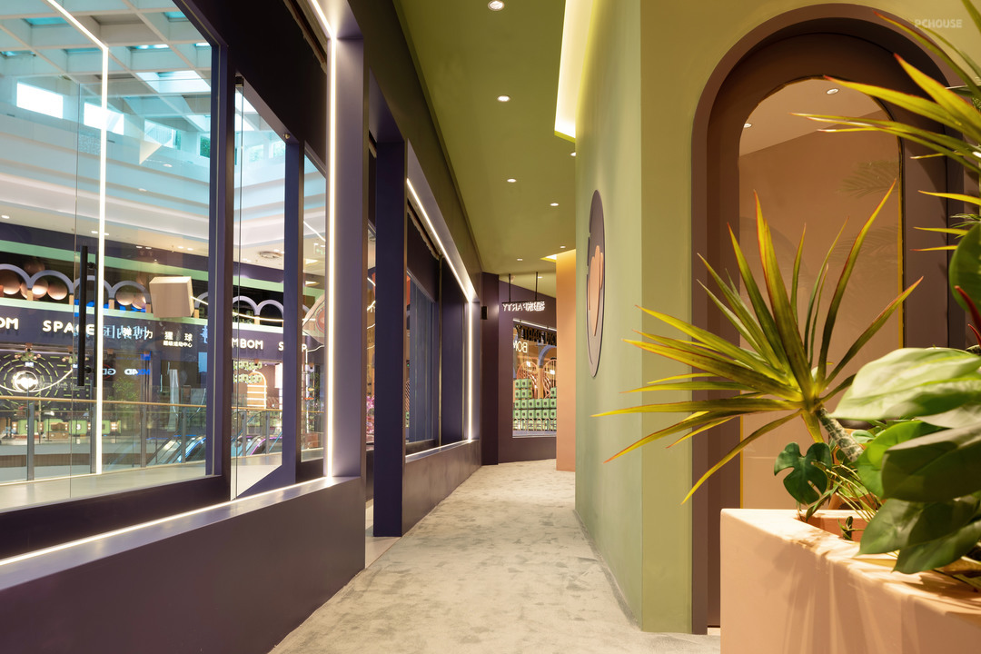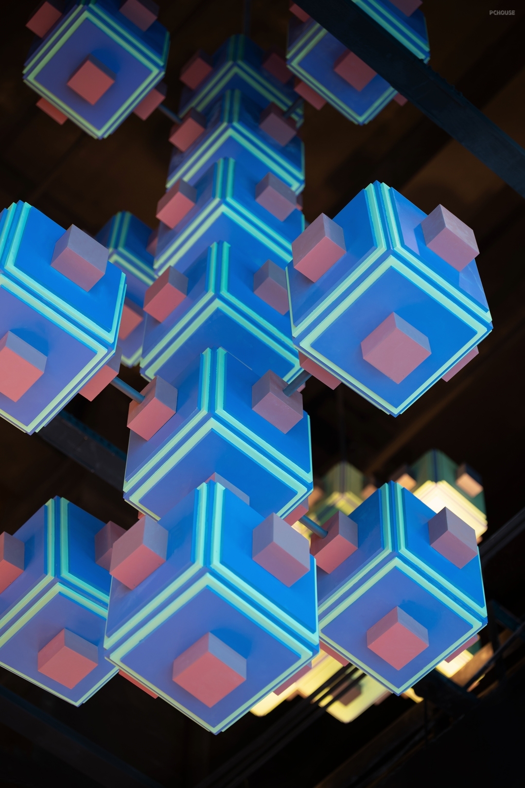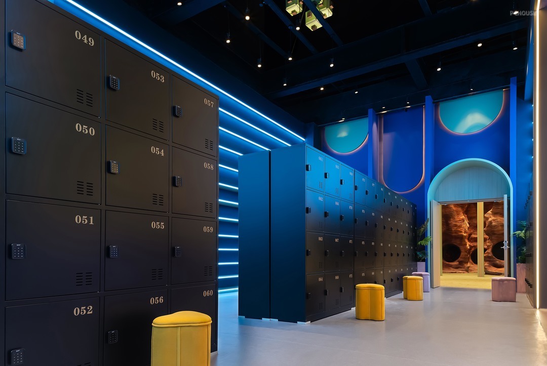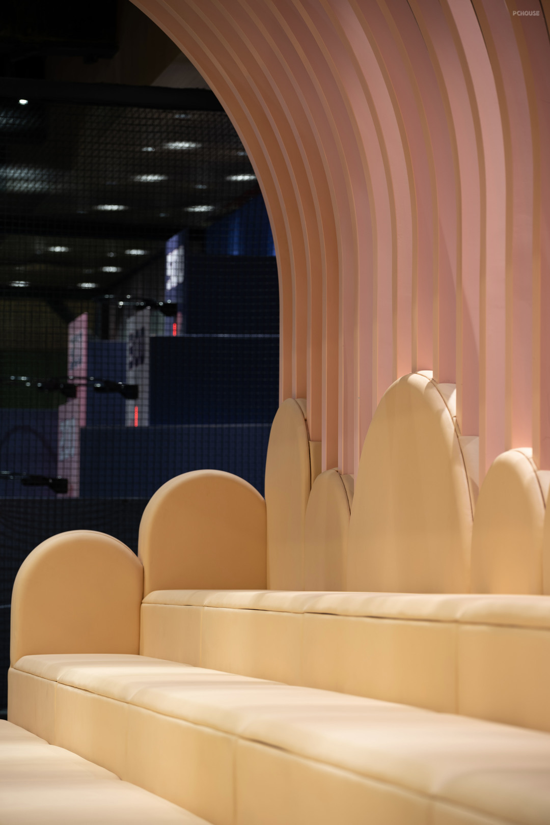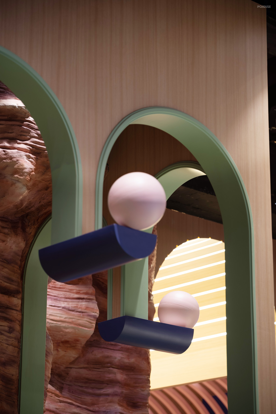 前言: BomBomSpace弹力猩球超级运动中心,位于杭州大悦城购物中心的8层,两个中庭之间。内部使用空间11米高,独特的“几”字型平面格局,与外立面作延展,我们打开周围所有视线,强化视觉吸引力,使沿着中庭的区域形成重要的视觉展示面。整个空间被划分成左、中、右三个部分,中部通高,左右两侧区域的半空中是一片钢结构梁体构成的骨架网格。所以,方形、网络,可堆叠,可延展,可变化的立方体,也就渐渐在我脑海里浮现。 猩球概念的创作是基于广袤无垠的星际空间,结合空间中的钢骨架网格,产生了联系和无尽的变化,于是“猩际魔方”这个概念也就诞生了。 整个外展面,我们以画框为基础,魔方元素作为基石,将立面空间作出划分。通过大量拱形门洞,作为穿越星空,连接宇宙空间的媒介。高空区域的每幅画的窗口,都做了拱形门洞的连续化处理,使其完整且具备神秘感,扩大了整个外展面的视觉联动效果。连续的拱形门洞,看似是门,也是窗,更是构成了守护整个猩球的城墙,称之“猩城之门”。每个门洞的下方做了延伸处理,伸出的部分演变成每一个小魔方,底部加入的灯具,展示出魔方飞行器的效果,也点缀了照明。在空间内部,我们用光带将空间的两侧做成了时空隧道的窗洞,来营造更丰富的星际空间,也是对未知和探索精神的表达。 悬浮在空中的巨大logo,装入了透明的立方体中,用光将它和其他的立方体相连接,用以阐述世间万物的诞生,演变和生生不息。 我们运用魔方的变化能力,将魔方放大,缩小,飞天,入墙。融合进货架、导台、座位、墙面装饰、空中装置等等,几乎一切,都是魔方构成。由多个独立的大魔方构成的前台,每一个都是独立体,通过发光的能量光柱,连接成一个整体。 “魔方天柱”,零售的货架是用一个个小魔方连接构成的盒子所形成的两根柱子,拔地而起,顶天立地。同时,在黑暗空中,由多个分离又相互连接的小魔方,构成一艘大的魔方飞船,守卫猩空。象征着时光穿梭的冰蓝色光带,贯穿着整个换鞋空间,一直延伸到游玩区的入口。空中,零散地放置了几个魔方演变的多面体飞行器,作为空中卫士,守卫猩球的时空隧道。游玩区的入口,通过搭建一排拱形门洞,来划分公共区域和洞穴探险区,来表达空间的穿梭与变化。拱形门洞,也代表着一扇扇时空之门,屹立于虚空中。 猩际舞台区是由许多立方体矩阵和弯曲的立方柱所构成的,是对宇宙能量敬畏的表达。星际间,强大的引力,可以托起一个个星球,使得星际空间内的一切可以井然有序地排列运作,超强的引力同