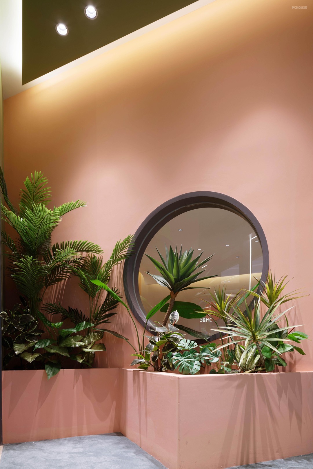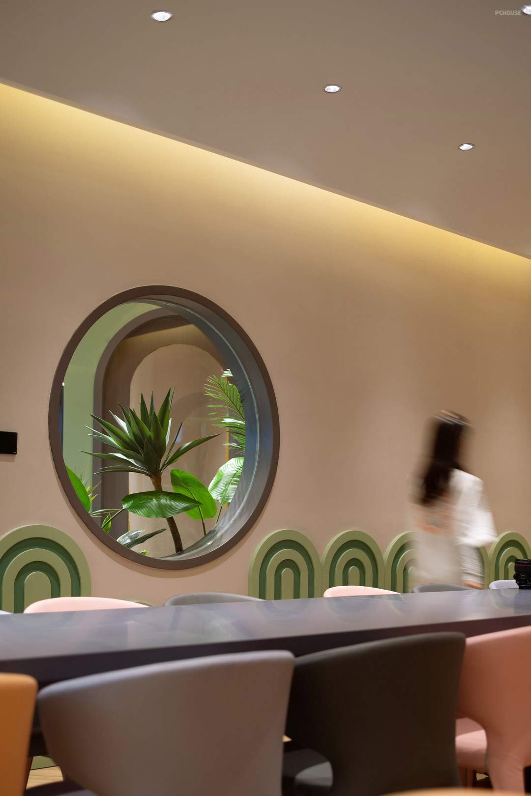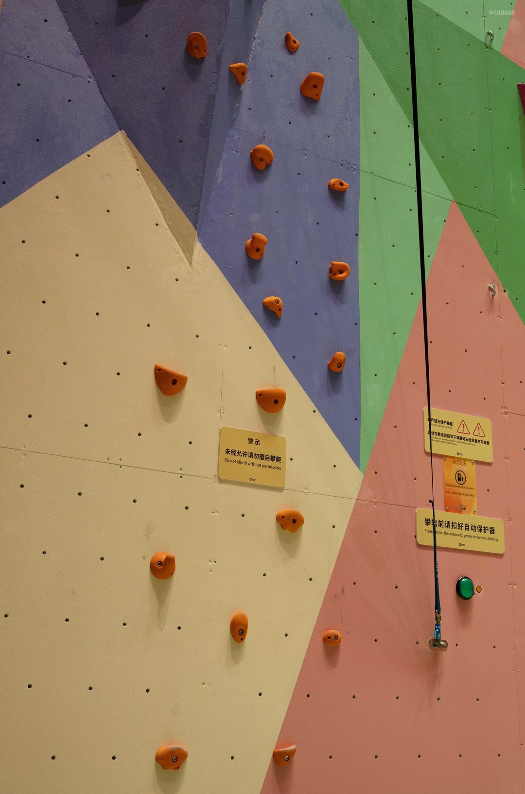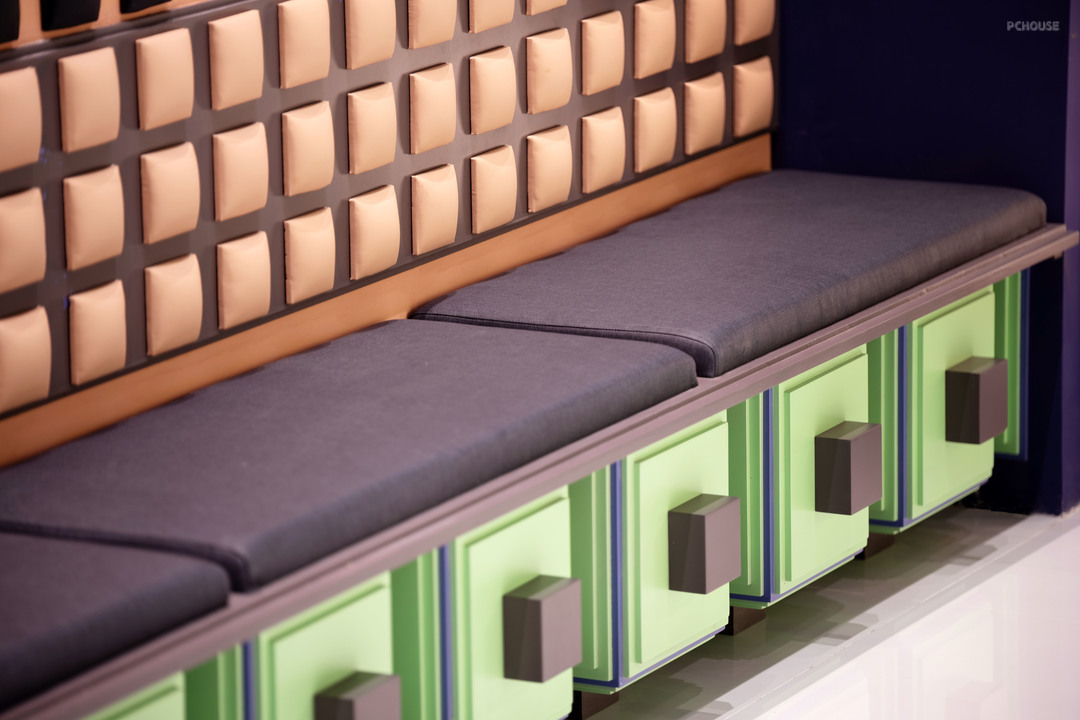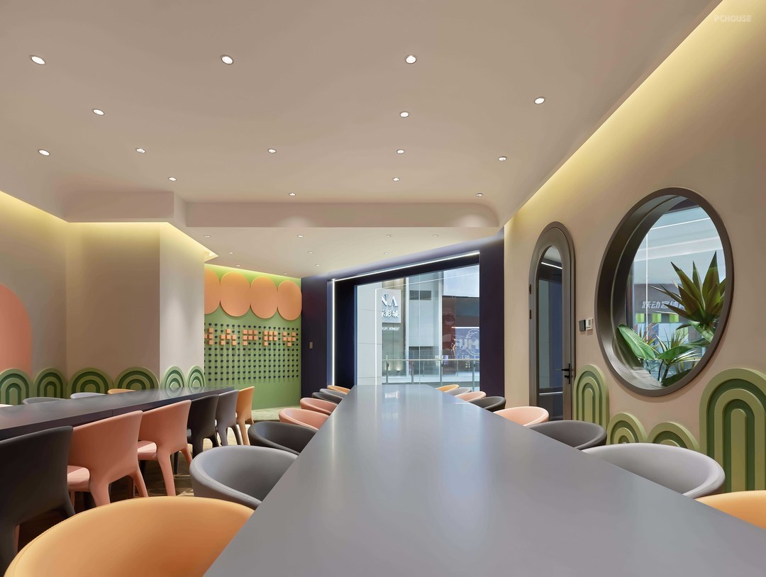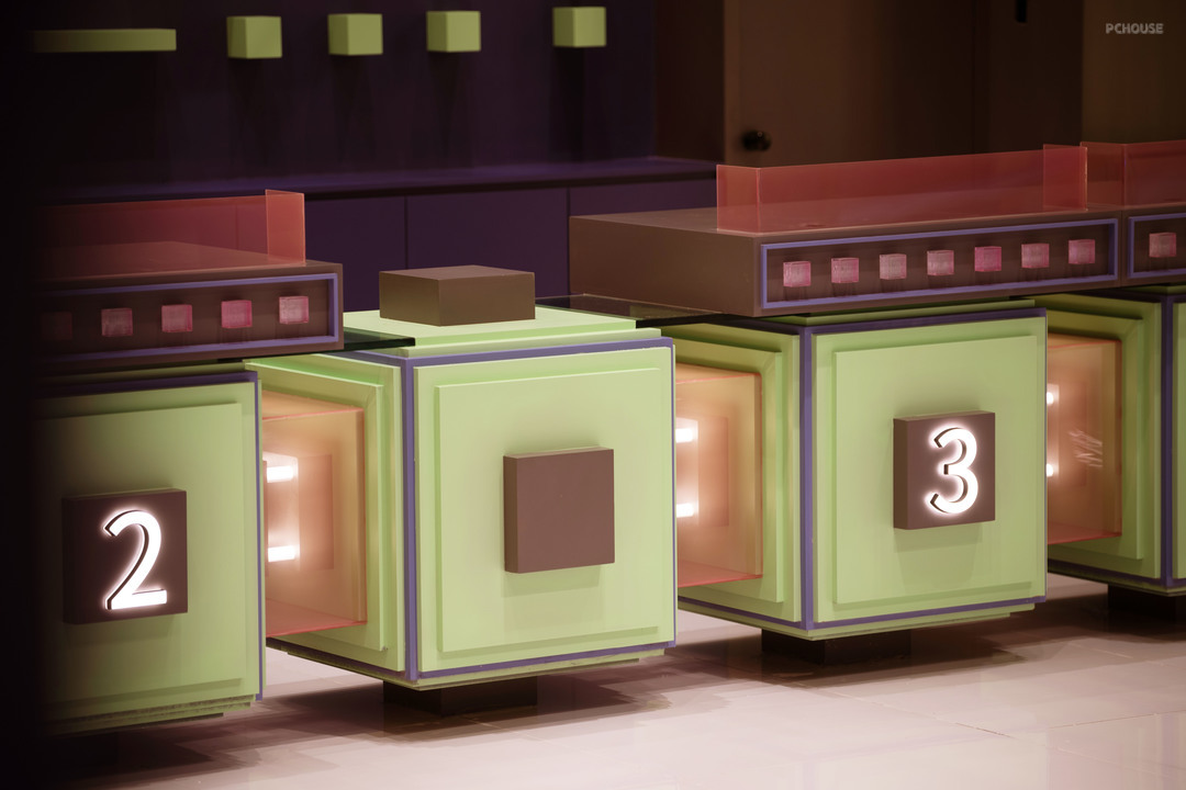 前言: BomBomSpace弹力猩球超级运动中心,位于杭州大悦城购物中心的8层,两个中庭之间。内部使用空间11米高,独特的“几”字型平面格局,与外立面作延展,我们打开周围所有视线,强化视觉吸引力,使沿着中庭的区域形成重要的视觉展示面。整个空间被划分成左、中、右三个部分,中部通高,左右两侧区域的半空中是一片钢结构梁体构成的骨架网格。所以,方形、网络,可堆叠,可延展,可变化的立方体,也就渐渐在我脑海里浮现。 猩球概念的创作是基于广袤无垠的星际空间,结合空间中的钢骨架网格,产生了联系和无尽的变化,于是“猩际魔方”这个概念也就诞生了。 整个外展面,我们以画框为基础,魔方元素作为基石,将立面空间作出划分。通过大量拱形门洞,作为穿越星空,连接宇宙空间的媒介。高空区域的每幅画的窗口,都做了拱形门洞的连续化处理,使其完整且具备神秘感,扩大了整个外展面的视觉联动效果。连续的拱形门洞,看似是门,也是窗,更是构成了守护整个猩球的城墙,称之“猩城之门”。每个门洞的下方做了延伸处理,伸出的部分演变成每一个小魔方,底部加入的灯具,展示出魔方飞行器的效果,也点缀了照明。在空间内部,我们用光带将空间的两侧做成了时空隧道的窗洞,来营造更丰富的星际空间,也是对未知和探索精神的表达。 悬浮在空中的巨大logo,装入了透明的立方体中,用光将它和其他的立方体相连接,用以阐述世间万物的诞生,演变和生生不息。 我们运用魔方的变化能力,将魔方放大,缩小,飞天,入墙。融合进货架、导台、座位、墙面装饰、空中装置等等,几乎一切,都是魔方构成。由多个独立的大魔方构成的前台,每一个都是独立体,通过发光的能量光柱,连接成一个整体。 “魔方天柱”,零售的货架是用一个个小魔方连接构成的盒子所形成的两根柱子,拔地而起,顶天立地。同时,在黑暗空中,由多个分离又相互连接的小魔方,构成一艘大的魔方飞船,守卫猩空。象征着时光穿梭的冰蓝色光带,贯穿着整个换鞋空间,一直延伸到游玩区的入口。空中,零散地放置了几个魔方演变的多面体飞行器,作为空中卫士,守卫猩球的时空隧道。游玩区的入口,通过搭建一排拱形门洞,来划分公共区域和洞穴探险区,来表达空间的穿梭与变化。拱形门洞,也代表着一扇扇时空之门,屹立于虚空中。 猩际舞台区是由许多立方体矩阵和弯曲的立方柱所构成的,是对宇宙能量敬畏的表达。星际间,强大的引力,可以托起一个个星球,使得星际空间内的一切可以井然有序地排列运作,超强的引力同