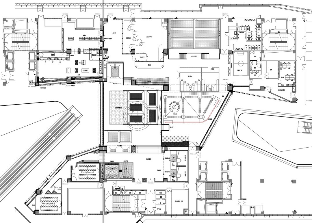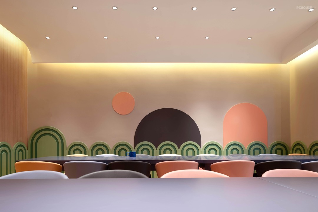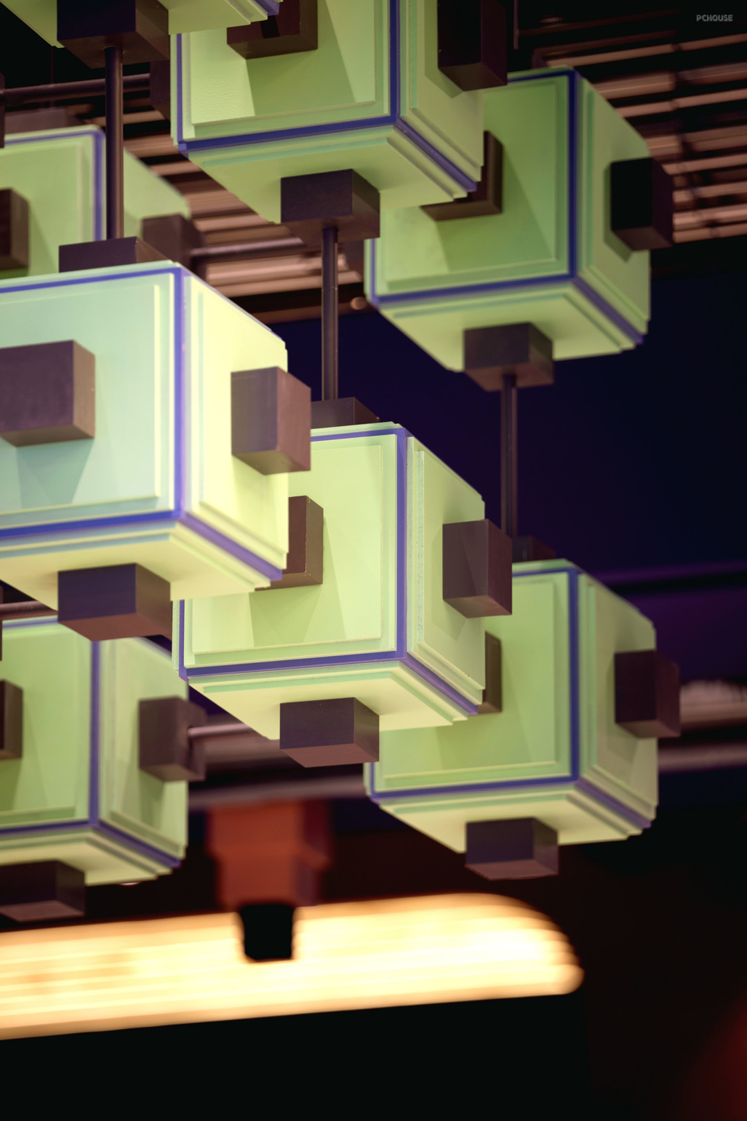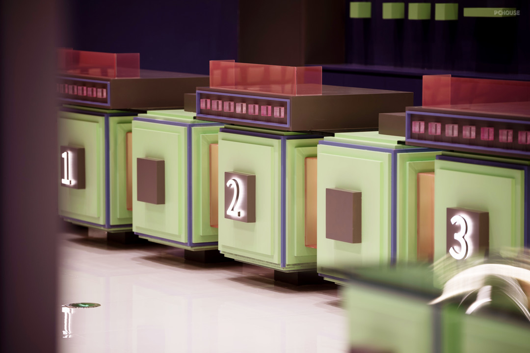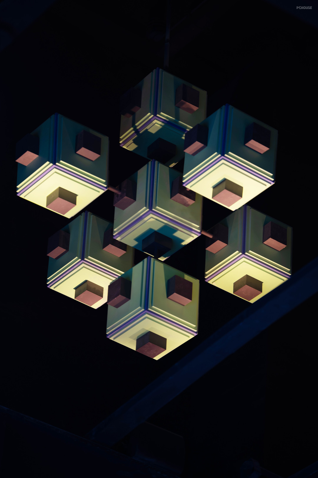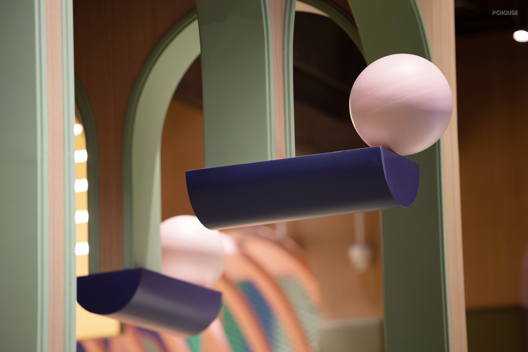 前言: BomBomSpace弹力猩球超级运动中心,位于杭州大悦城购物中心的8层,两个中庭之间。内部使用空间11米高,独特的“几”字型平面格局,与外立面作延展,我们打开周围所有视线,强化视觉吸引力,使沿着中庭的区域形成重要的视觉展示面。整个空间被划分成左、中、右三个部分,中部通高,左右两侧区域的半空中是一片钢结构梁体构成的骨架网格。所以,方形、网络,可堆叠,可延展,可变化的立方体,也就渐渐在我脑海里浮现。 猩球概念的创作是基于广袤无垠的星际空间,结合空间中的钢骨架网格,产生了联系和无尽的变化,于是“猩际魔方”这个概念也就诞生了。 整个外展面,我们以画框为基础,魔方元素作为基石,将立面空间作出划分。通过大量拱形门洞,作为穿越星空,连接宇宙空间的媒介。高空区域的每幅画的窗口,都做了拱形门洞的连续化处理,使其完整且具备神秘感,扩大了整个外展面的视觉联动效果。连续的拱形门洞,看似是门,也是窗,更是构成了守护整个猩球的城墙,称之“猩城之门”。每个门洞的下方做了延伸处理,伸出的部分演变成每一个小魔方,底部加入的灯具,展示出魔方飞行器的效果,也点缀了照明。在空间内部,我们用光带将空间的两侧做成了时空隧道的窗洞,来营造更丰富的星际空间,也是对未知和探索精神的表达。 悬浮在空中的巨大logo,装入了透明的立方体中,用光将它和其他的立方体相连接,用以阐述世间万物的诞生,演变和生生不息。 我们运用魔方的变化能力,将魔方放大,缩小,飞天,入墙。融合进货架、导台、座位、墙面装饰、空中装置等等,几乎一切,都是魔方构成。由多个独立的大魔方构成的前台,每一个都是独立体,通过发光的能量光柱,连接成一个整体。 “魔方天柱”,零售的货架是用一个个小魔方连接构成的盒子所形成的两根柱子,拔地而起,顶天立地。同时,在黑暗空中,由多个分离又相互连接的小魔方,构成一艘大的魔方飞船,守卫猩空。象征着时光穿梭的冰蓝色光带,贯穿着整个换鞋空间,一直延伸到游玩区的入口。空中,零散地放置了几个魔方演变的多面体飞行器,作为空中卫士,守卫猩球的时空隧道。游玩区的入口,通过搭建一排拱形门洞,来划分公共区域和洞穴探险区,来表达空间的穿梭与变化。拱形门洞,也代表着一扇扇时空之门,屹立于虚空中。 猩际舞台区是由许多立方体矩阵和弯曲的立方柱所构成的,是对宇宙能量敬畏的表达。星际间,强大的引力,可以托起一个个星球,使得星际空间内的一切可以井然有序地排列运作,超强的引力同