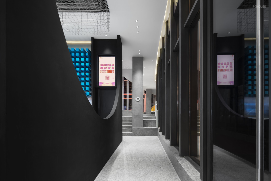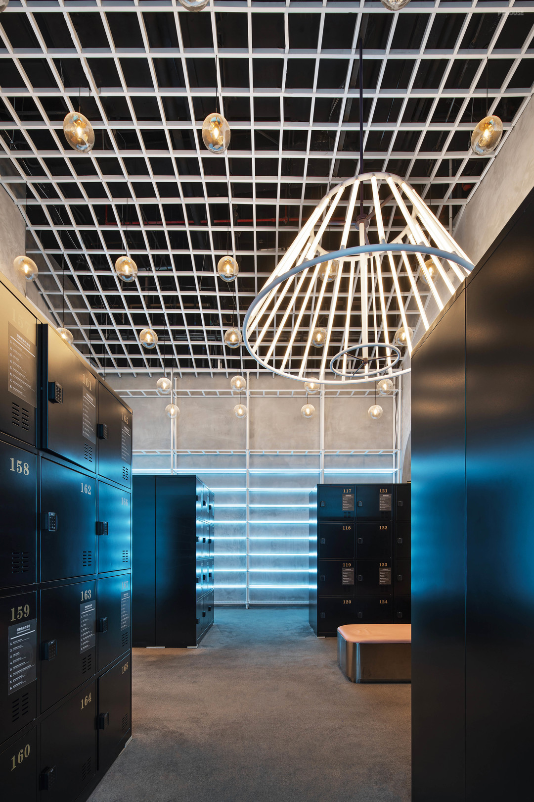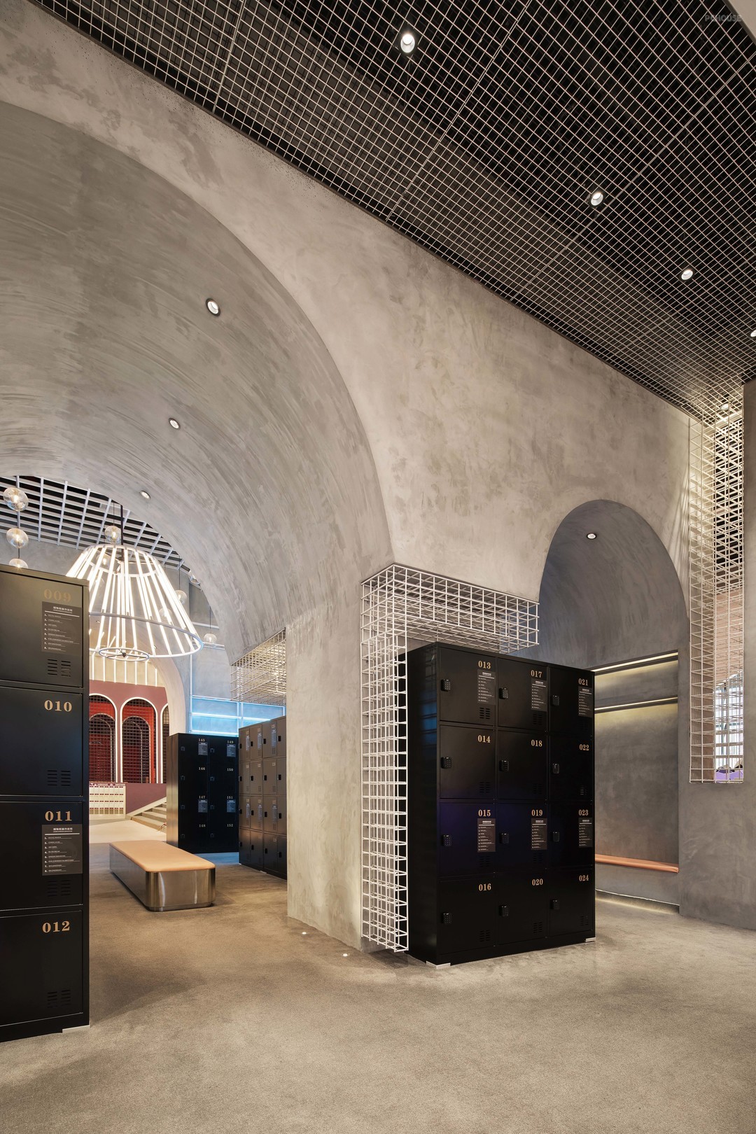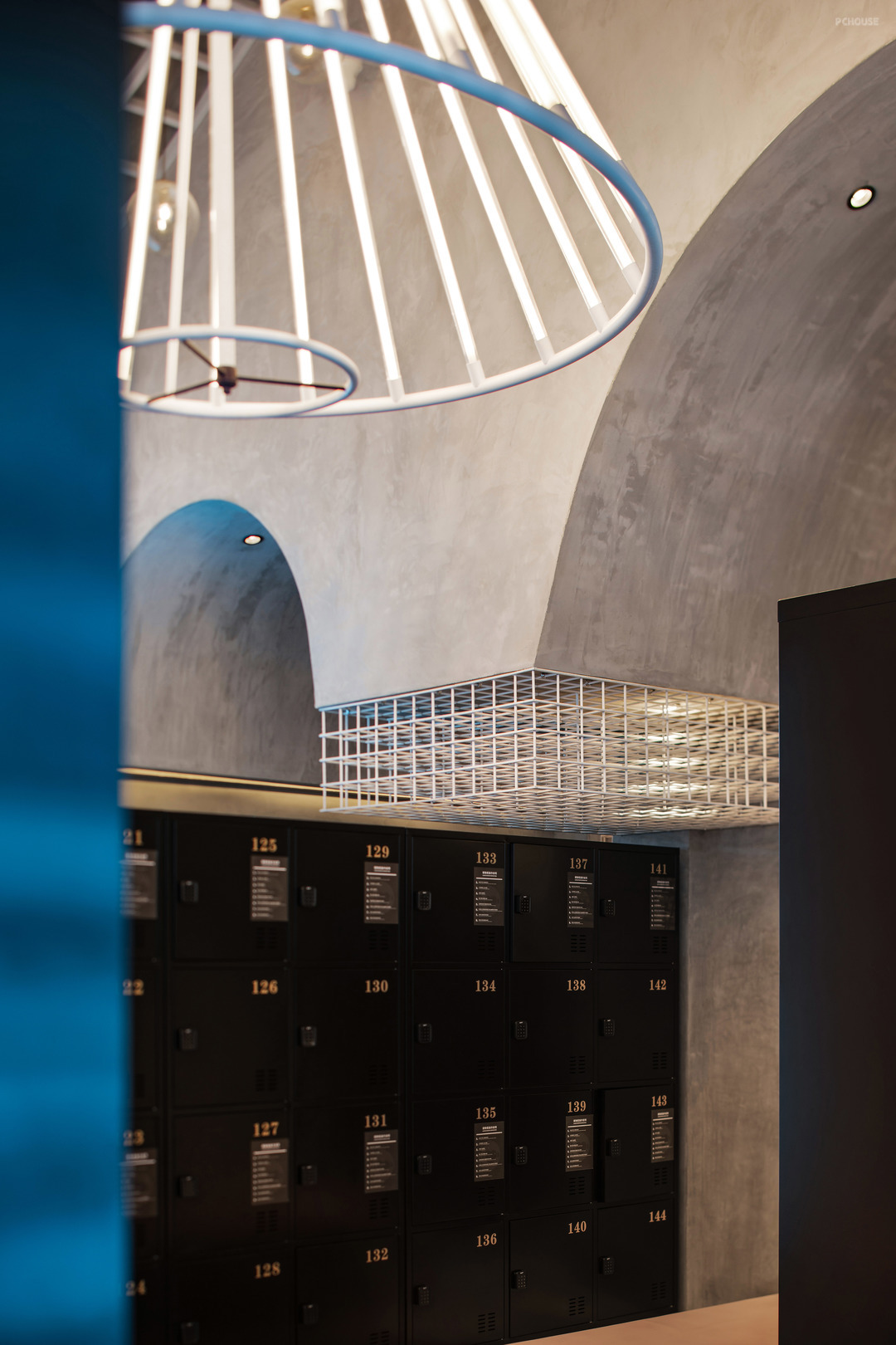形式上引用了一点点上海的本身气息,将上海特有的石库门、里弄符号极简化,在出入口的区域,以三个大小不同的拱洞来围合成我们最具特色的换鞋空间。为了表达时空的概念,我们选用颜色灰白且具有岁月斑驳纹理但又触感很细腻的混凝土艺术漆作为饰面,将白色的密集网格和墙体及拱洞结构的混凝土质地相融合,意在对建造过程的解析。墙面的货架和鞋架是以脚手架为原型,简化而生,白色,超白透明玻璃和冰蓝色线性灯带是对未来时空的反映。象征太空的黑色顶棚之下是白色网格造型,连接着墙面白色的脚手架(换鞋架),大尺寸的伞骨艺术灯,和象征一个个守护天体的球泡灯叠阵在空中,共同构建成一个时空交错的堡垒。