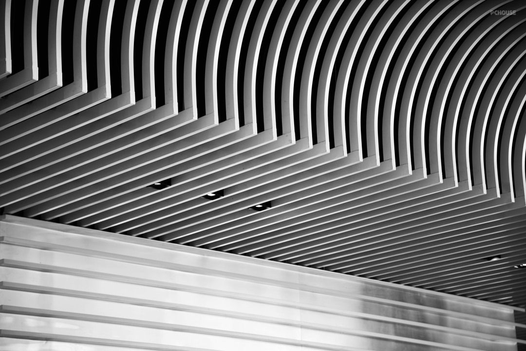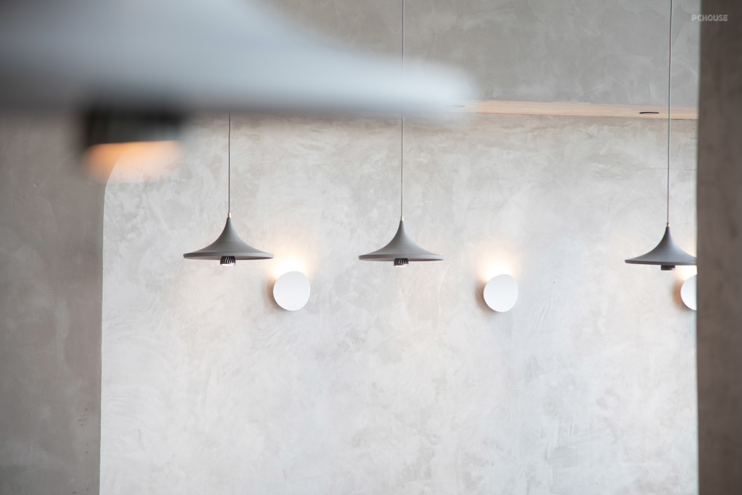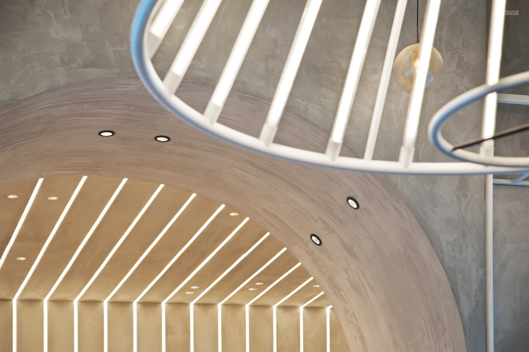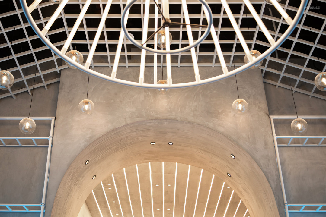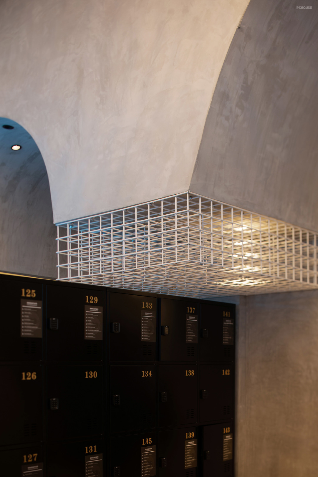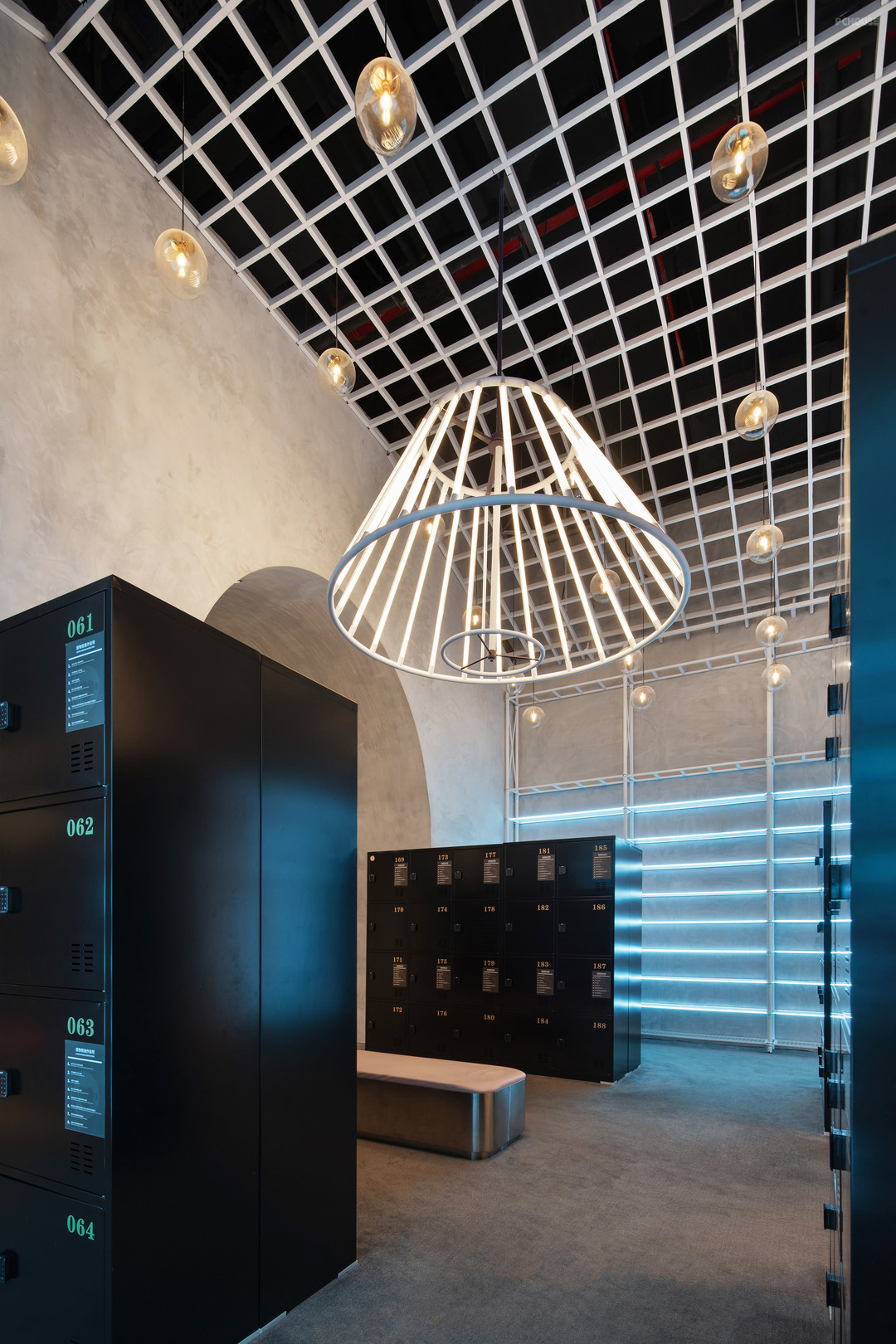 形式上引用了一点点上海的本身气息,将上海特有的石库门、里弄符号极简化,在出入口的区域,以三个大小不同的拱洞来围合成我们最具特色的换鞋空间。为了表达时空的概念,我们选用颜色灰白且具有岁月斑驳纹理但又触感很细腻的混凝土艺术漆作为饰面,将白色的密集网格和墙体及拱洞结构的混凝土质地相融合,意在对建造过程的解析。墙面的货架和鞋架是以脚手架为原型,简化而生,白色,超白透明玻璃和冰蓝色线性灯带是对未来时空的反映。象征太空的黑色顶棚之下是白色网格造型,连接着墙面白色的脚手架(换鞋架),大尺寸的伞骨艺术灯,和象征一个个守护天体的球泡灯叠阵在空中,共同构建成一个时空交错的堡垒。
