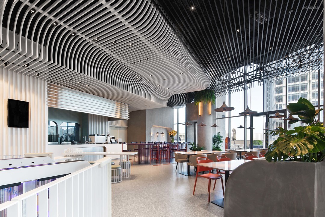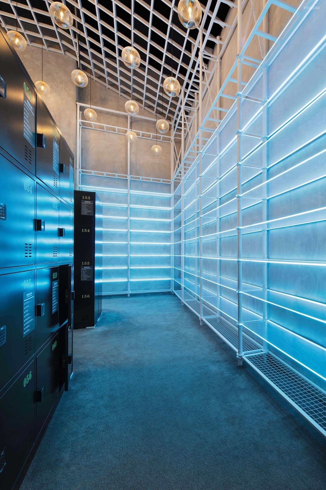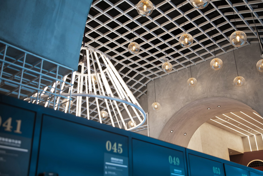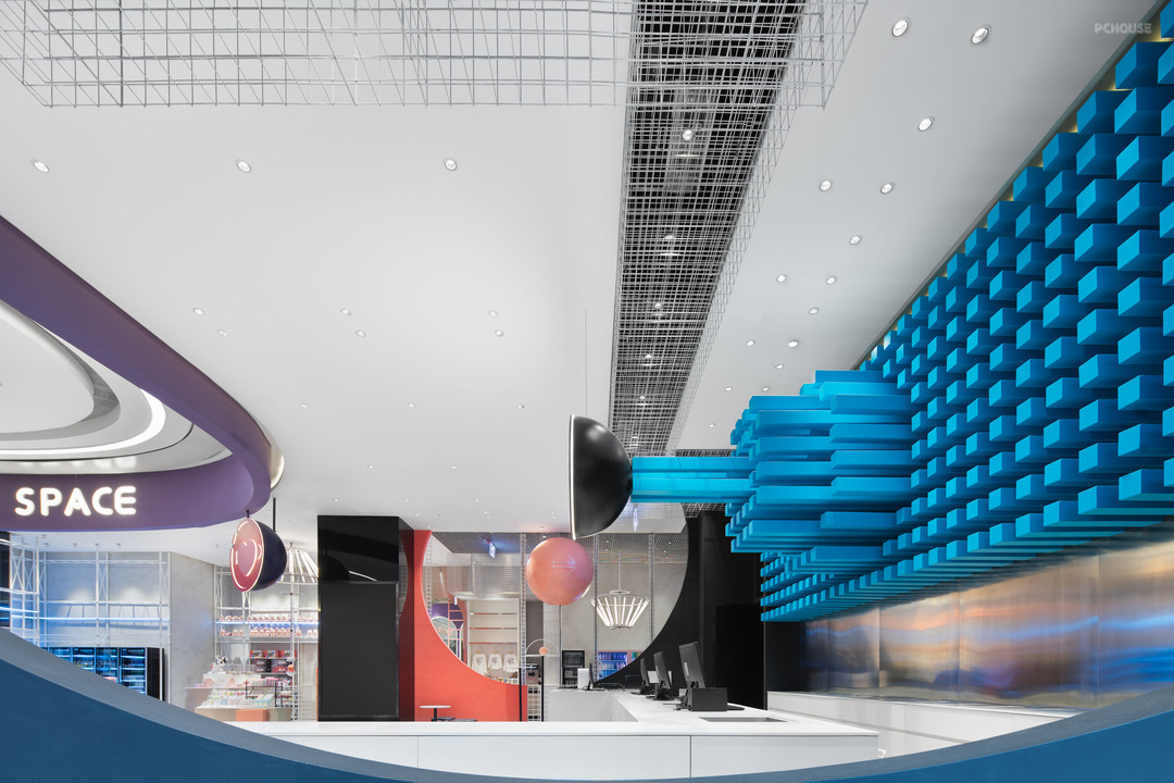 前台区域是类比了猩球外围宇宙的空间形态,与前台、出入口相连接的零售区则是以斑驳的墙面,网格,镜面,玻璃,本色的不锈钢,白色铁艺,暖色的伞骨灯叠加冰蓝色的线性光束,来打造一艘正在建造的猩球飞船的模样。