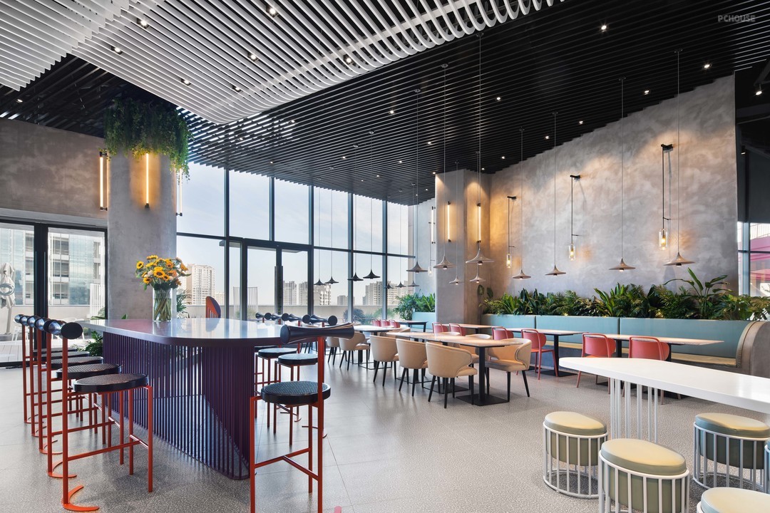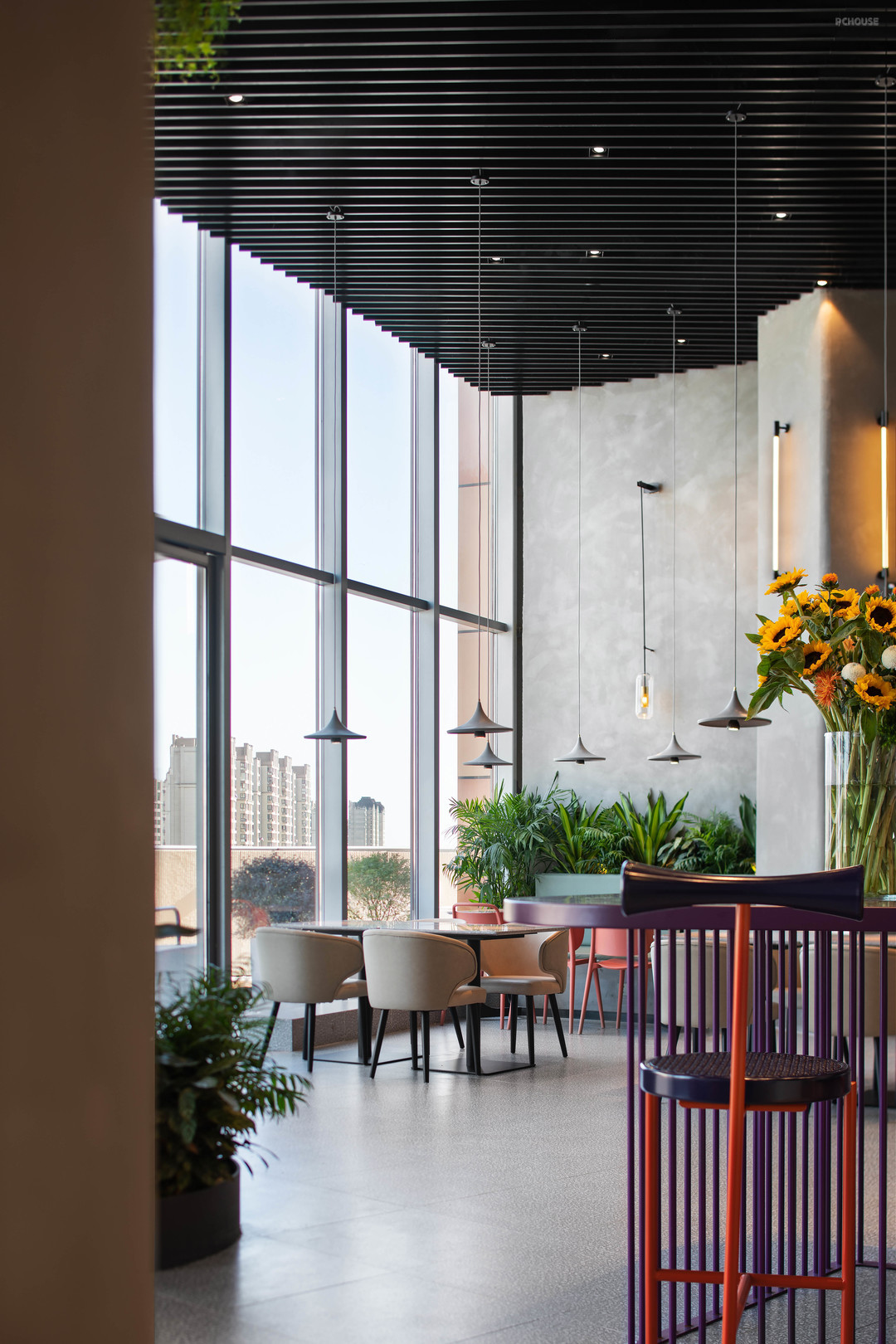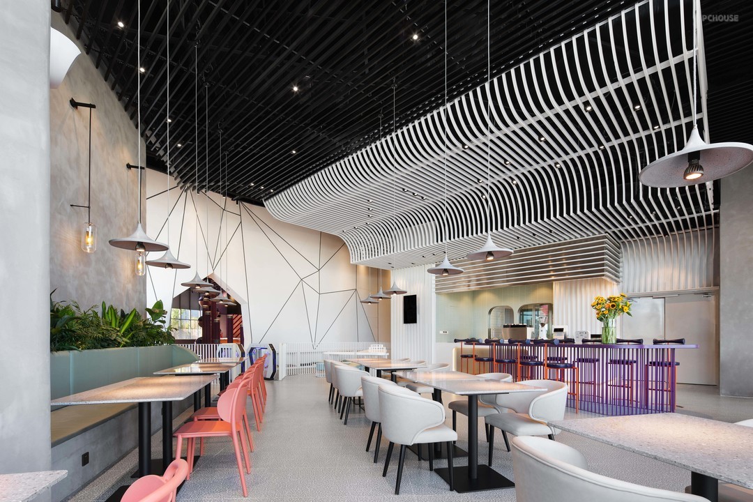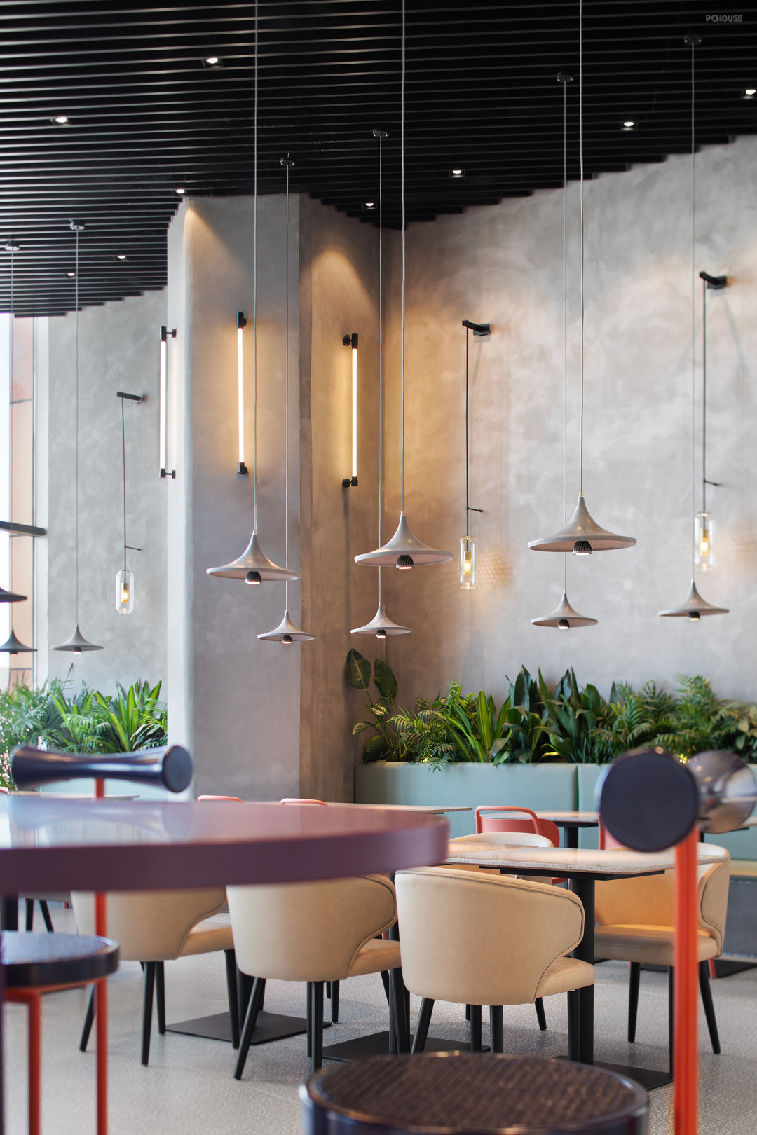 前台区域是类比了猩球外围宇宙的空间形态,与前台、出入口相连接的零售区则是以斑驳的墙面,网格,镜面,玻璃,本色的不锈钢,白色铁艺,暖色的伞骨灯叠加冰蓝色的线性光束,来打造一艘正在建造的猩球飞船的模样。