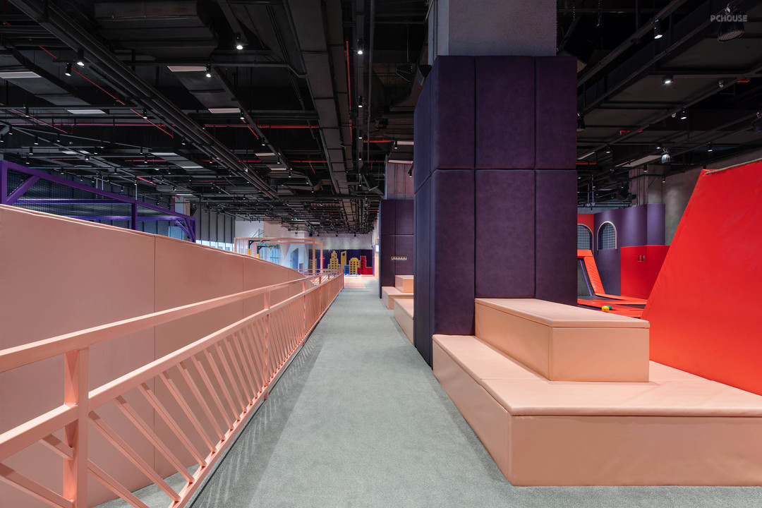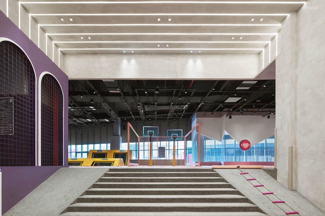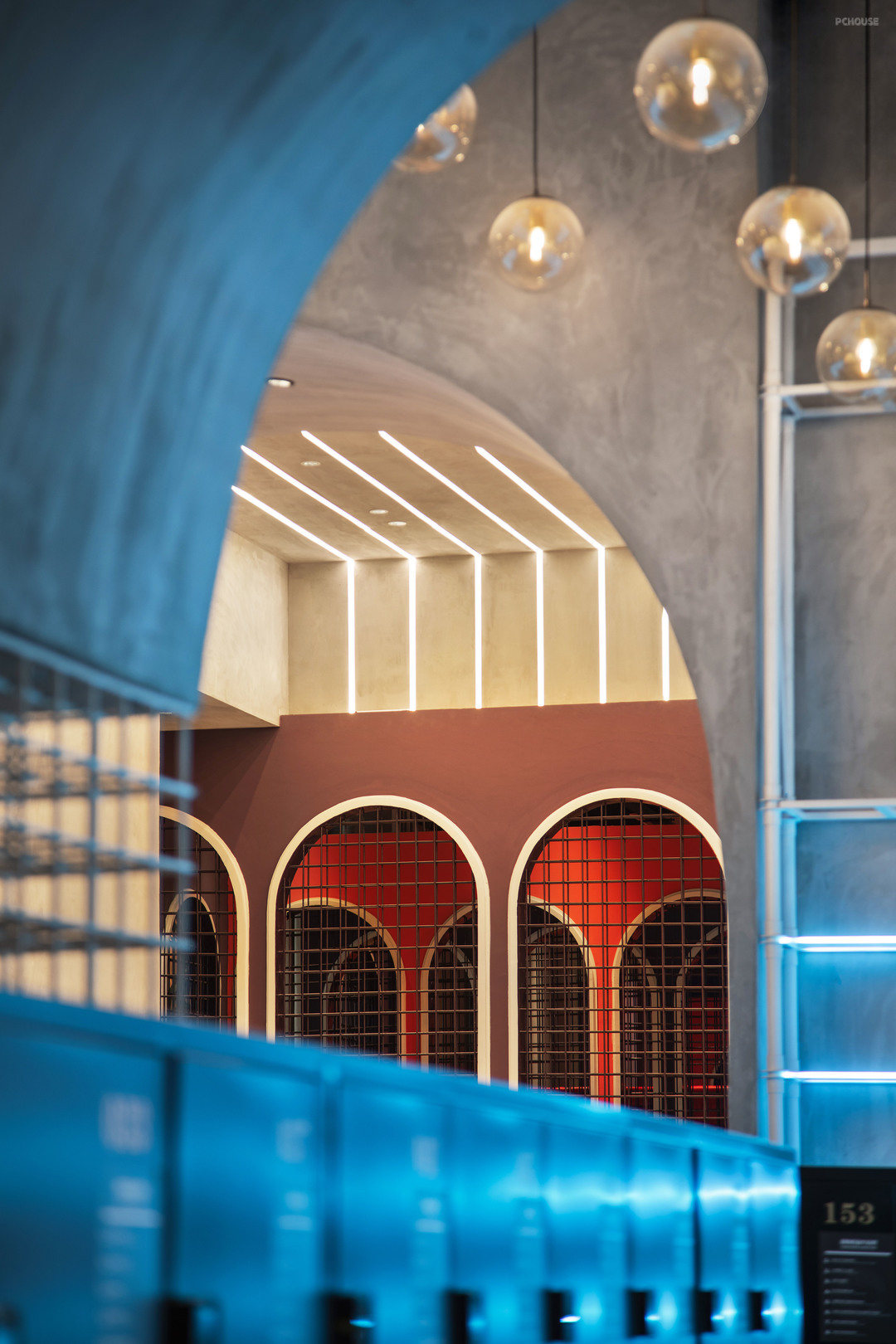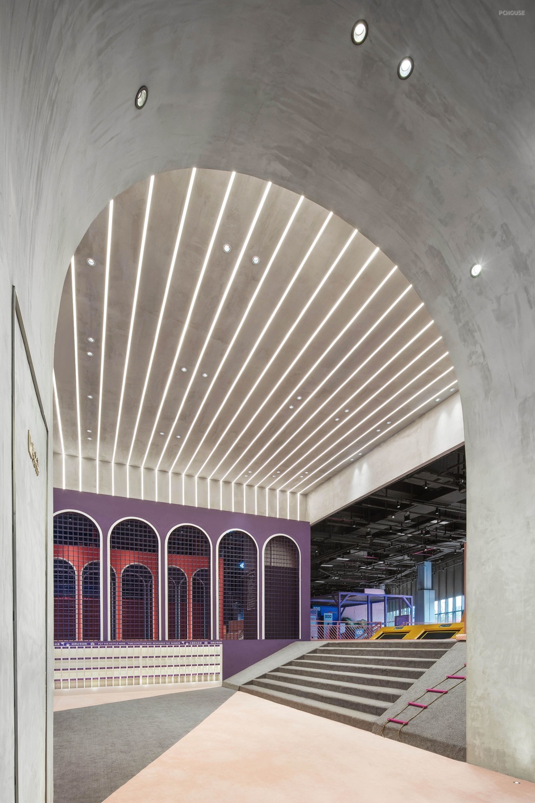 线性灯带也意为时空的穿梭,通过顶面线性灯带的指引进入方正的星空剧院,前后相互错叠贯穿的拱洞墙体将游玩