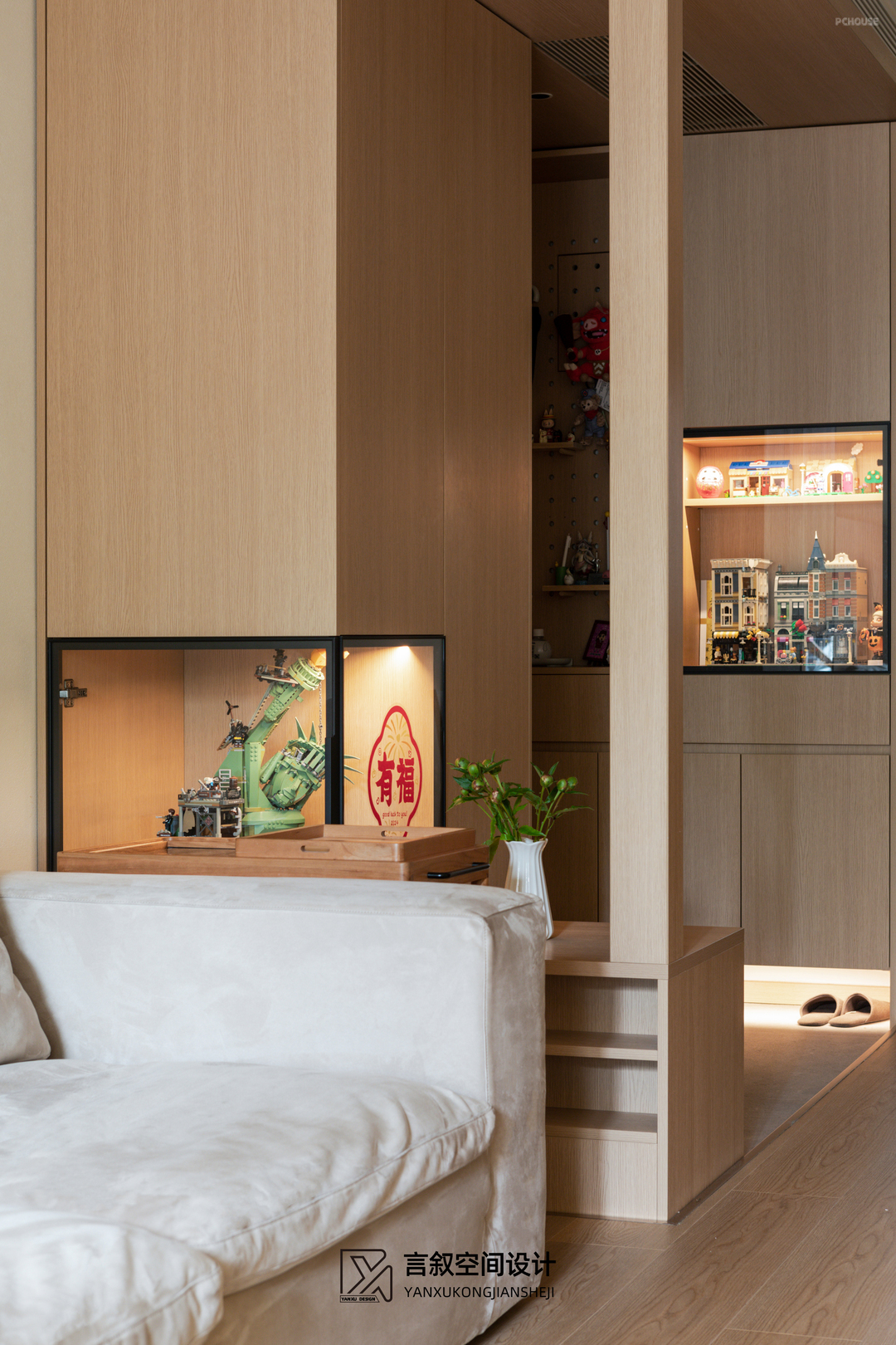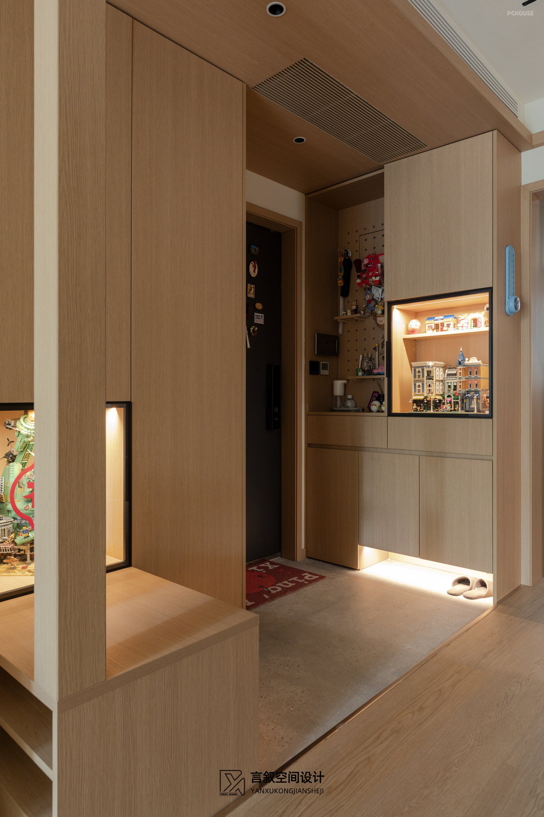 改动后的玄关两侧储物,对称美感,高低错落的展示柜让空间更松弛。