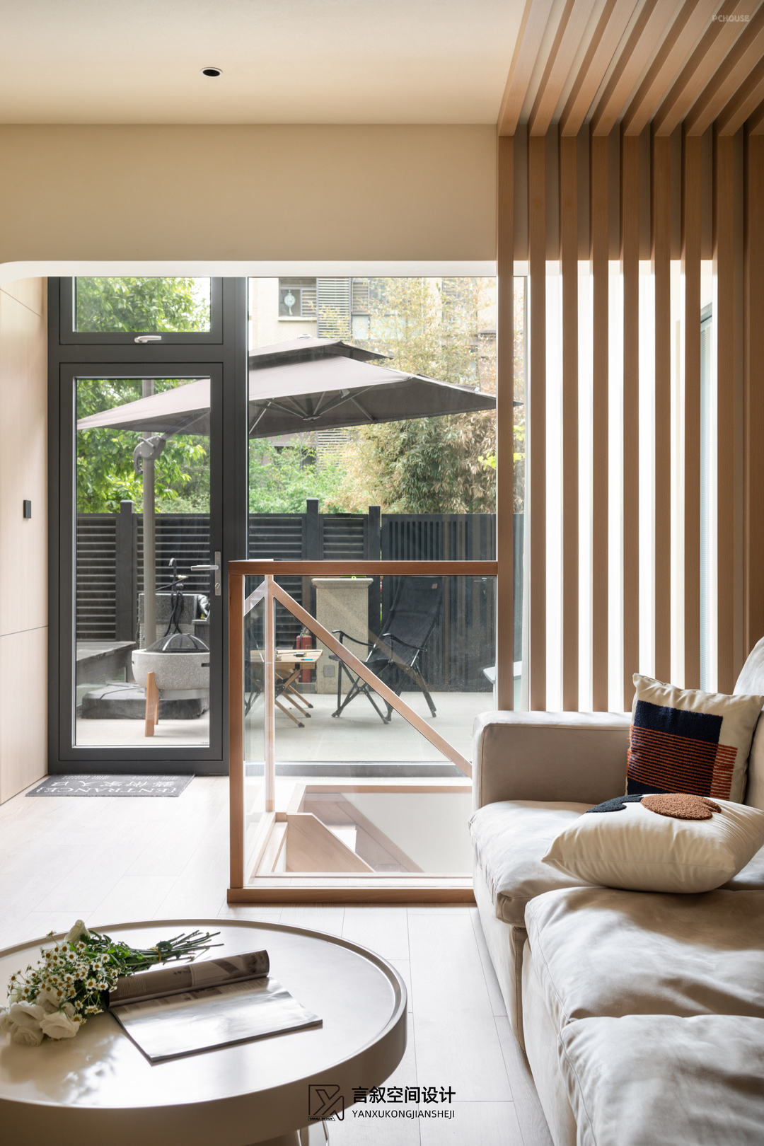 客厅外面是自家的小院儿,一把遮阳伞、两把露营椅,一方小桌,成为业主最舒适的吸烟区。喜欢露营地他们在院子里加设烧烤架,约三两好友,露营改为自家院子,热了还可以回屋吹吹空调,十分惬意享受~