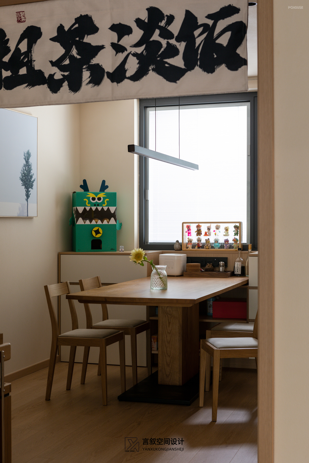 没有那么多卧室需求的业主将一间卧室 作为餐厅,半开放式的设计,用日式风的“粗茶淡饭”半帘,把就餐区变得更加精致。