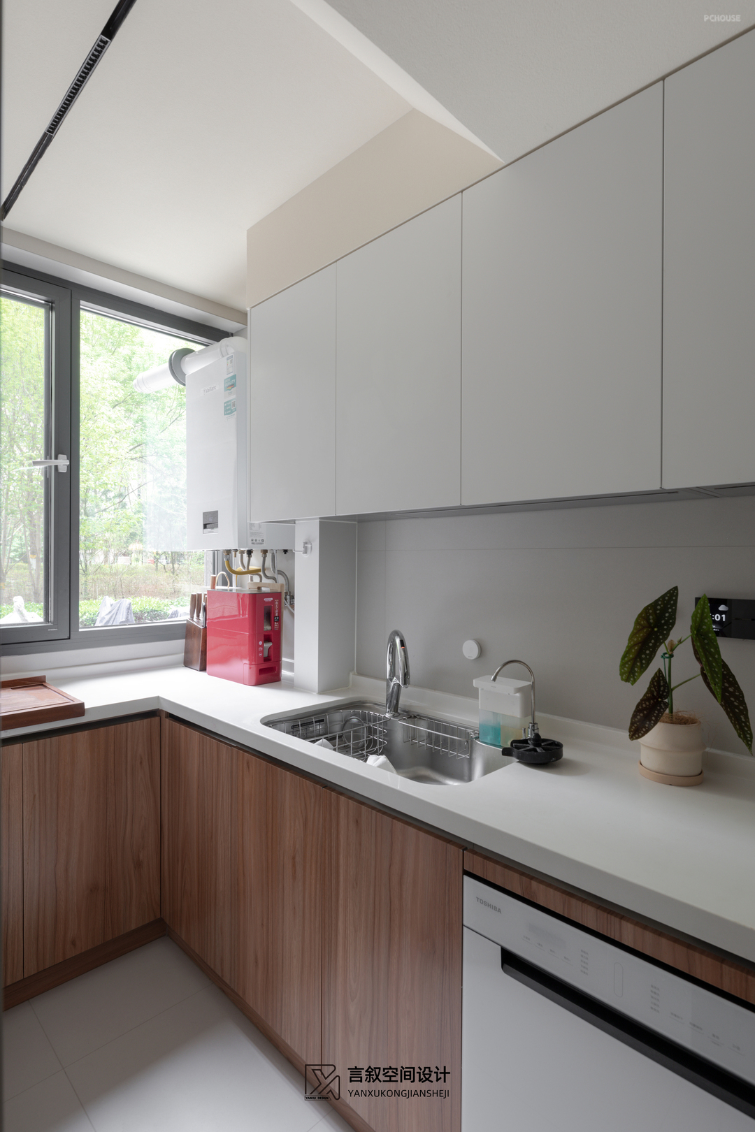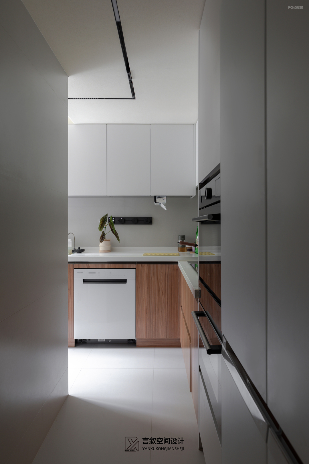 厨房内里全部做内嵌设计,转角包窗入户纳入自然光。轨道灯做主光,柜下配辅助照明,实用清爽,更加整洁。