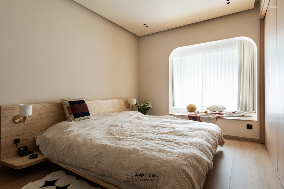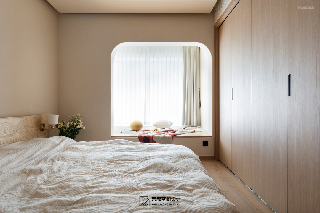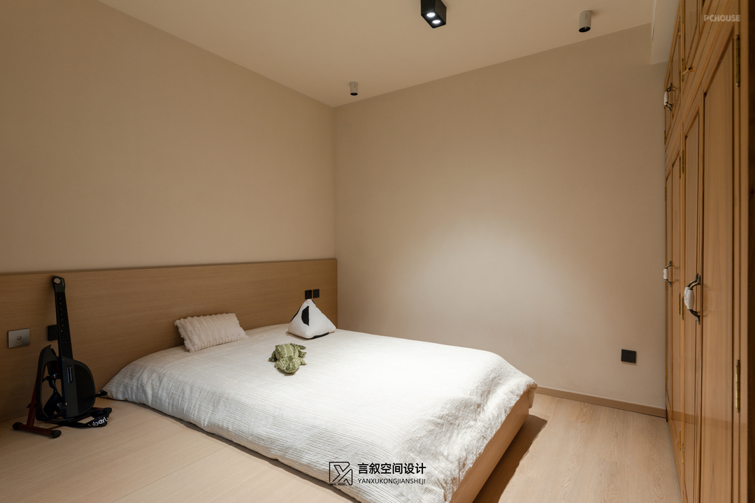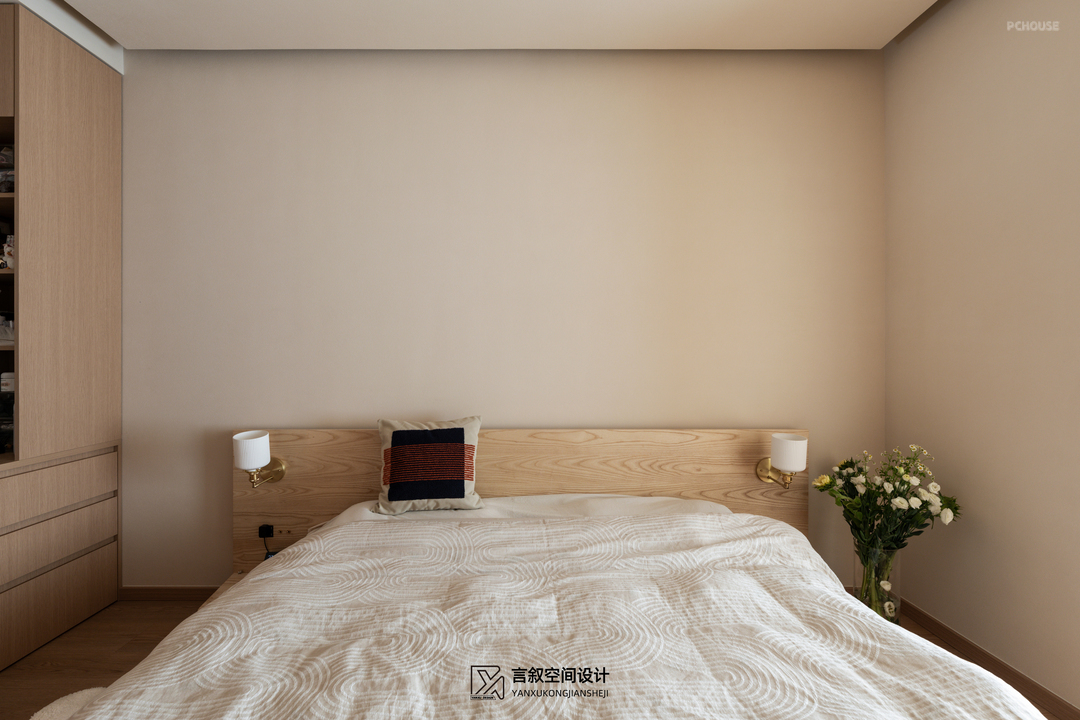 卧室的零压感更让人不自觉地全身心放松下来,床尾整面墙的储物空间设计与墙面融为一体,衣物可以有序归置的同时,空间依旧清新舒适。