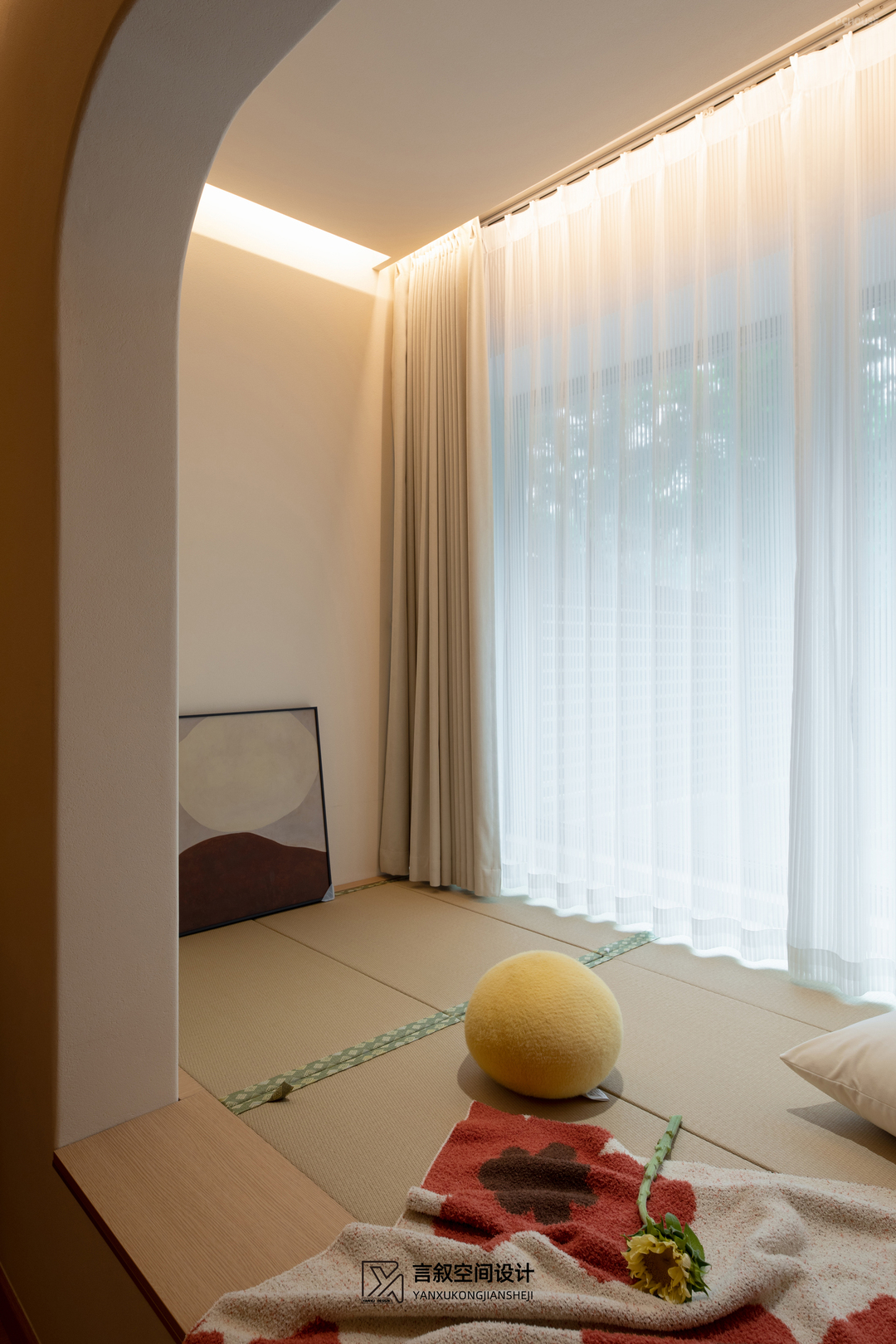 外扩进来的飘窗部分做榻榻米设计,日常晒太阳和品茶,偶尔看书工作,很是惬意。草席铺顶,下边中空储物,舒适又实用。