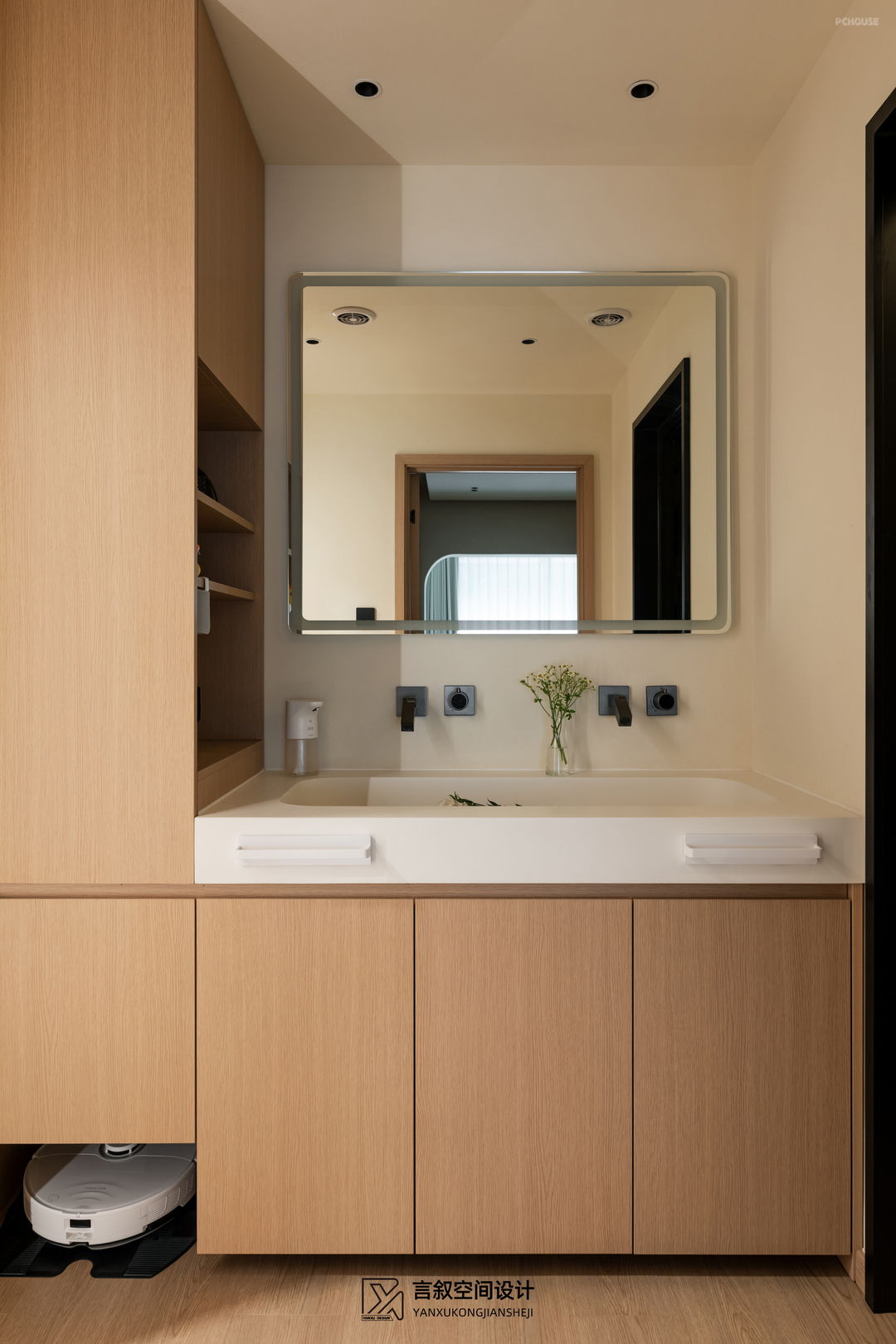 上柜贴合顶面做白色,下柜融合整屋的木元素做实木肌理,哑光地砖、加长岩板台面、下沉台盆、轨道磁吸插座。将材质、配色、美观度和实用性全部都考虑在家的每一个空间。