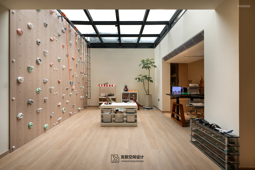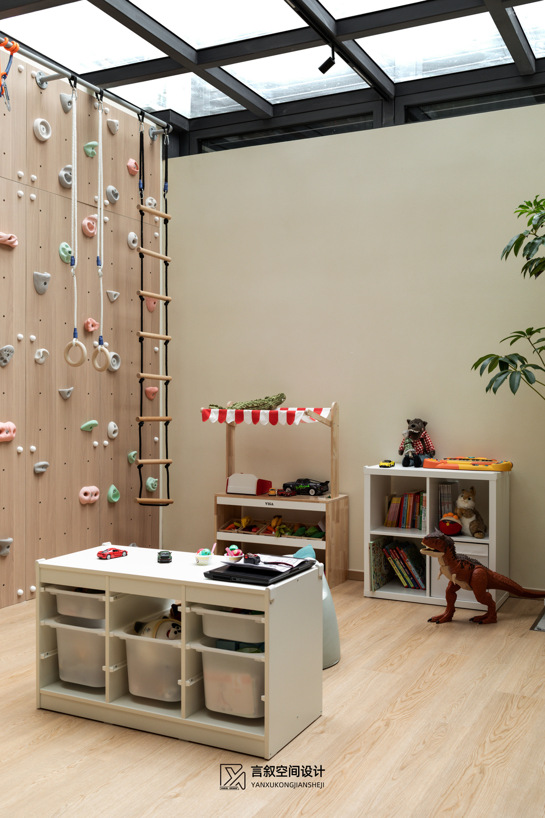 这个空间是业主家的个性之所,开放式的自由空间,攀岩墙、蹦床、迷你商店赛车场等等,当业主开始重视孩子的兴趣发展时,孩子的每一个爱好都成为可放大的舞台。这些爱好不仅丰富了业主一家的生活,也装点了这个空间。