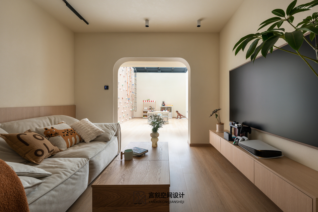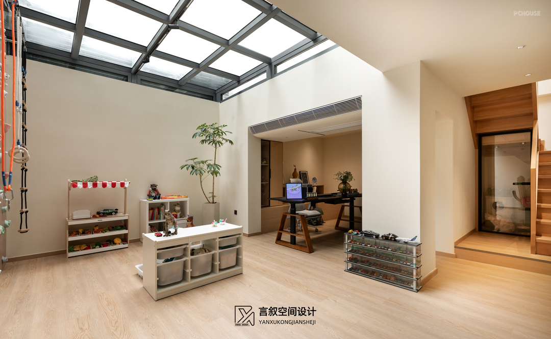 和书房一样,楼下的休闲室也只做了垭口设计,与孩子的娱乐区连通。业主工作累了在这打打游戏,孩子可以抬头就看见父母。