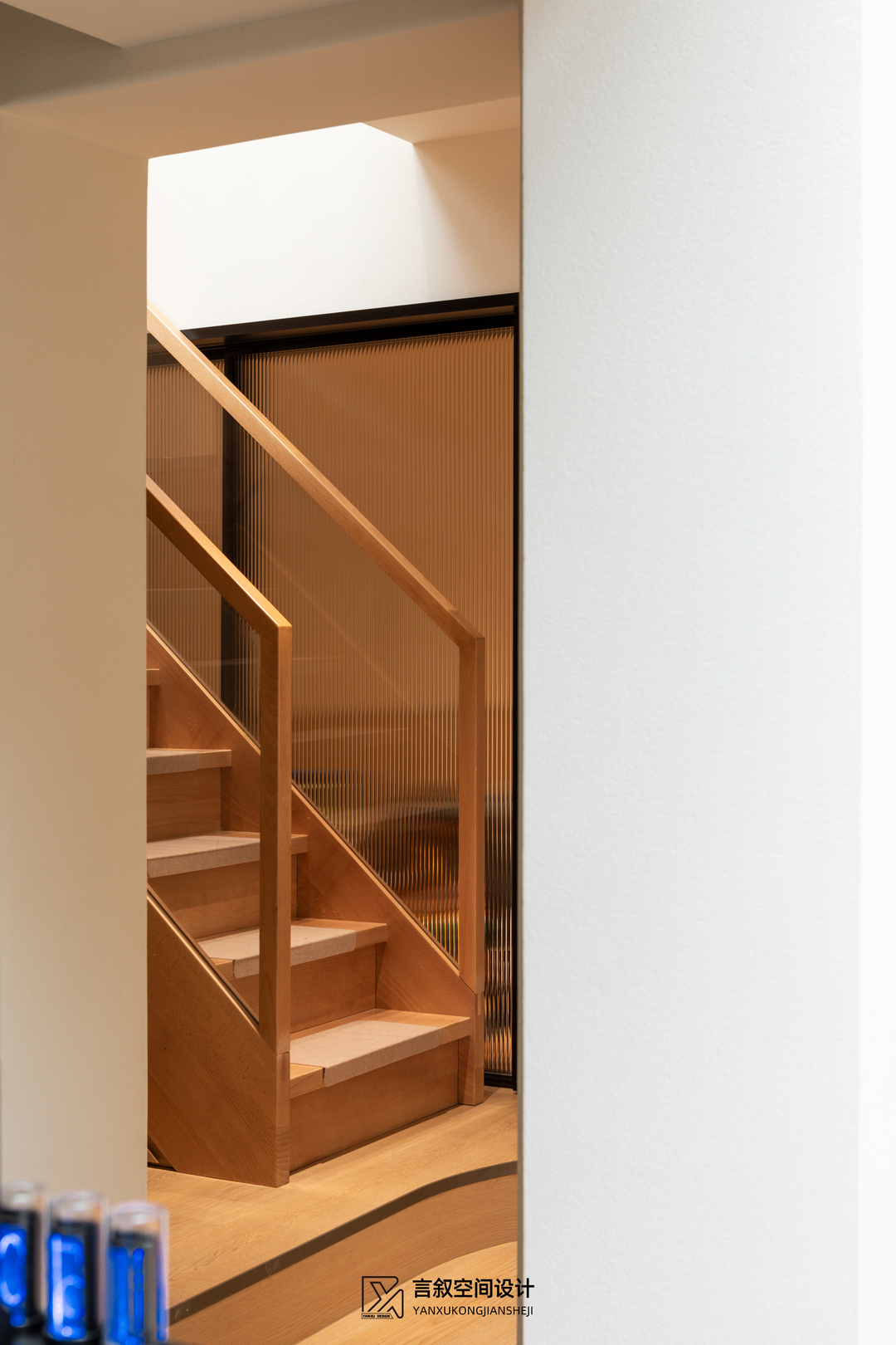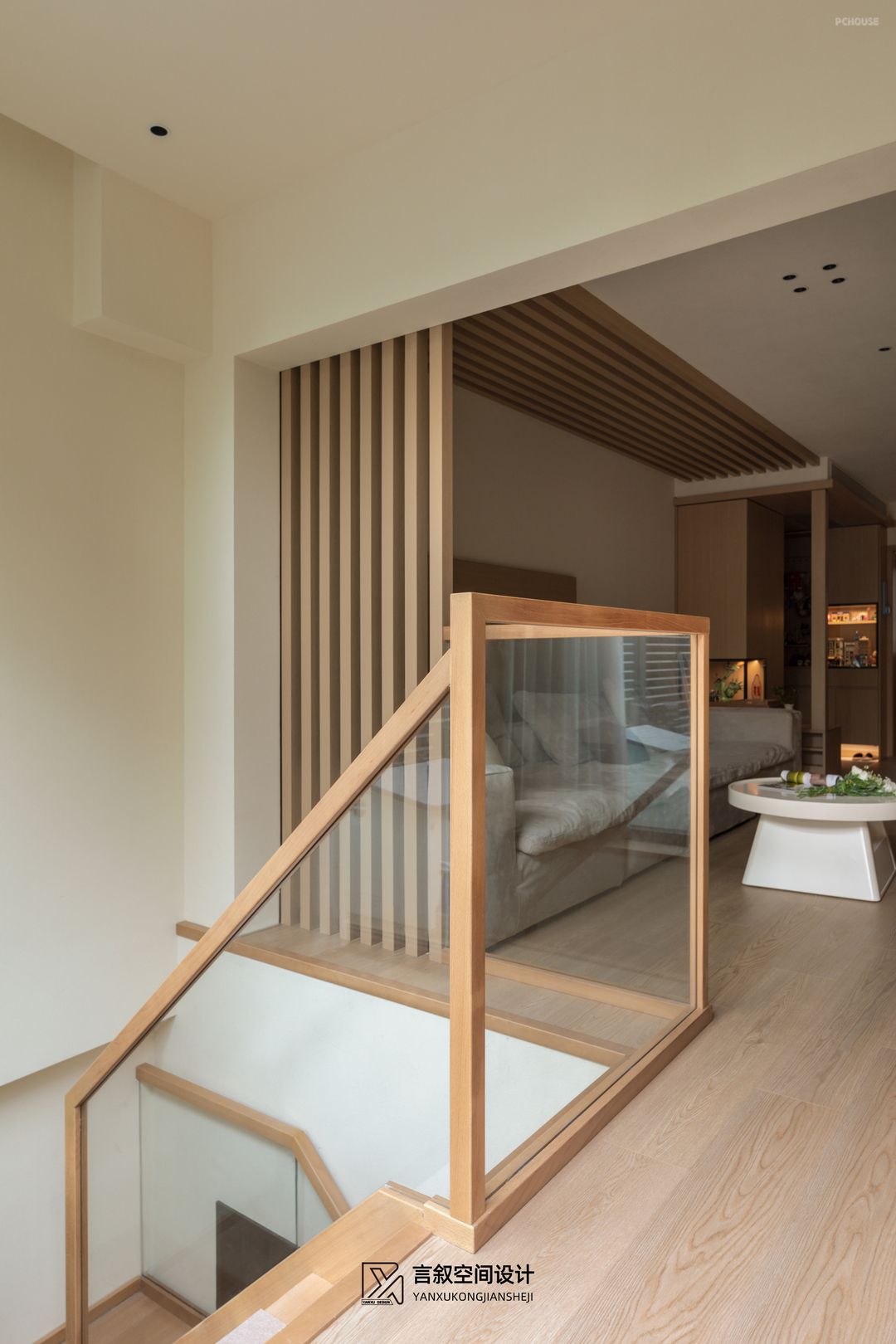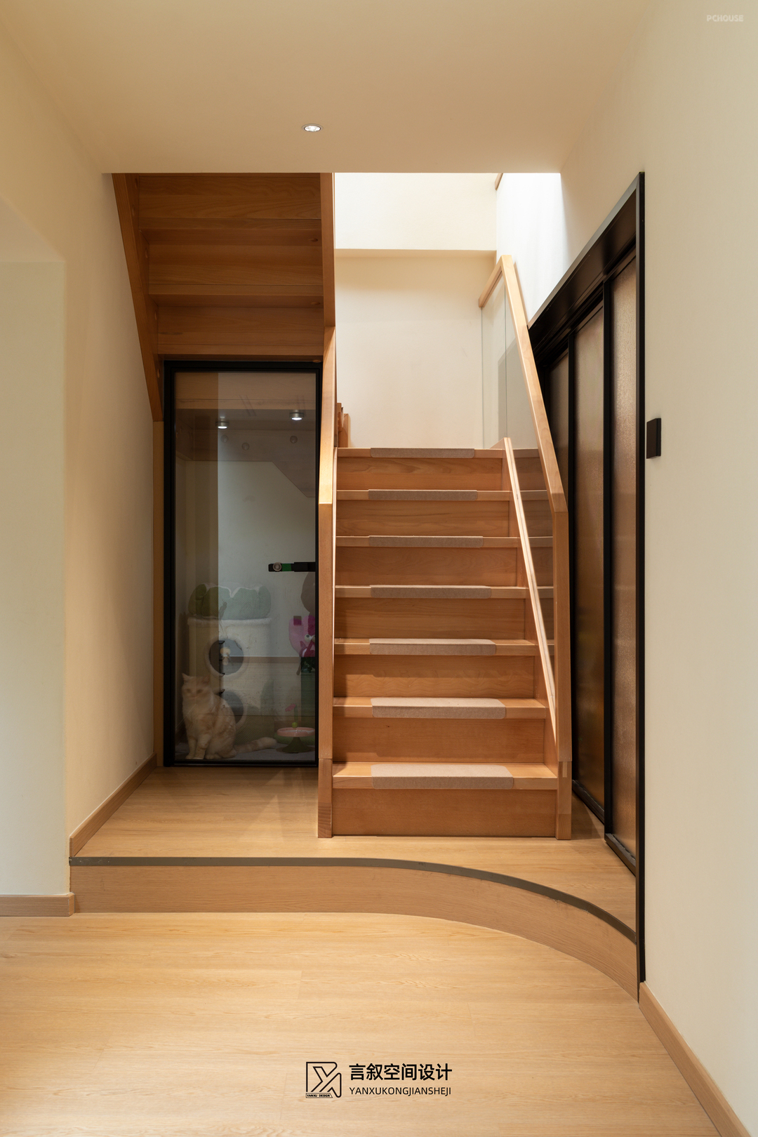 楼梯间位置没有做变动,但换新的全实木踏步和扶手搭配玻璃隔挡,通透自然,更加清秀。