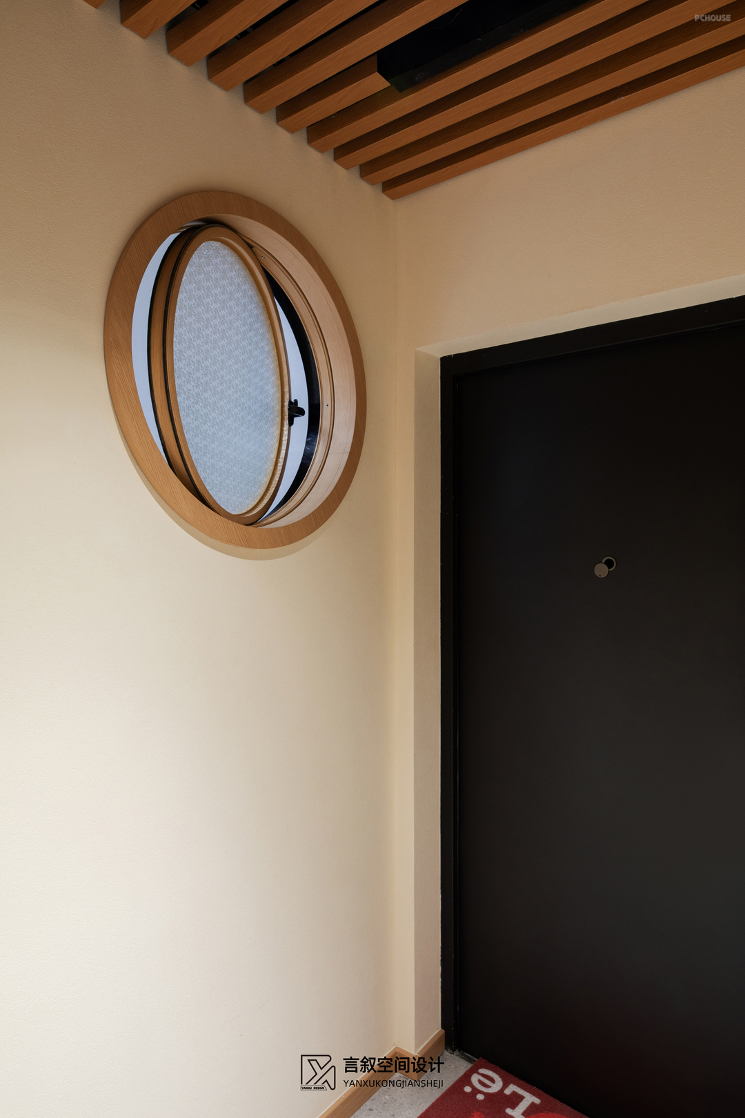 卫浴开气孔以圆窗的形式向走廊开放,定制窗框,实木结构与整体相得益彰。