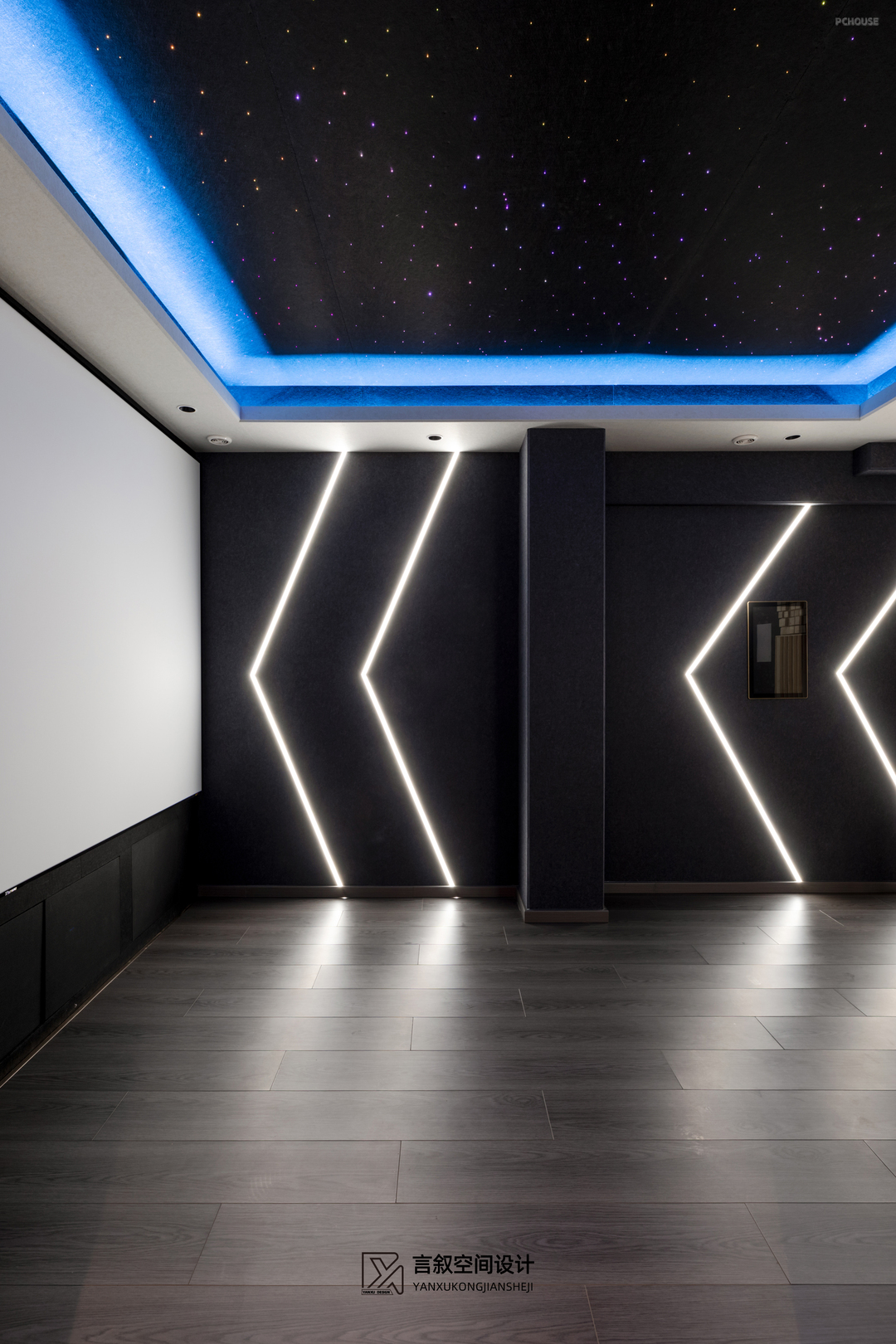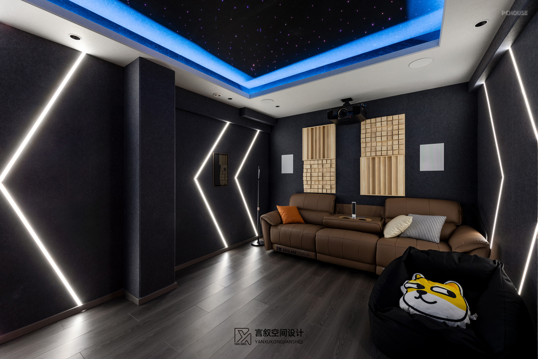 业主和太太都是有着浪漫主义情怀的时尚人儿,看电影K歌便是日常消遣,因此为了满足业主的需求一个带有星空顶的影音室诞生于此,足不出户便可玩遍娱乐场所。体验潇洒人生。