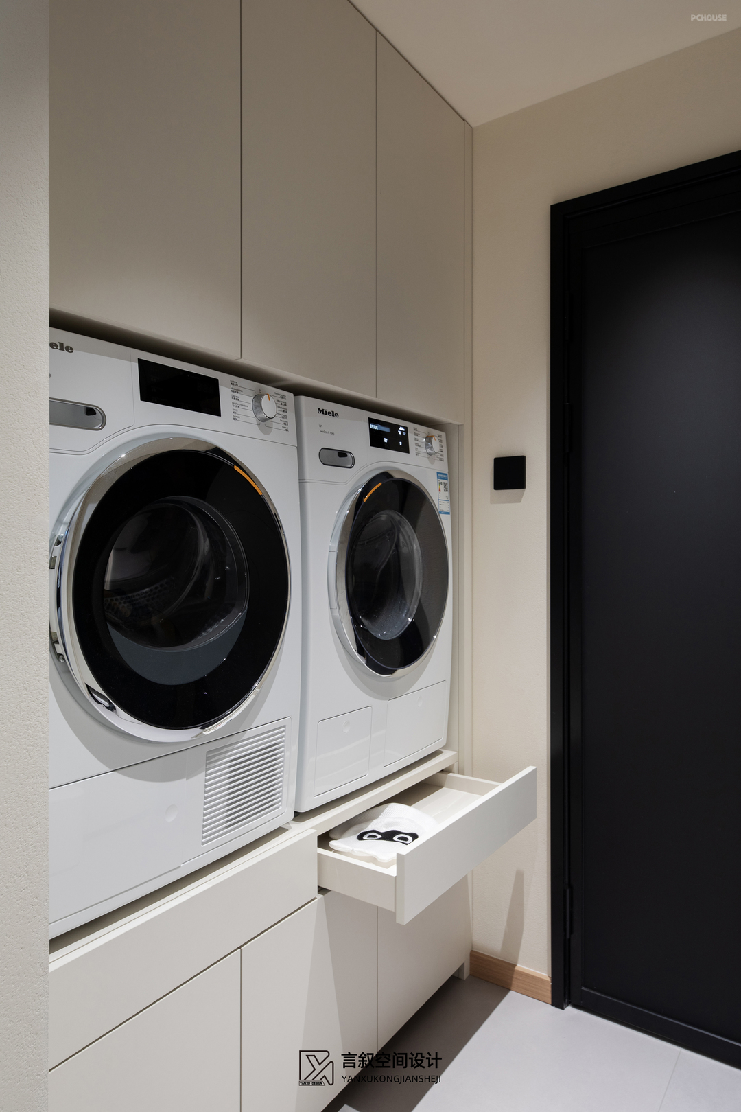 浴室外侧做的洗衣房,两进式空间,独立功能。特意做的下拉篮,解决业主随手存放的脏衣问题。