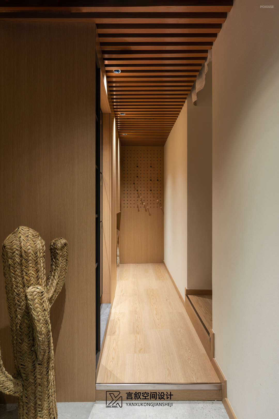 负一层车库入户大门是回家的第二入口,同样的落尘区设计,相同的实木格栅吊顶,与一层相互呼应且实用。