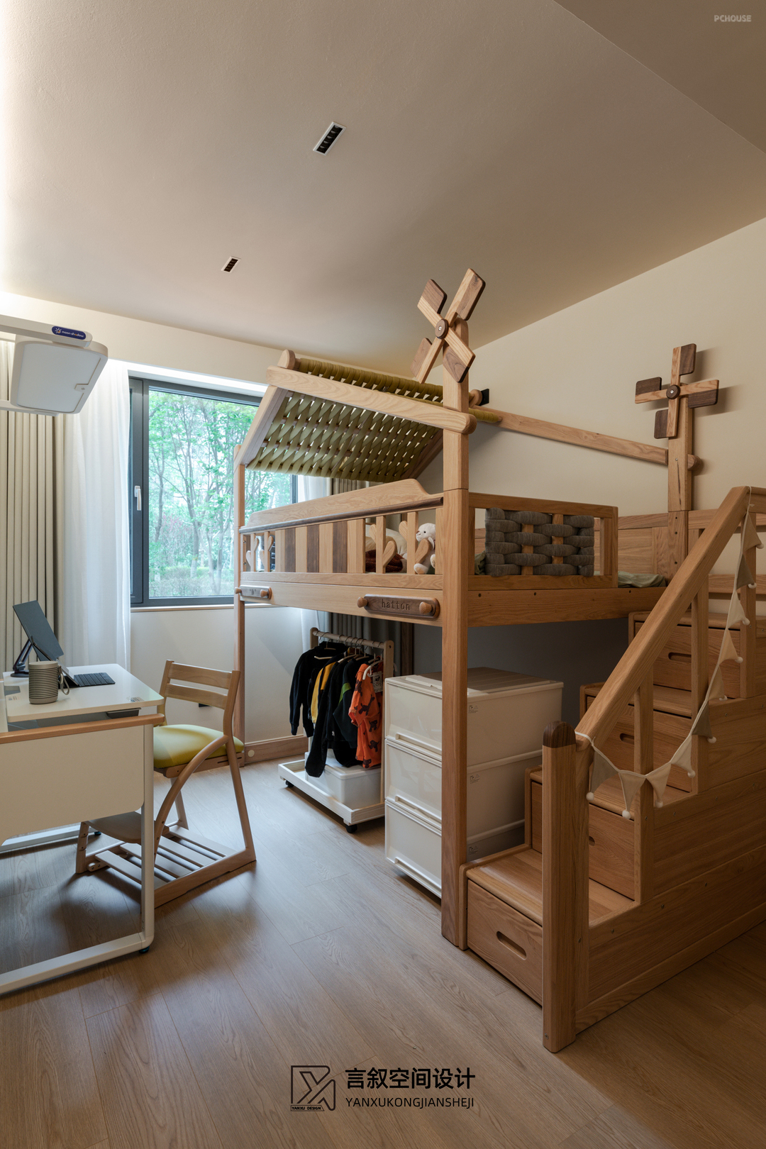纯实木的床柜、桌椅,环保考虑是首位。另外在这个空间里, 我们预留了空间的自由,让布局和家具可以跟着孩子一起成长、变化。