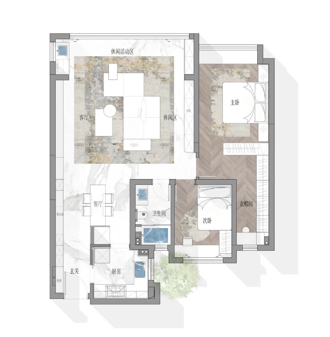 ●布局设计:将主卫改为衣帽间,与卧室之间设计L型柜体,收纳力最强。