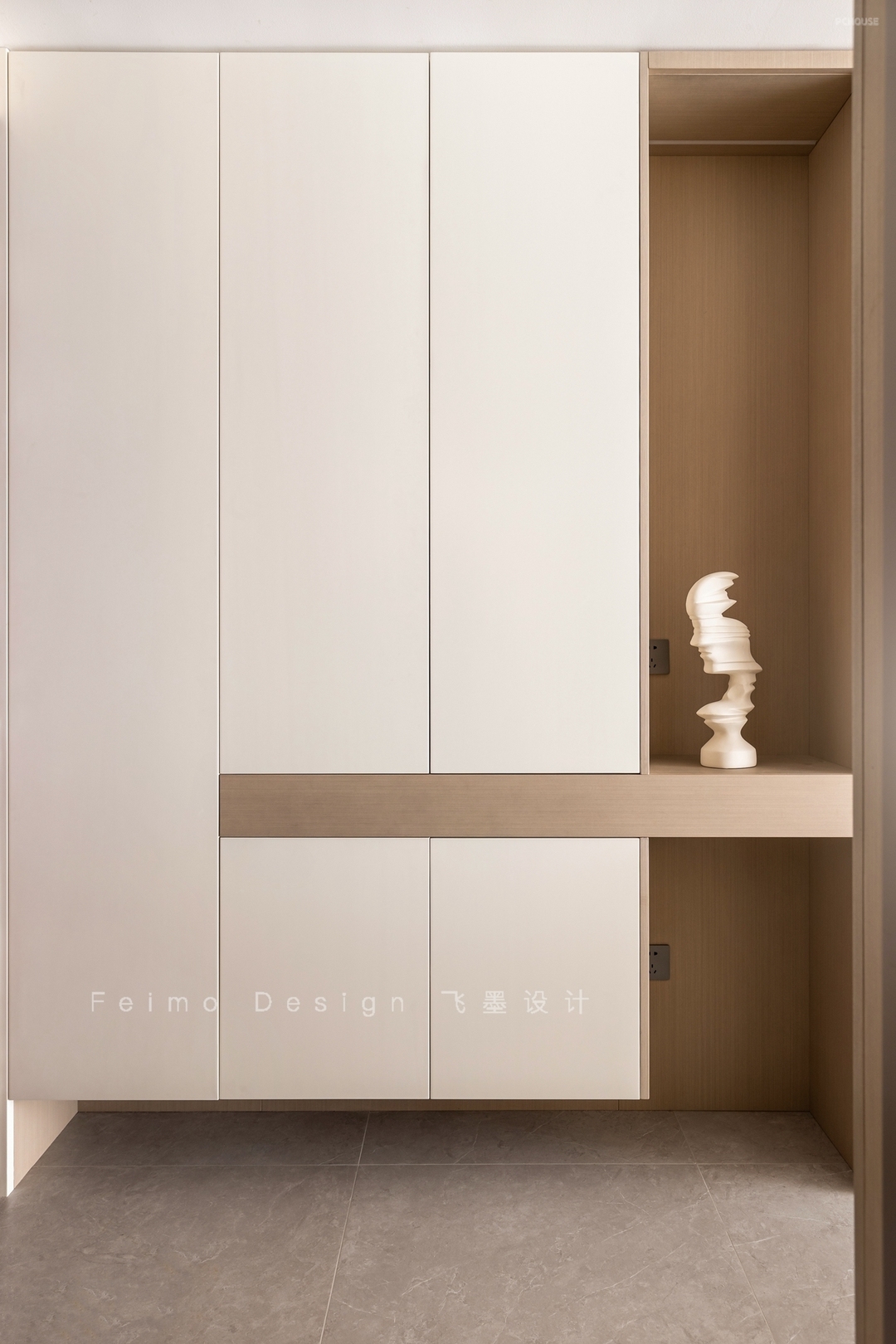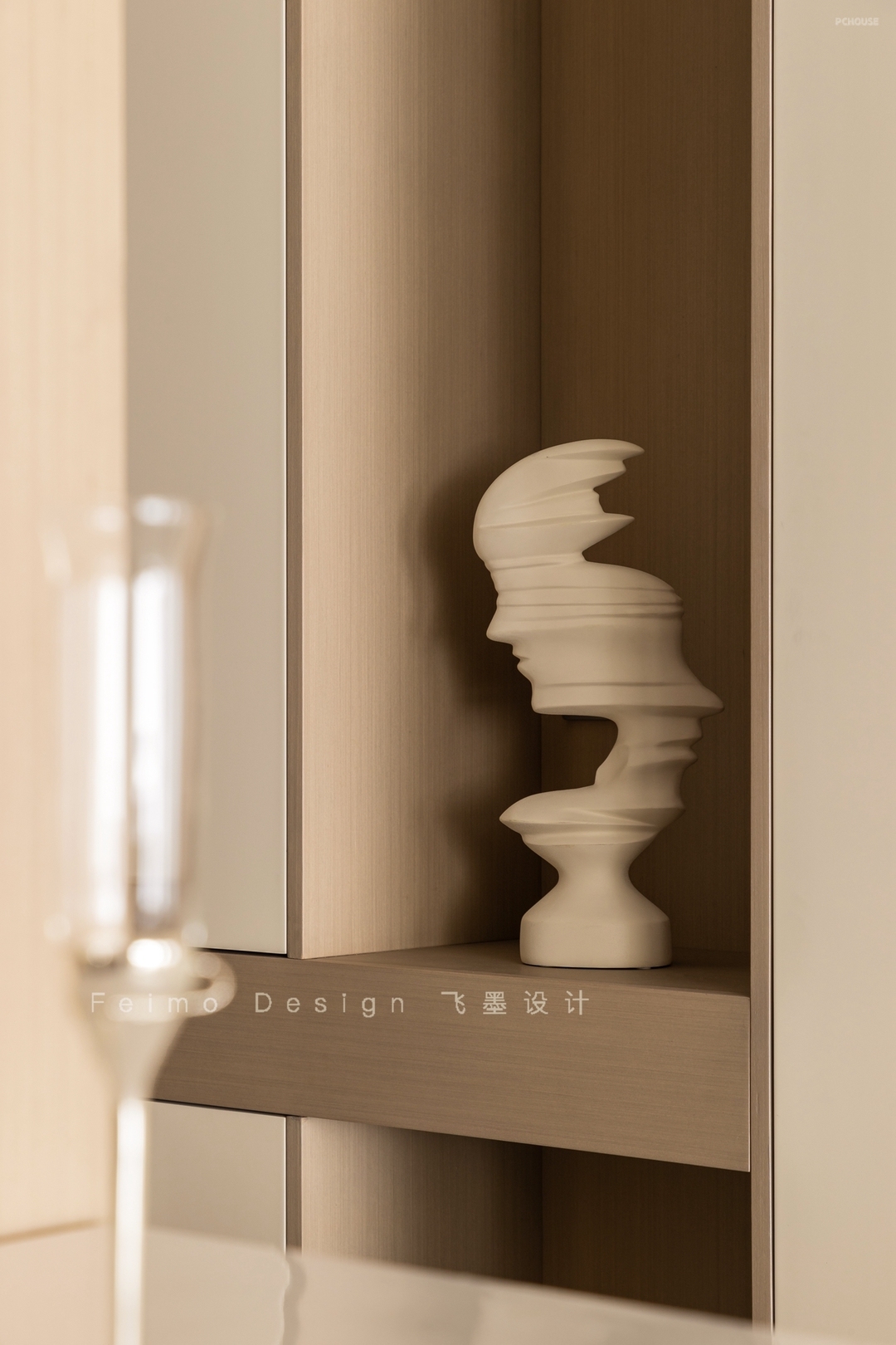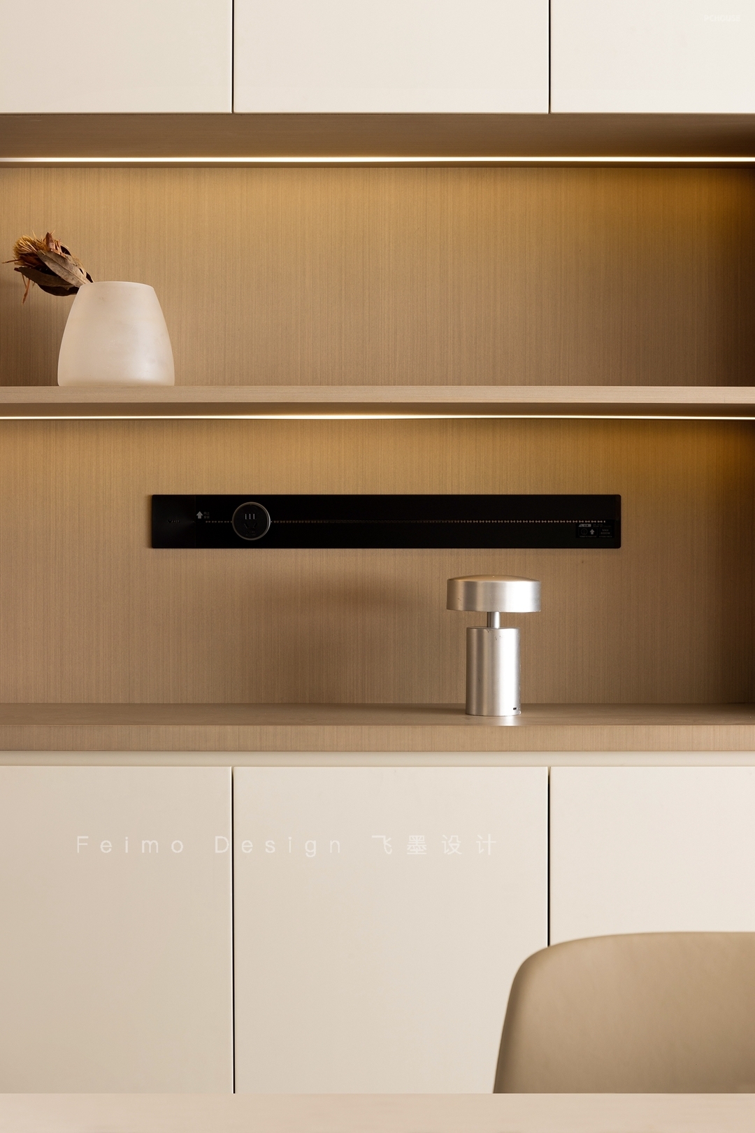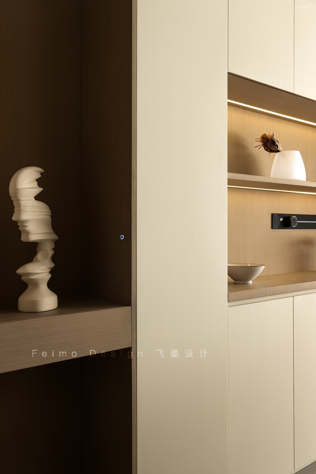 ③空白墙面选择木饰面板装饰,氛围自然质朴。