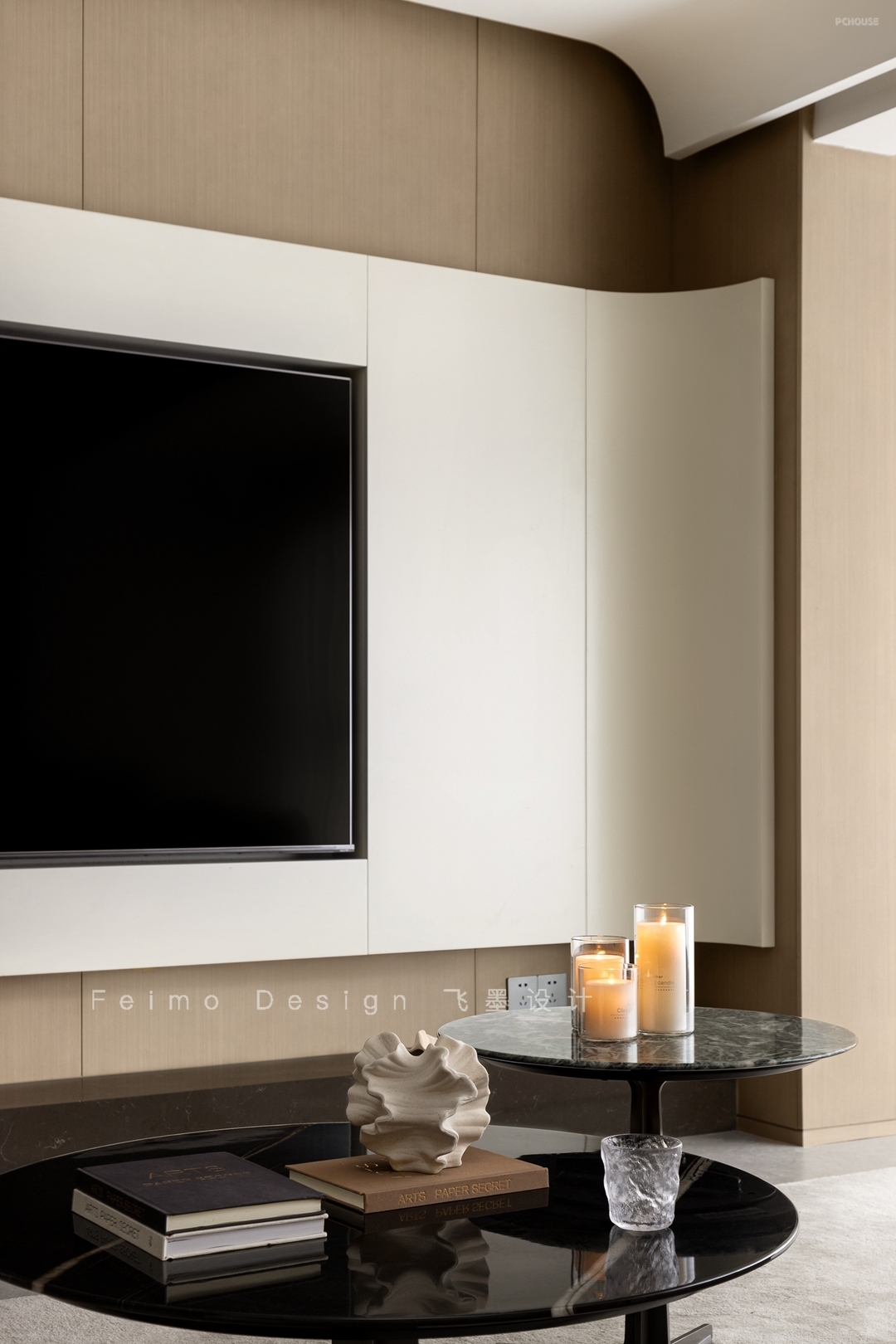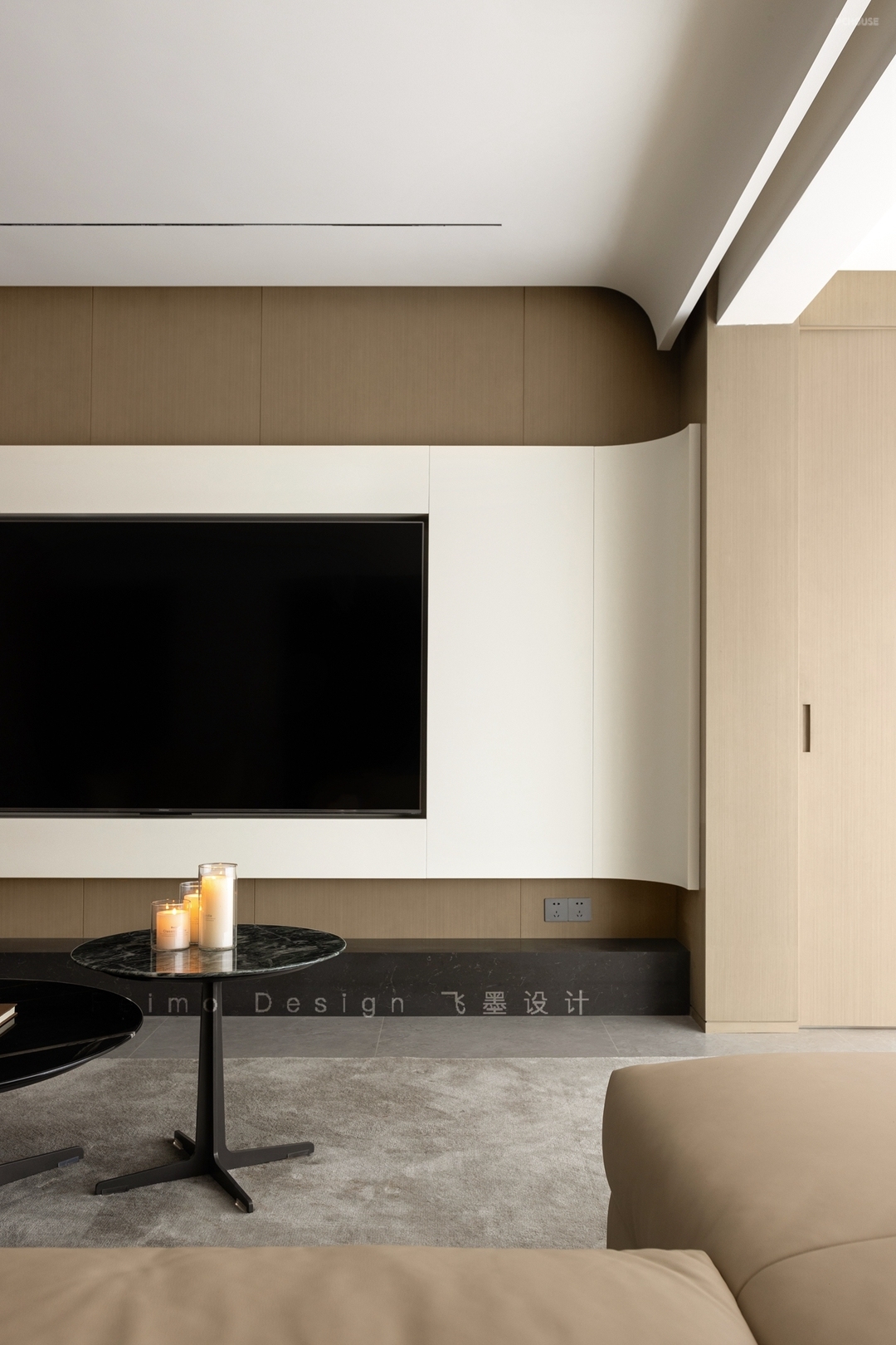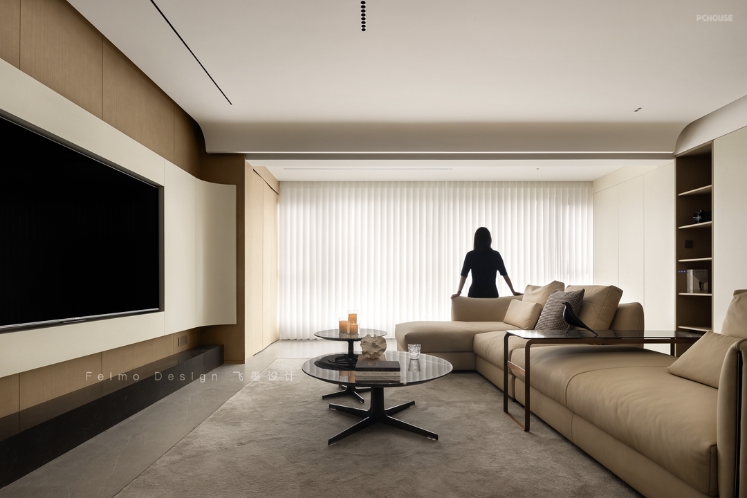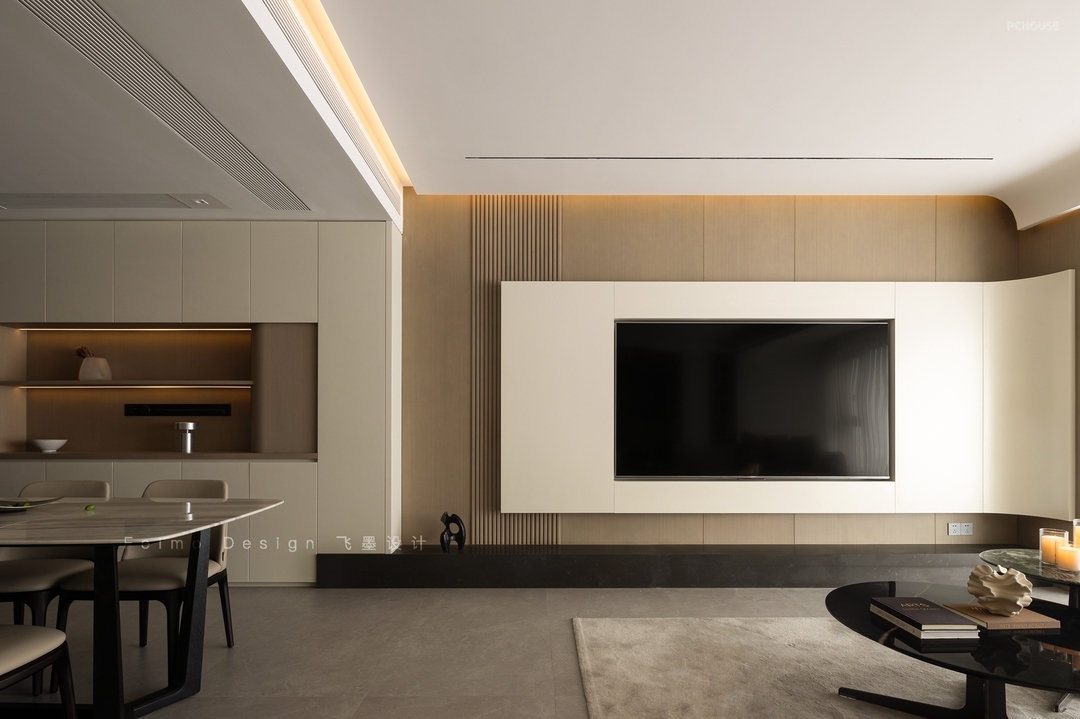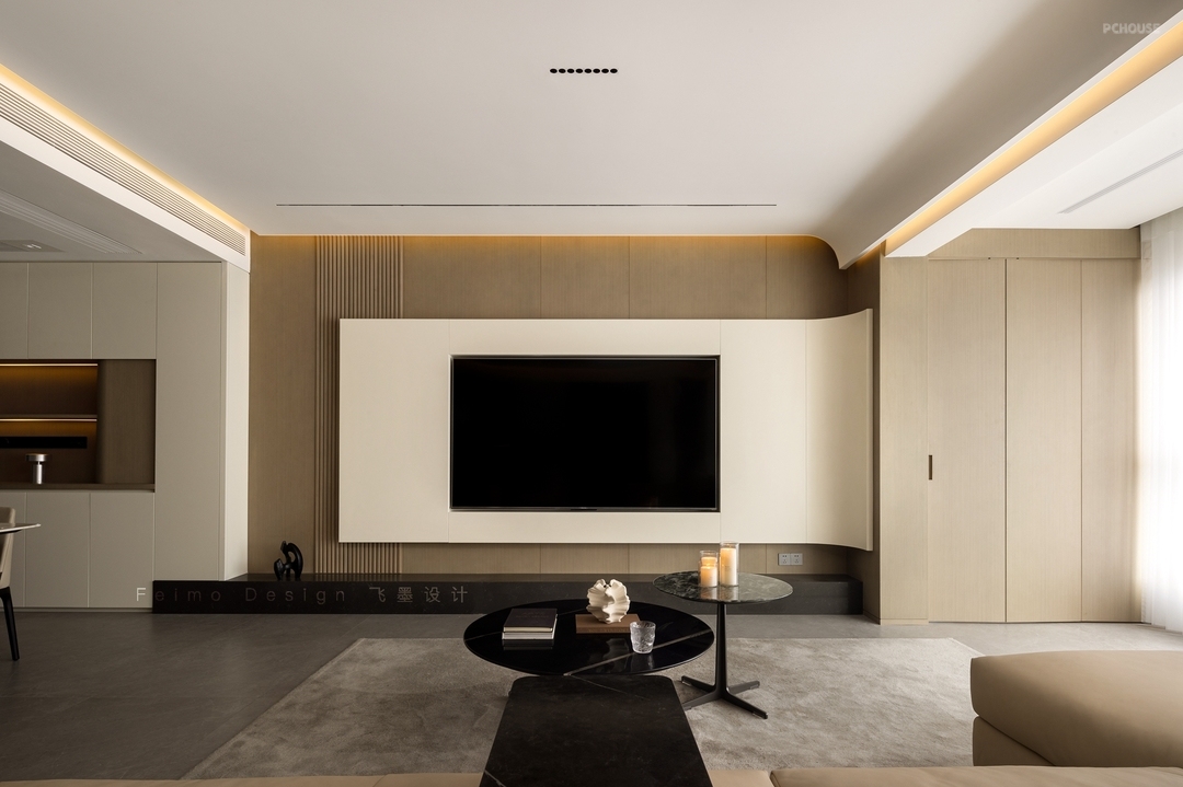 ③电视墙选择木饰面板、石材地台、曲面造型结合,颜值更高。