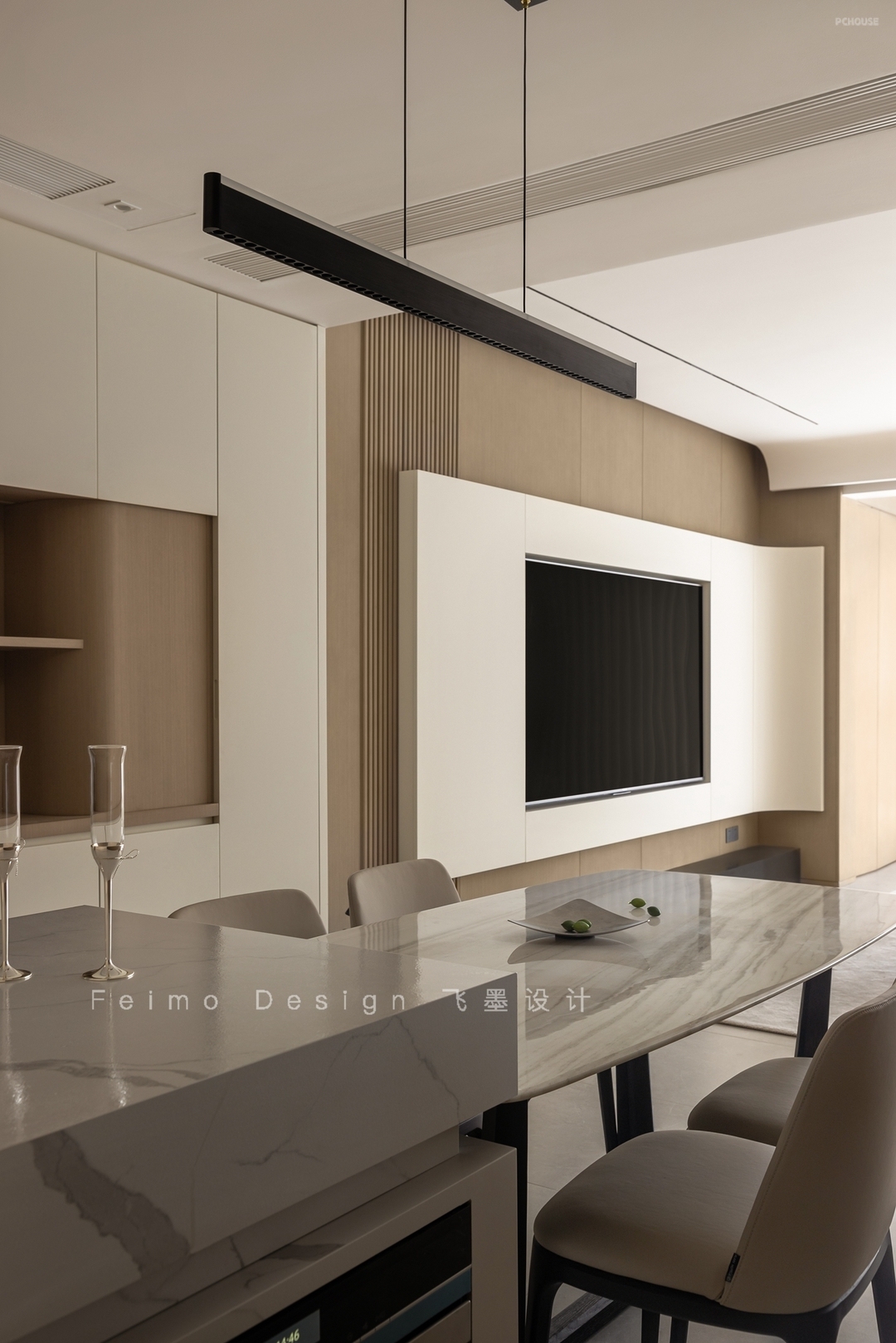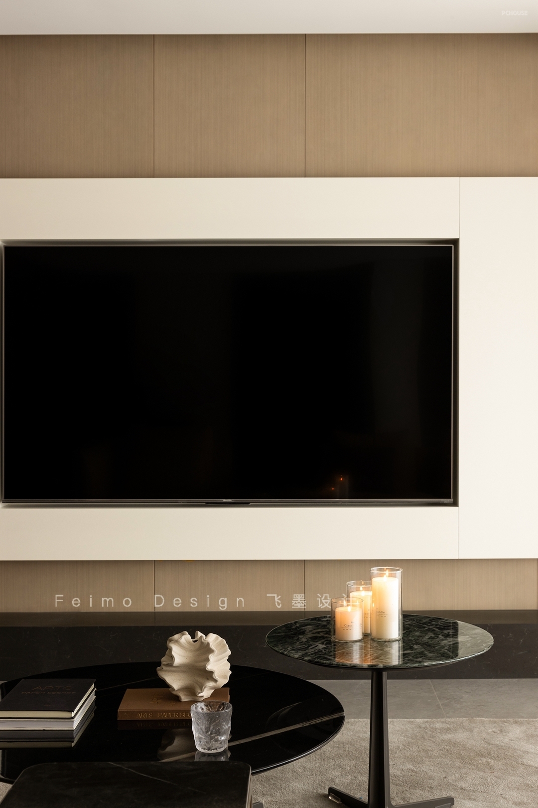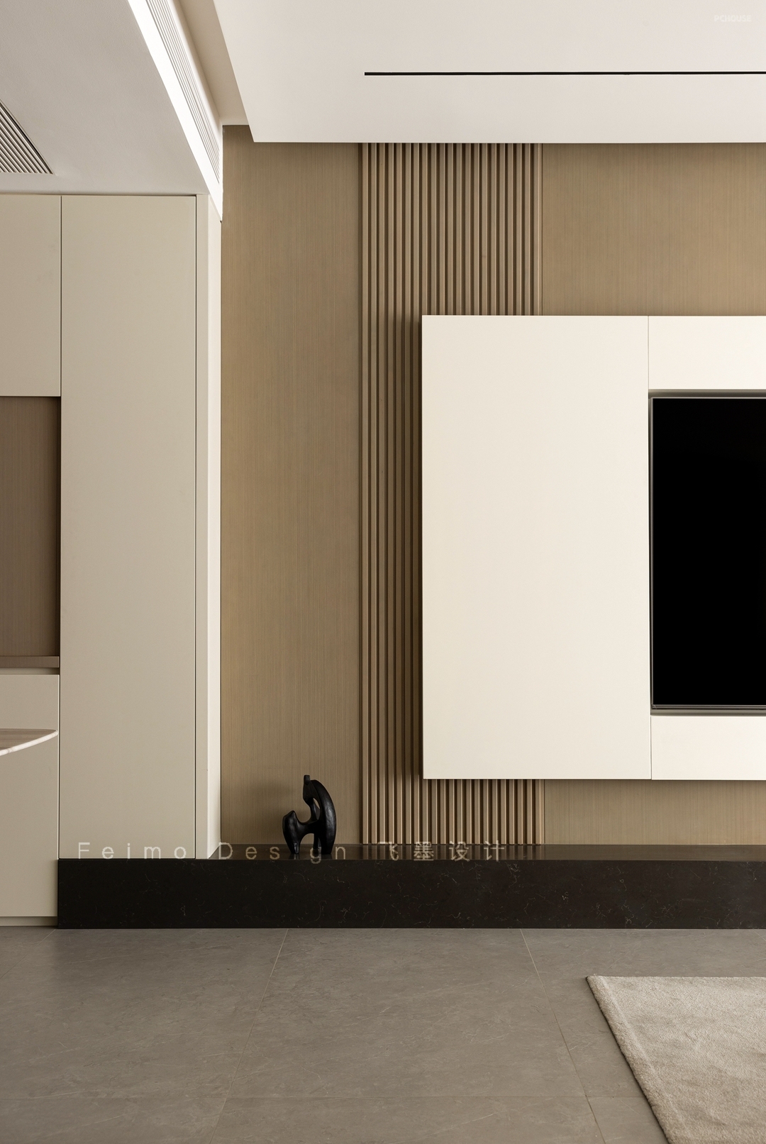 ③电视墙选择木饰面板、石材地台、曲面造型结合,颜值更高。
