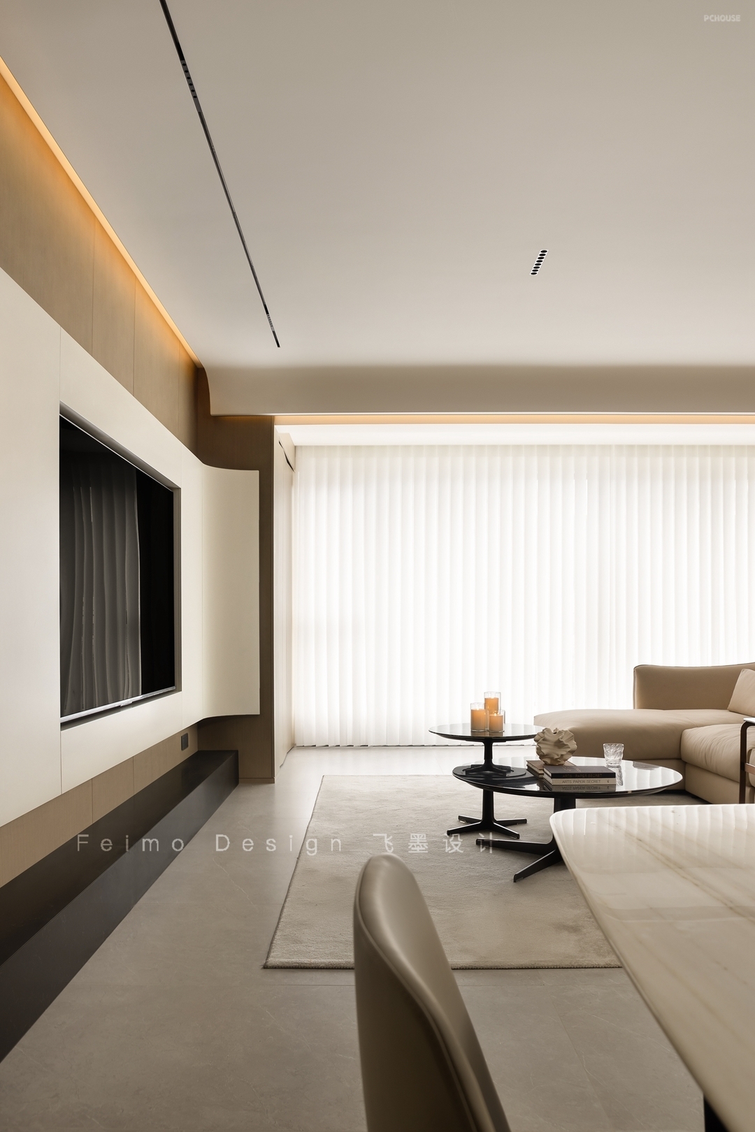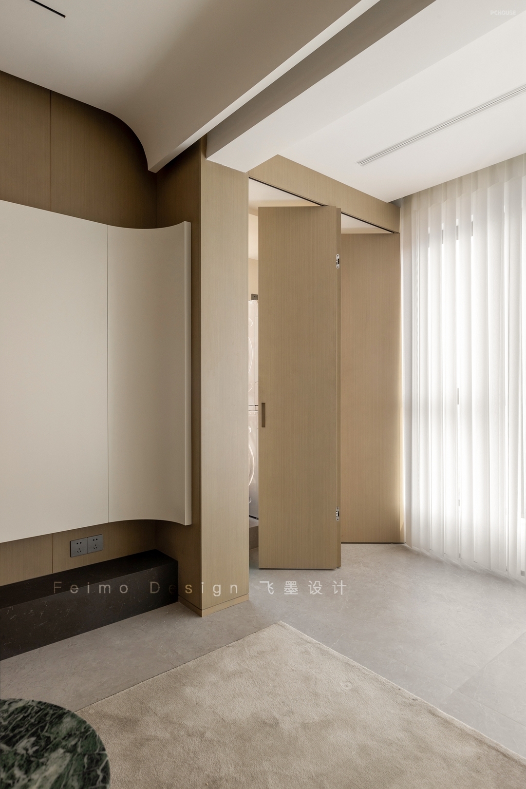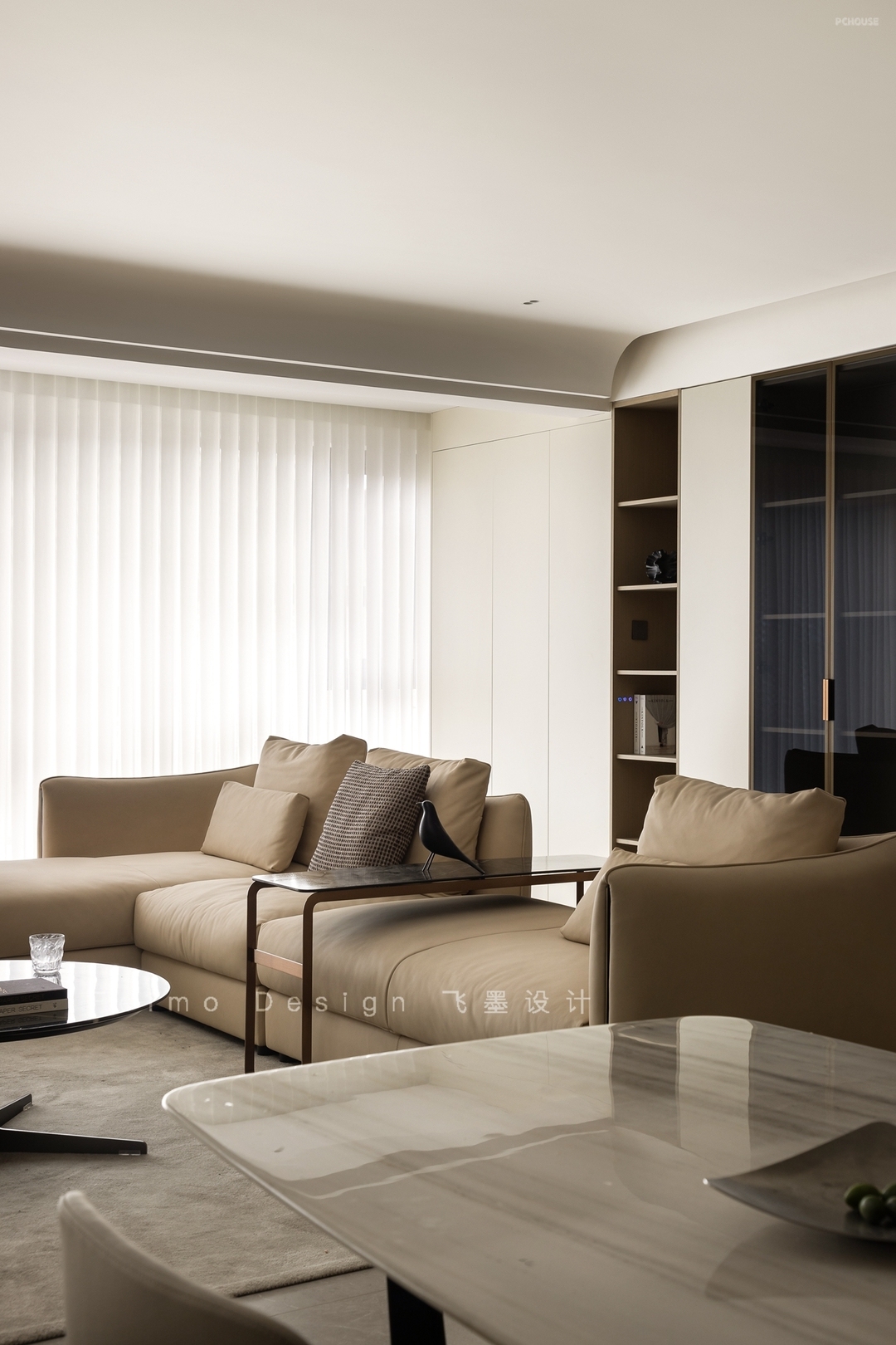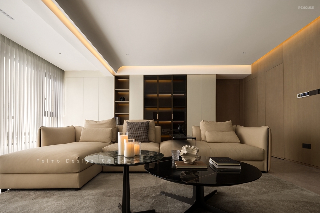 ④顶面设计无主灯,吊顶与横梁用弧形过渡,线条自然流畅。