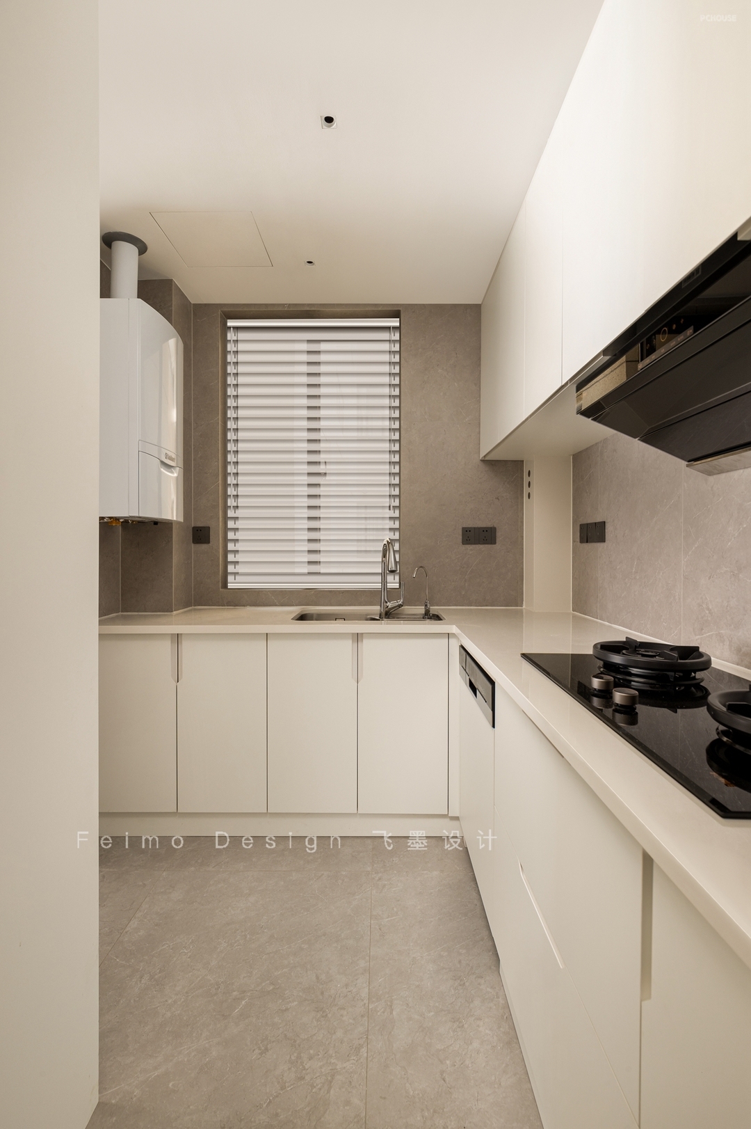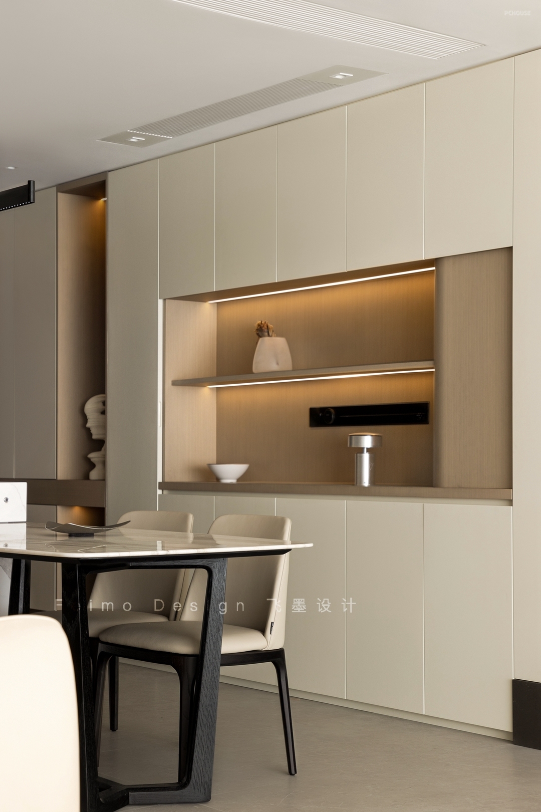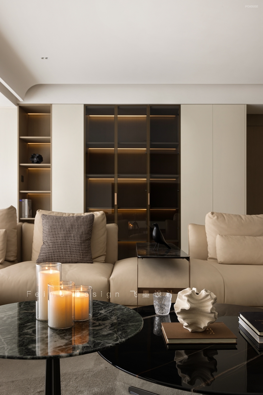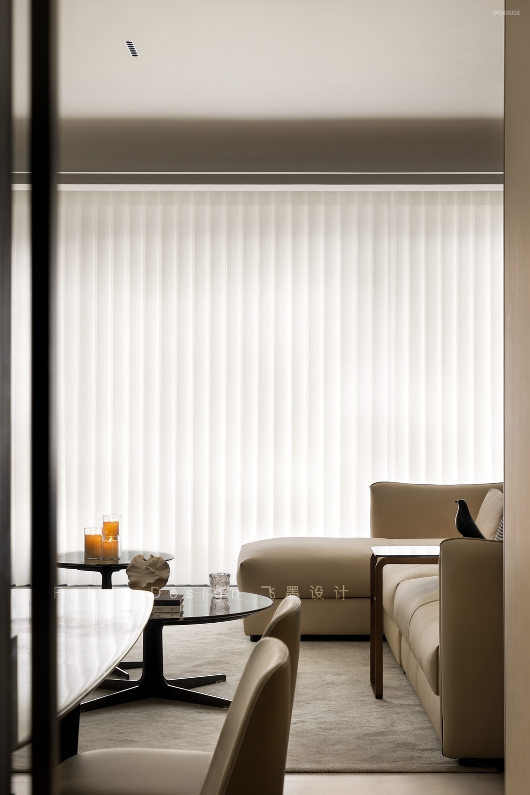 ④顶面设计无主灯,吊顶与横梁用弧形过渡,线条自然流畅。