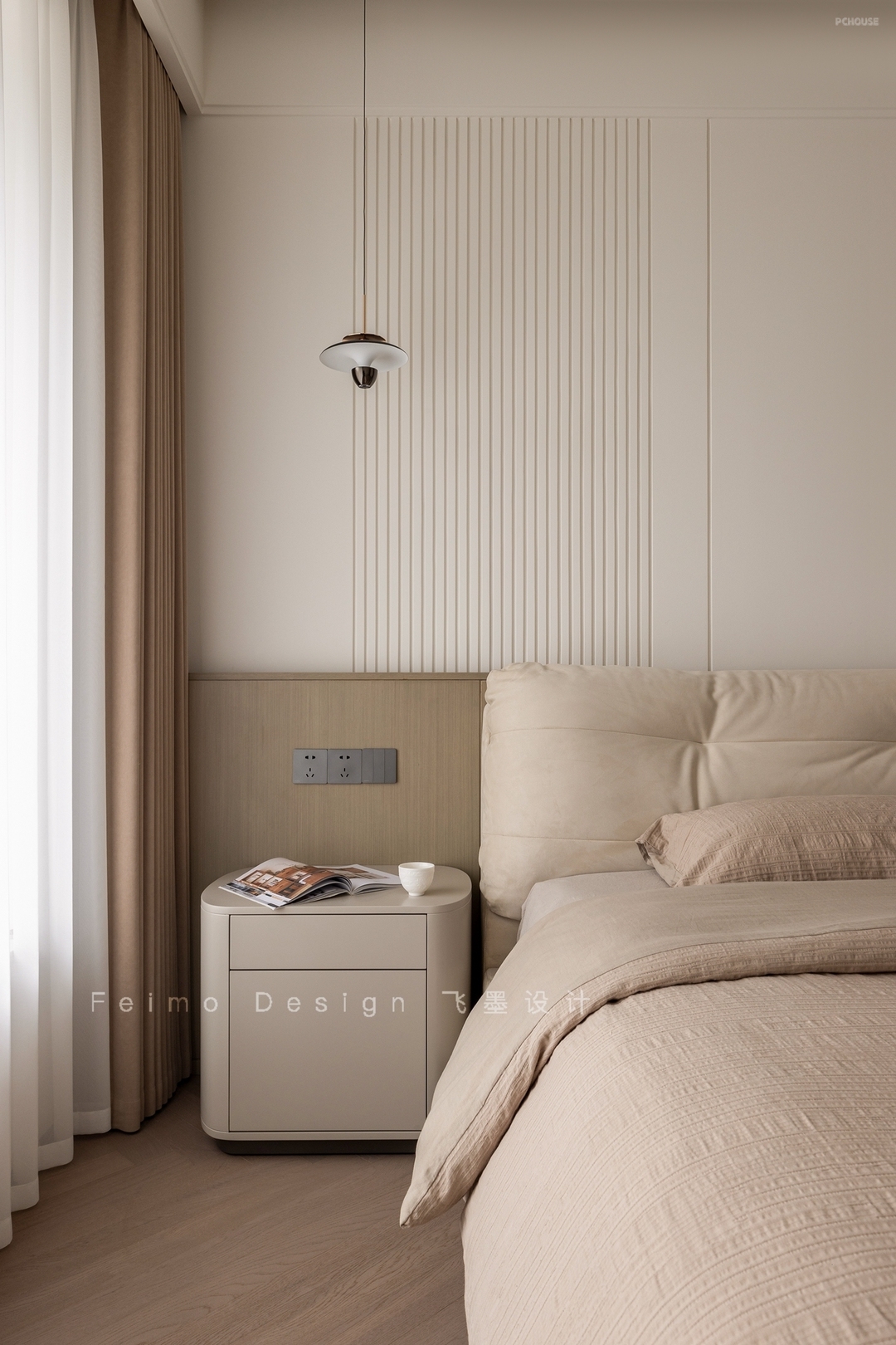 ①床头背景墙选择用护墙板墙裙,搭配抽缝工艺,颜值超高。